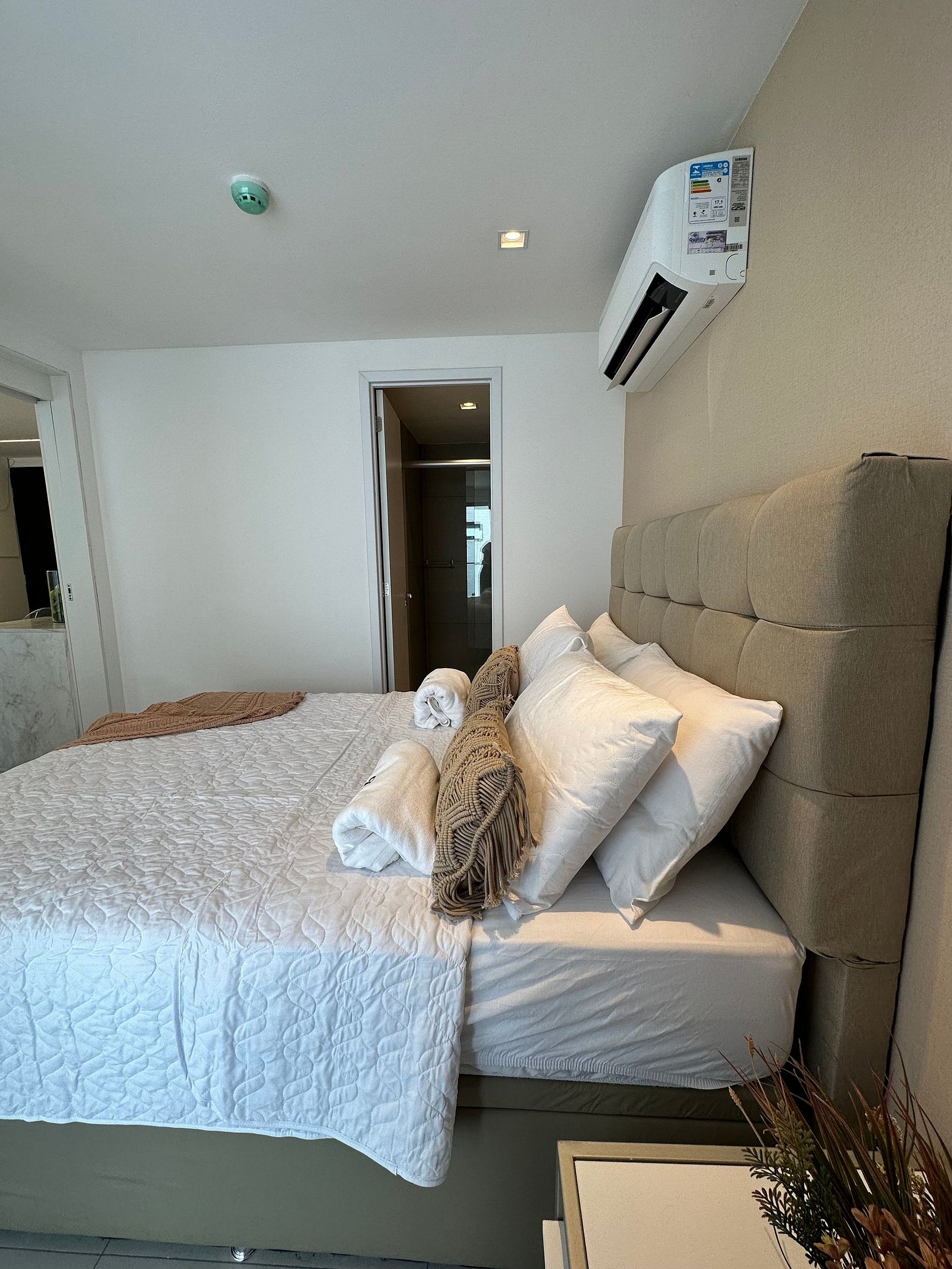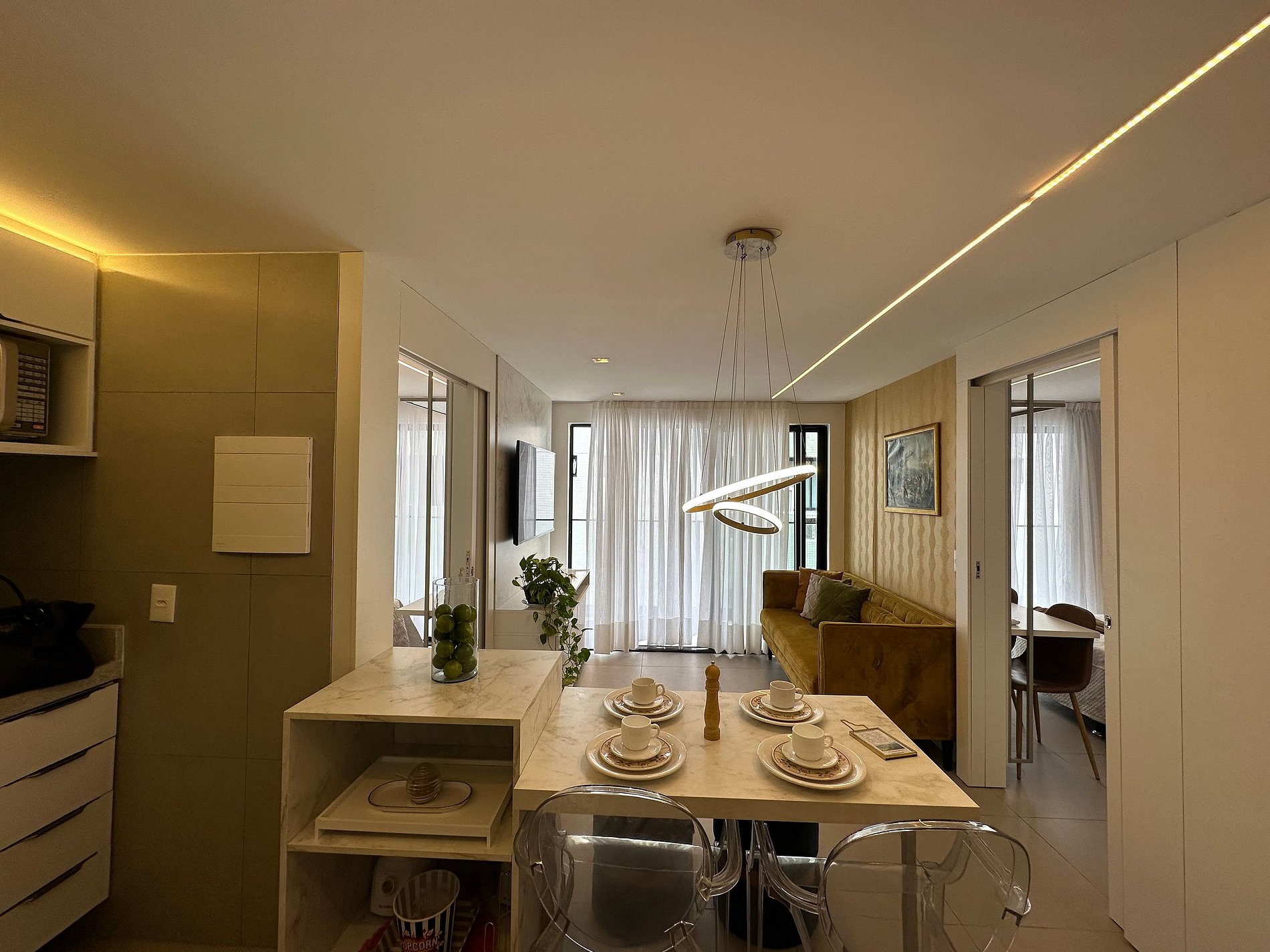 O apartamento conta com 2 quartos climatizados, ambos equipados com camas confortáveis, enxoval completo, armários e iluminação suave. A sala é integrada à cozinha, oferecendo um ambiente funcional e aconchegante — perfeito tanto para relaxar quanto para momentos à mesa.