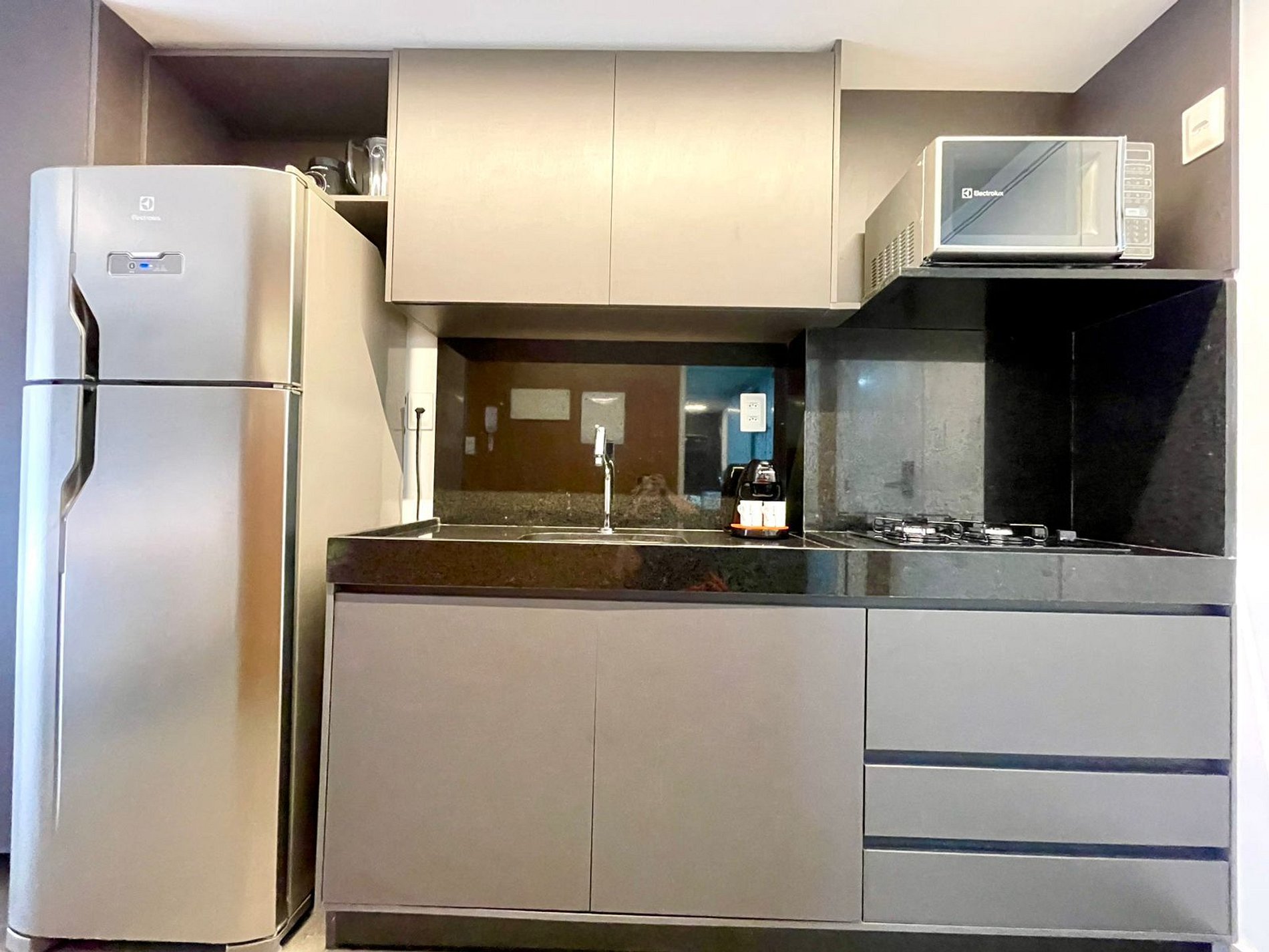 O apartamento é completo, com cozinha equipada (eletrodomésticos e utensílios) para preparar suas refeições com conforto.