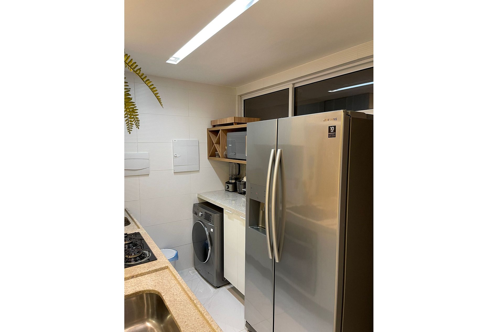 A cozinha é funcional e moderna, o apartamento dispõe também de máquina lava e seca.