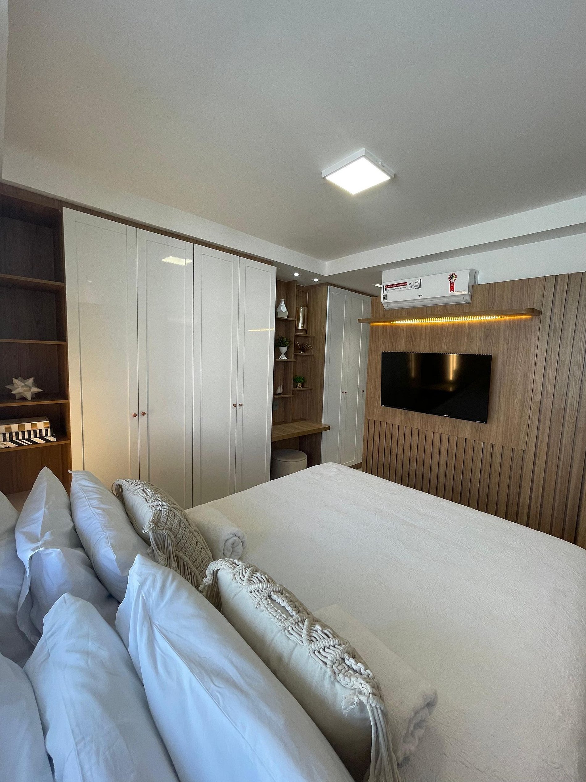 A suíte principal possui cama queen, TV e armários amplos para maior comodidade.