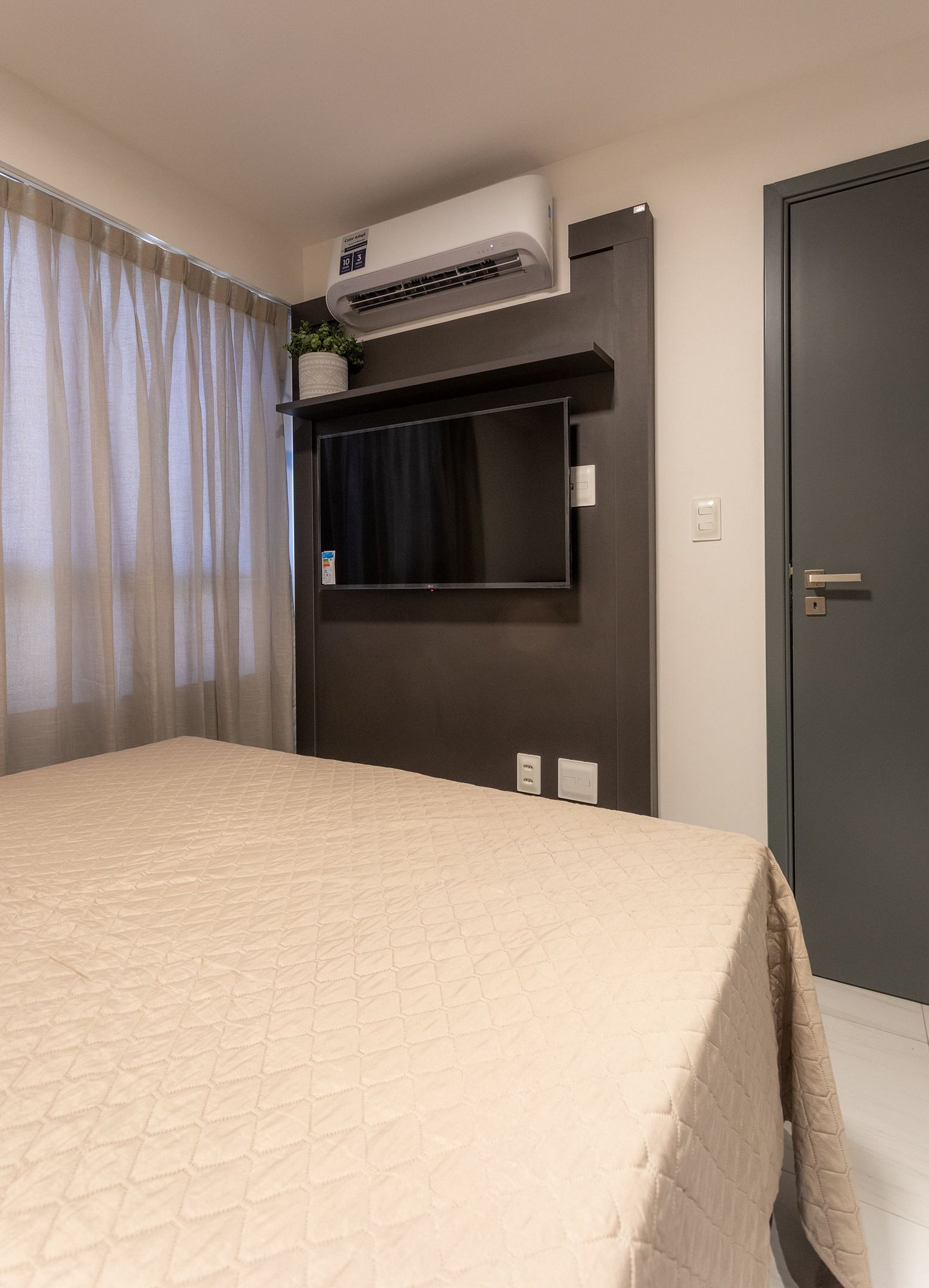 O apartamento possuie 2 quartos, sendo uma suíte com cama queen, ar condicionado e um segundo quarto com cama de casal e ar condicionado, banheiro social, cozinha completa, sala de estar com sofá cama, TV Smart.