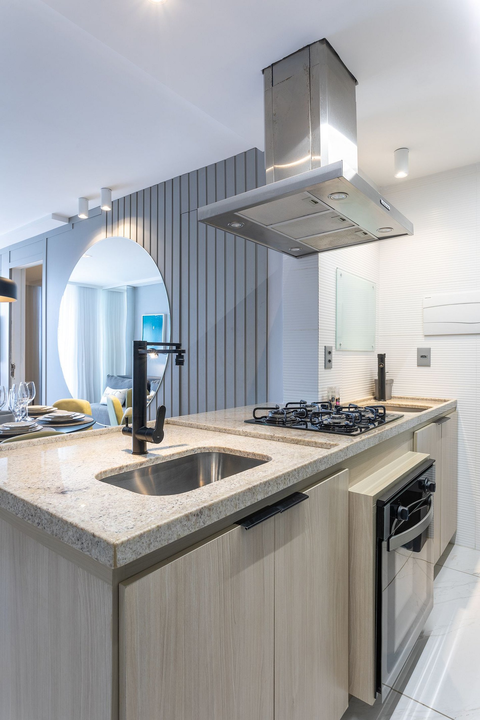 • Bancada funcional que conecta cozinha e sala, otimizando o ambiente