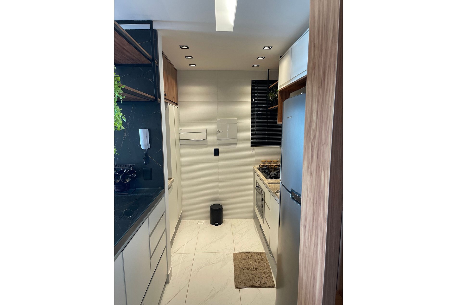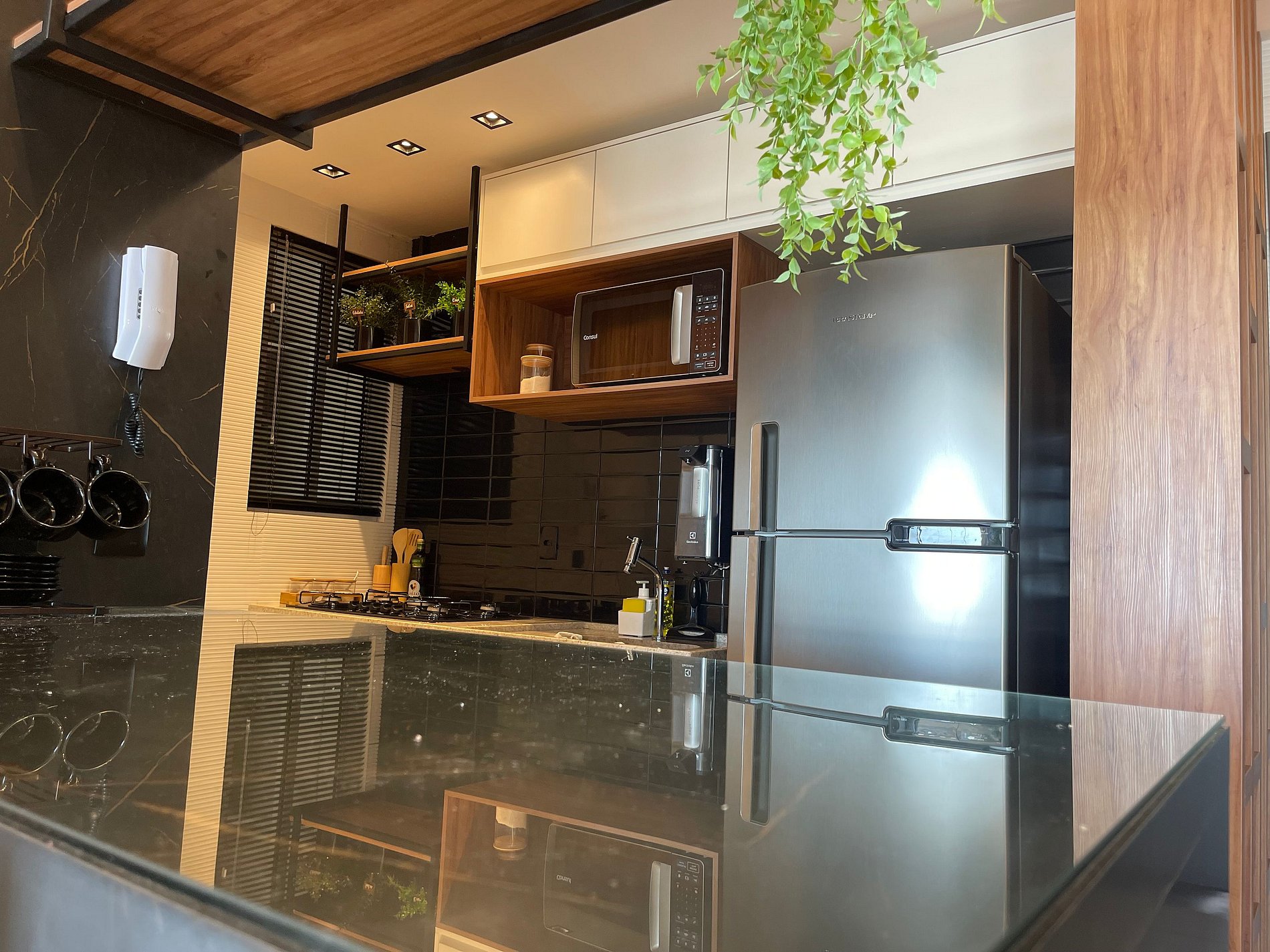 • Cozinha Integrada, Funcional, compacta, moderna e equipada com tudo o que você precisa: geladeira, fogão, forno elétrico e micro-ondas. Além de acessórios básicos para uma estadia completa.