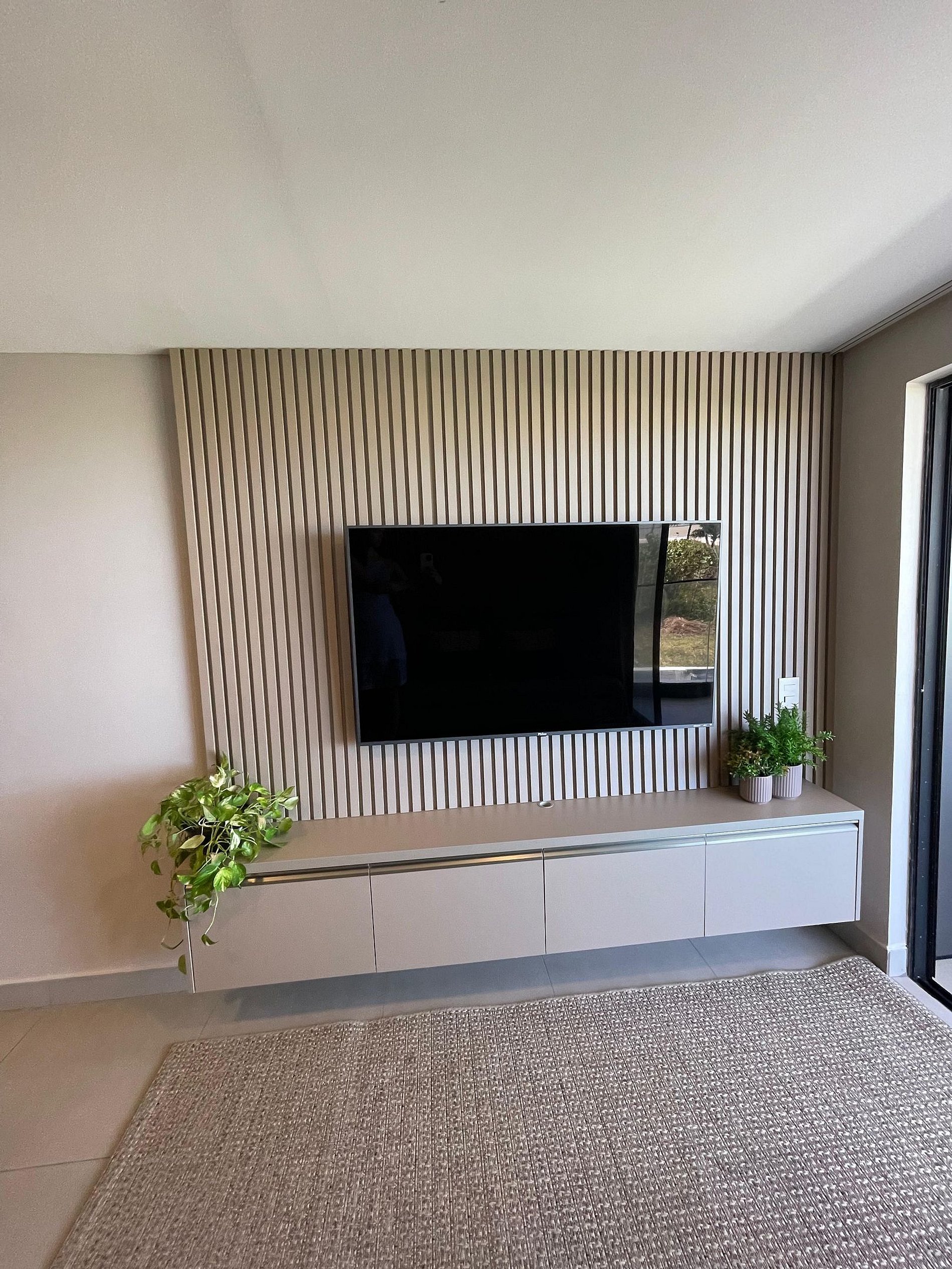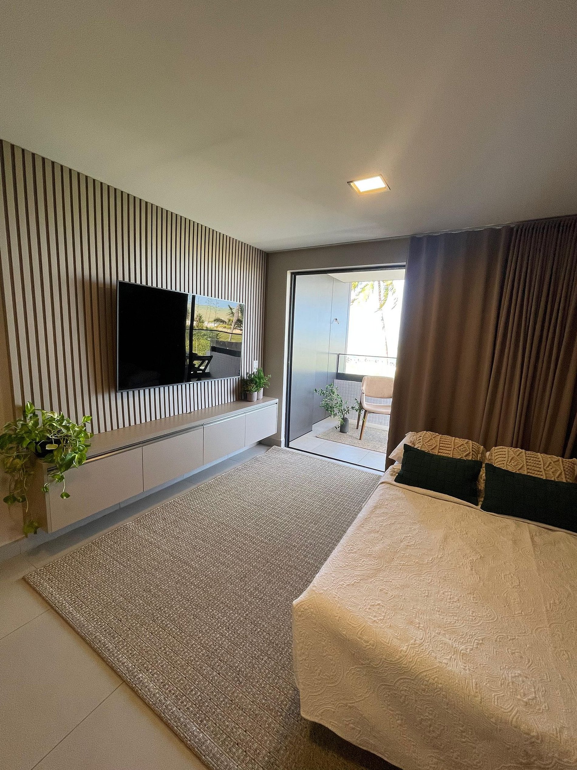 • Sala integrada com sofá-cama, TV smart e decoração aconchegante