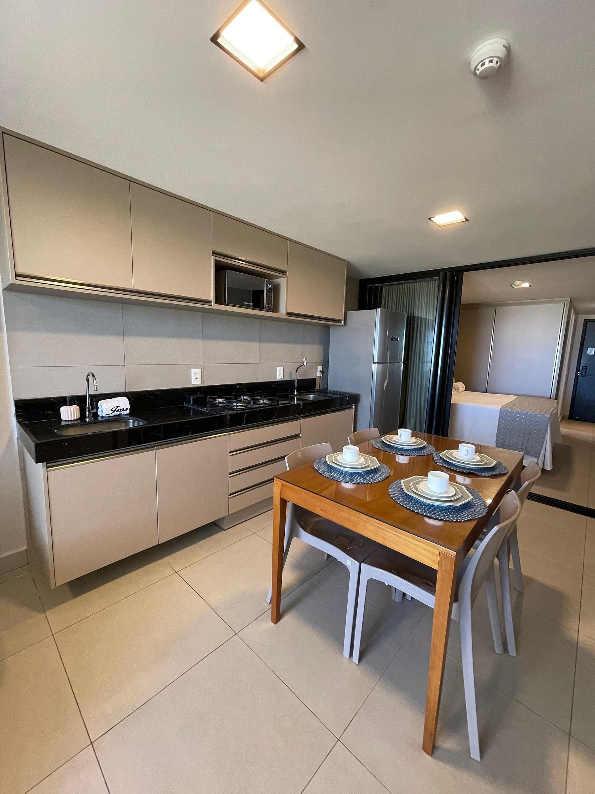 • Cozinha equipada com geladeira, micro-ondas, cooktop e utensílios