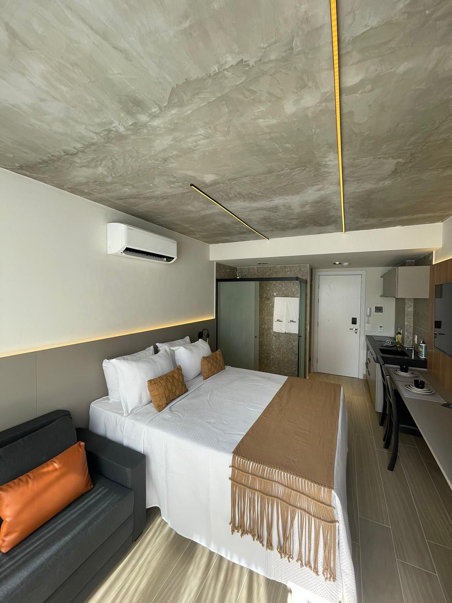 - O flat é super funcional com uma cama queen e sofá cama, mesa de apoio..