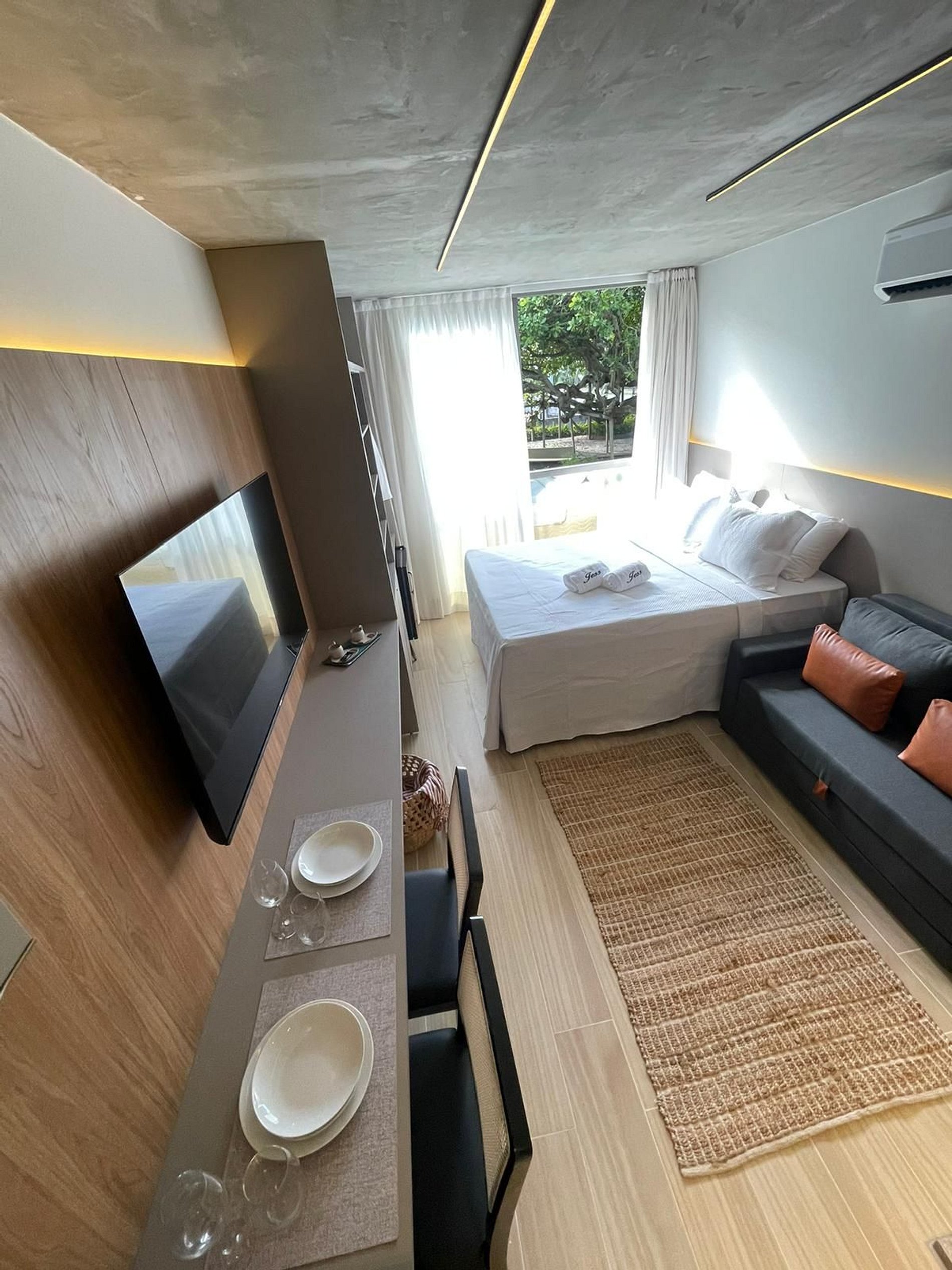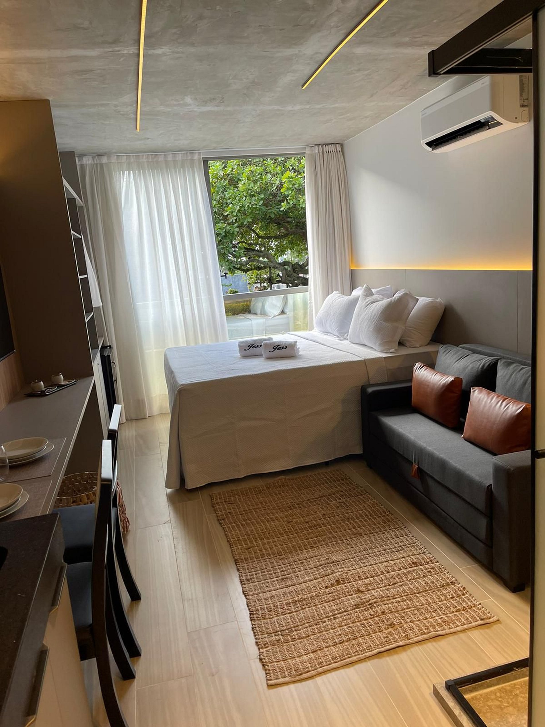 - O flat é super funcional com uma cama queen e sofá cama, mesa de apoio..