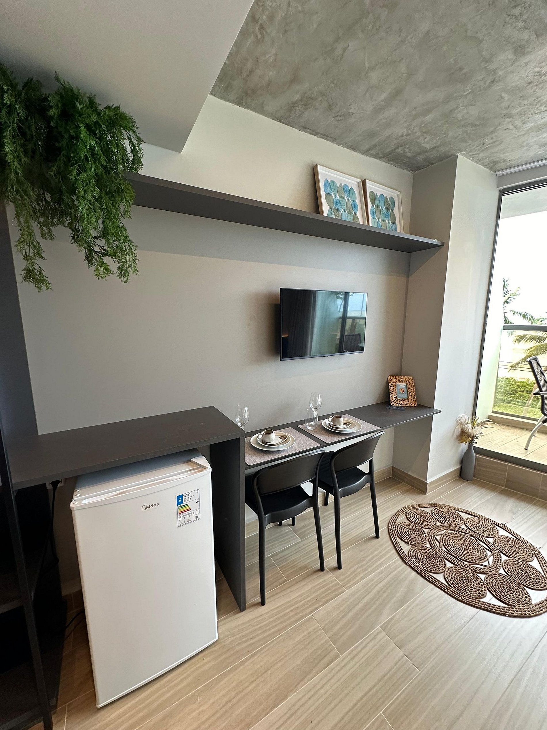 • Cozinha compacta e funcional – Equipada com micro-ondas, fogão, frigobar, cafeteira, sanduicheira, liquidificador e todos os utensílios essenciais, garantindo praticidade e facilidade no dia a dia. A decoração prioriza funcionalidade e praticidade, tornando o ambiente bonito e ao mesmo tempo eficiente.