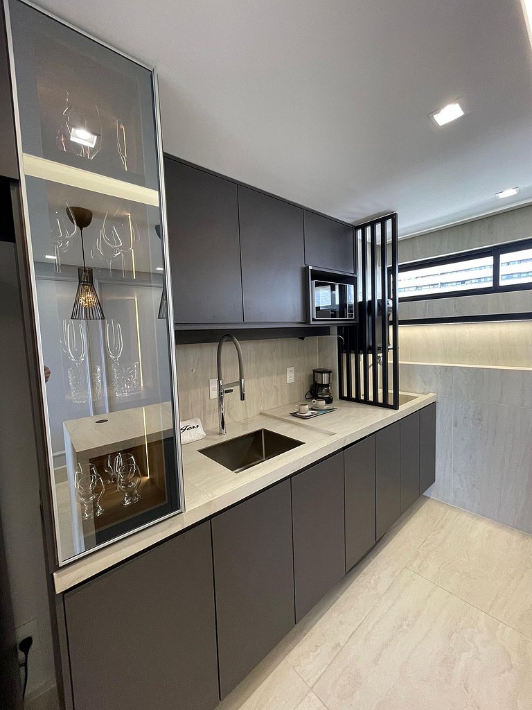 Espaço muito confortável, moderno, funcional. Com acesso a piscina, academia climatizada, vista para o mar e o acesso à praia.