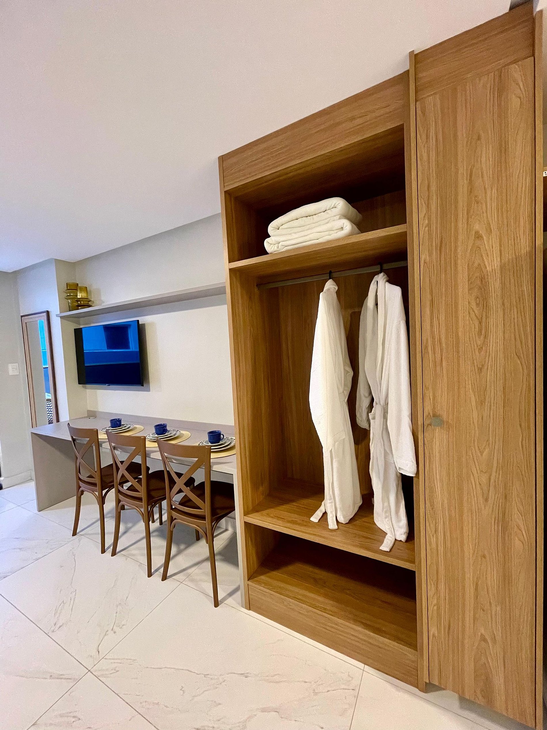• Flat amplo e confortável, com duas camas de casal e guarda-roupa espaçoso, ideal para uma estadia prática e relaxante.