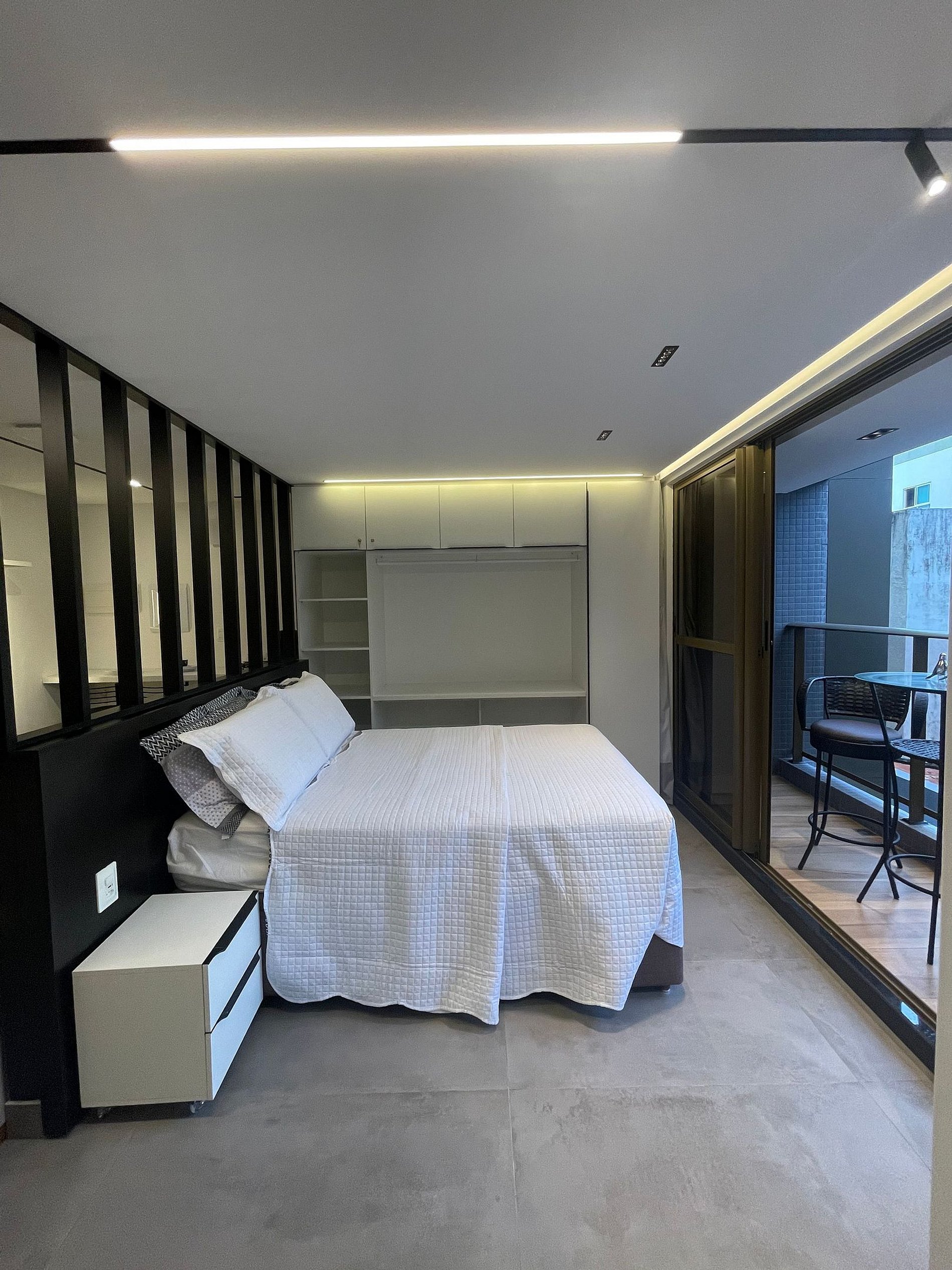 - O flat é super funcional com uma cama queen e sofá cama, guarda-roupa, mesa de apoio.