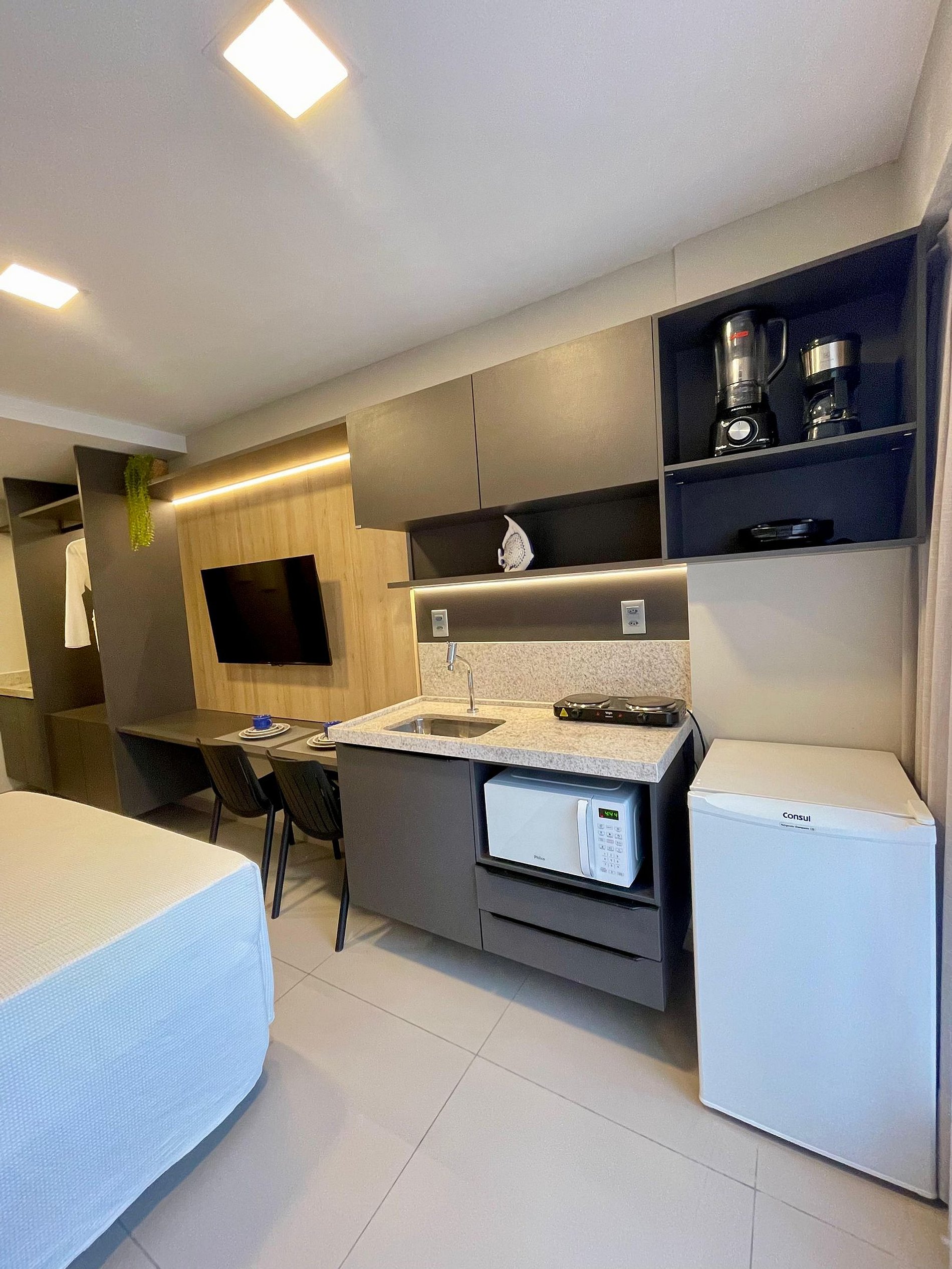 Aconchegante e funcional, este apartamento beira-mar acomoda até 3 pessoas com conforto e praticidade. A cozinha é compacta, mas bem equipada, ideal para quem deseja preparar refeições durante a estadia.