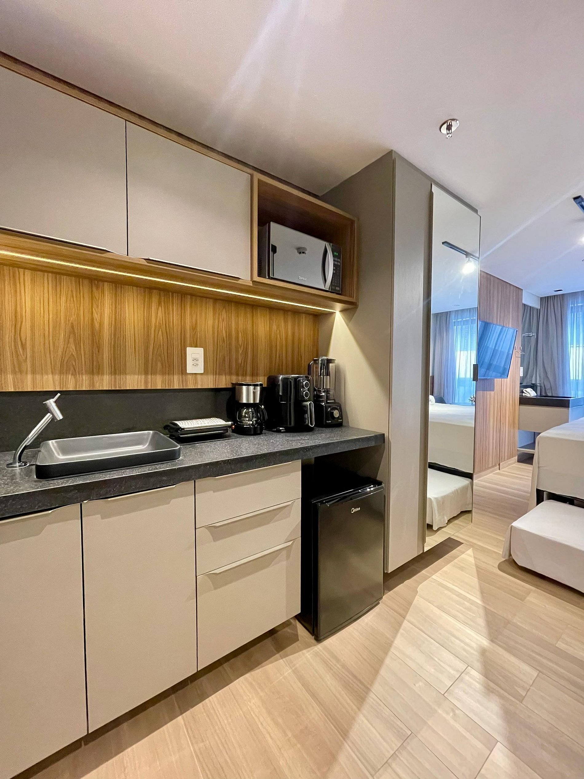 • Cozinha compacta e funcional, com utensílios para refeições práticas