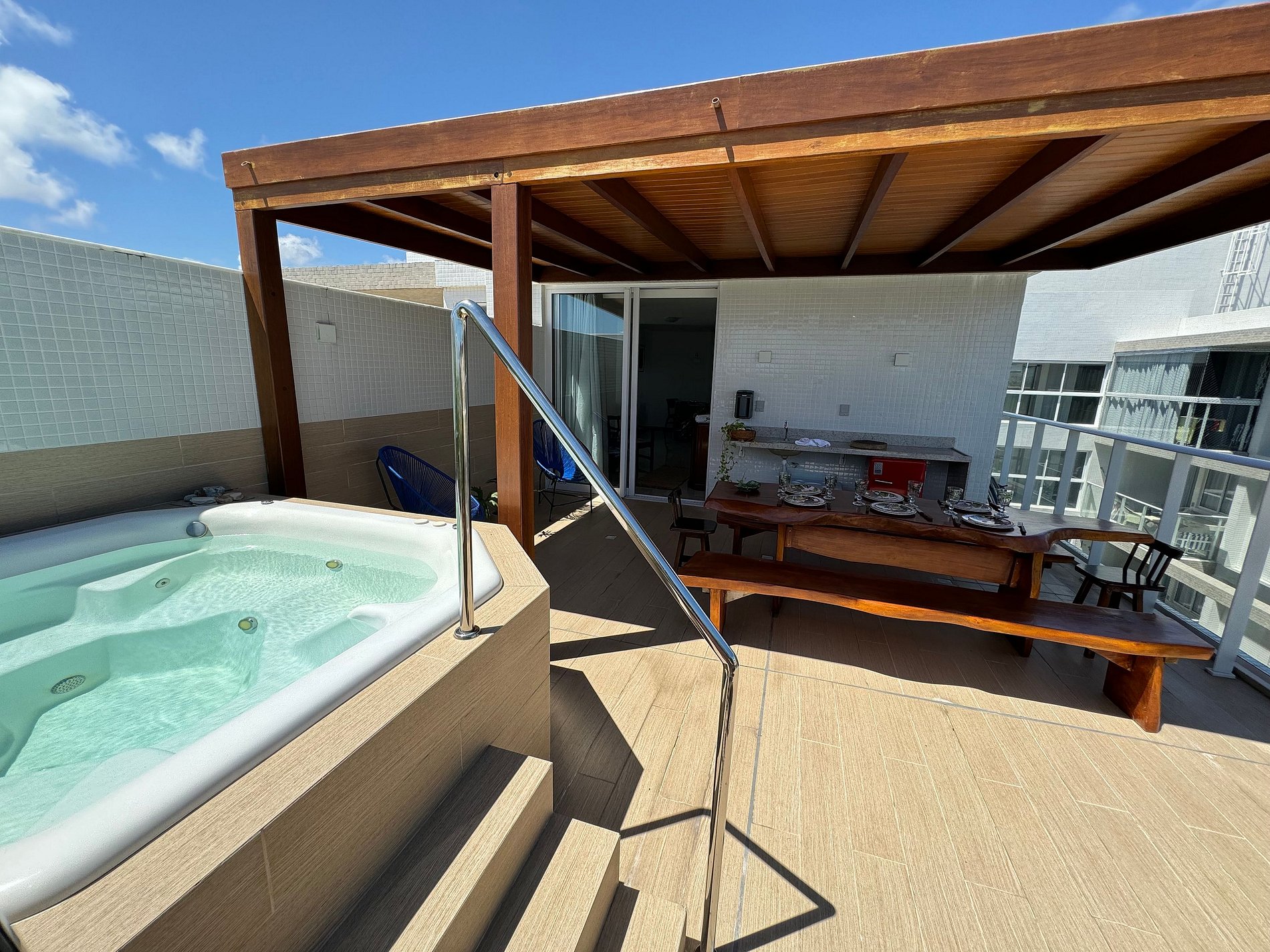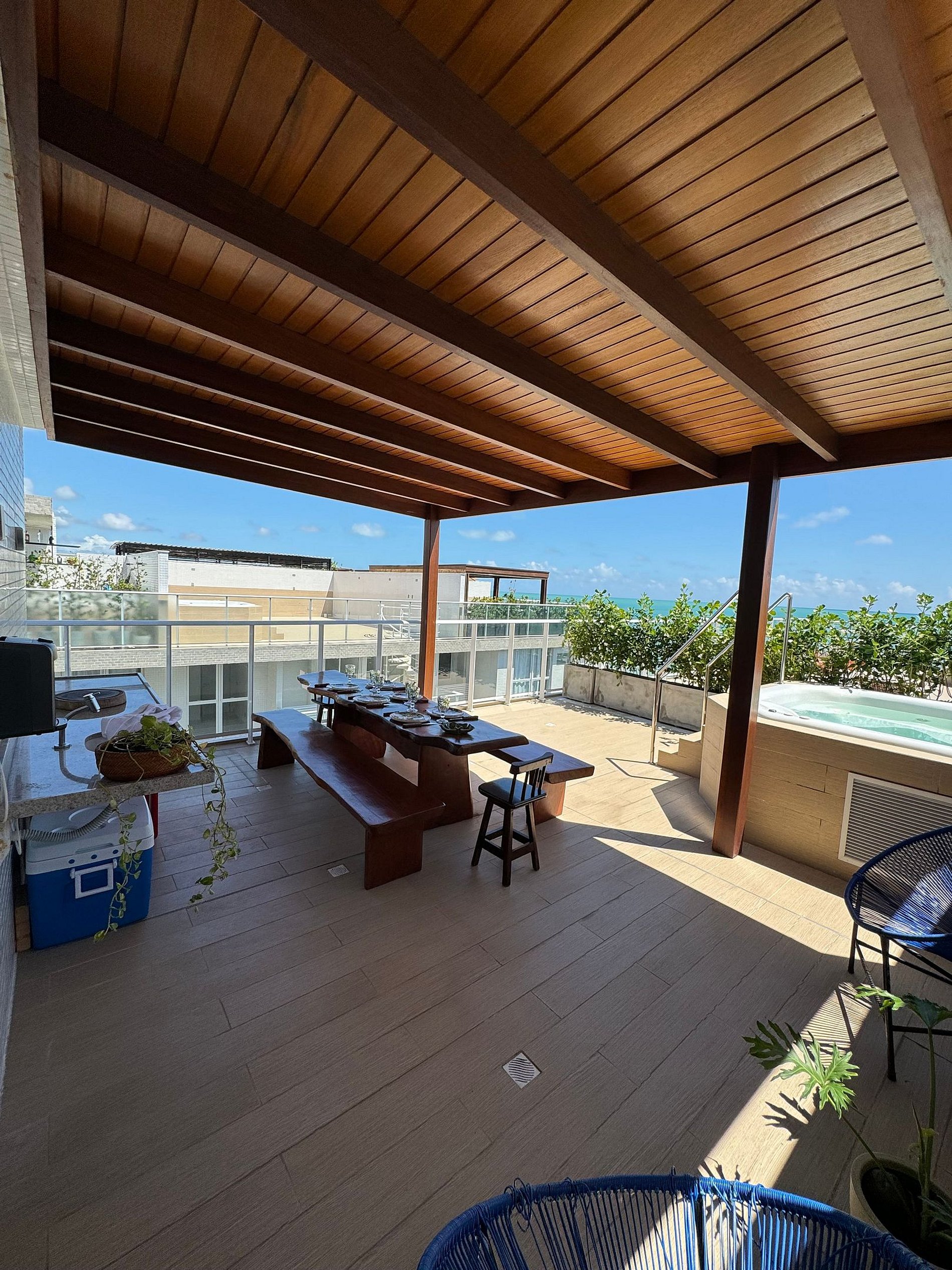 • Cobertura com varanda que possui banheira privativa, com ambientes Integrados e aconchegantes: A decoração moderna e funcional cria um ambiente acolhedor, ideal para relaxar após um dia de praia.