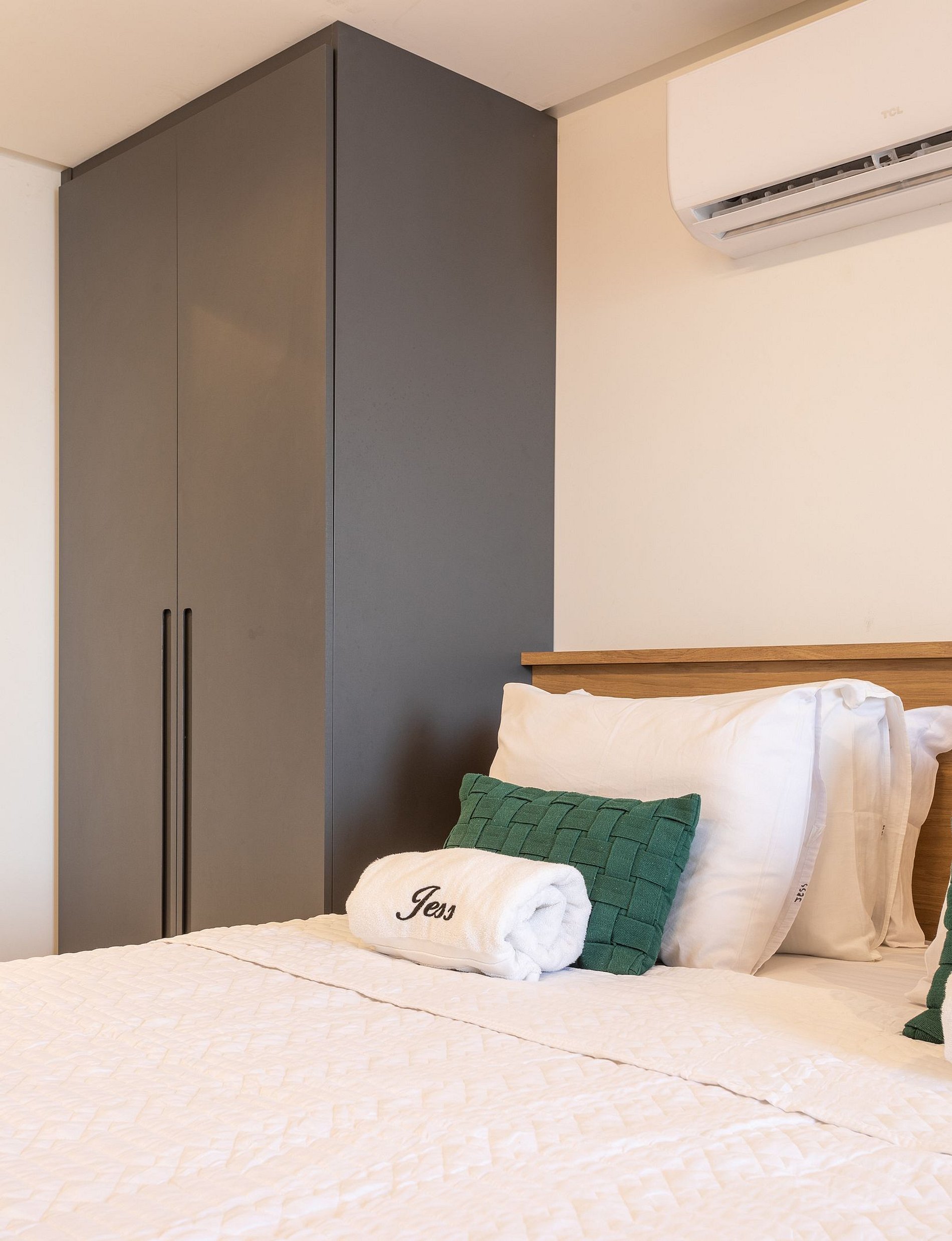 - O flat é super funcional com uma cama queen, guarda-roupa, mesa de apoio.
