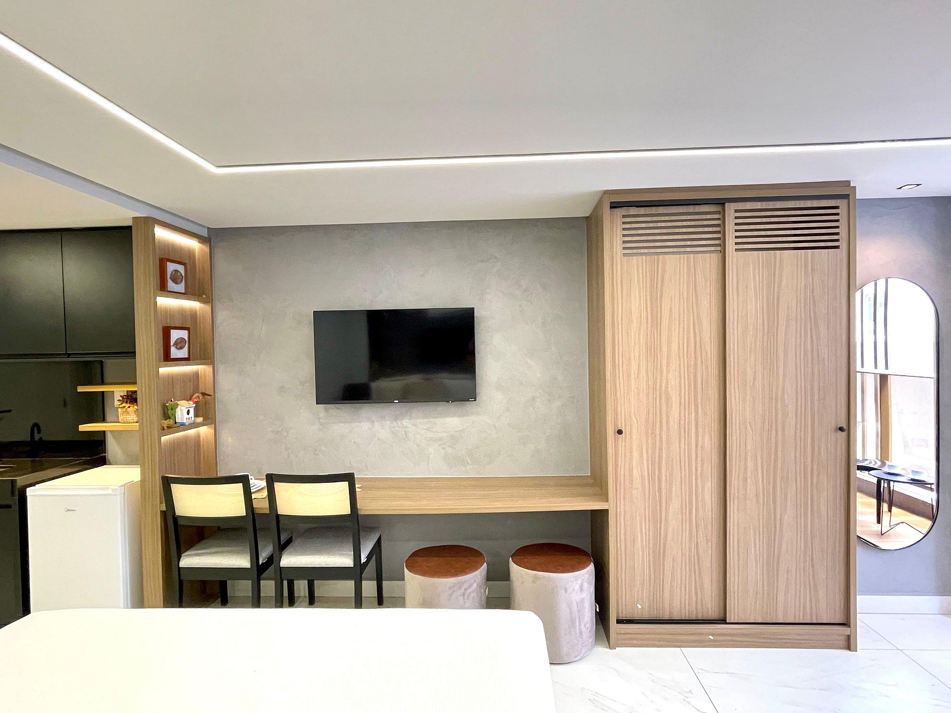 - O flat é super funcional com uma cama queen e sofá cama, guarda-roupa, mesa de apoio.