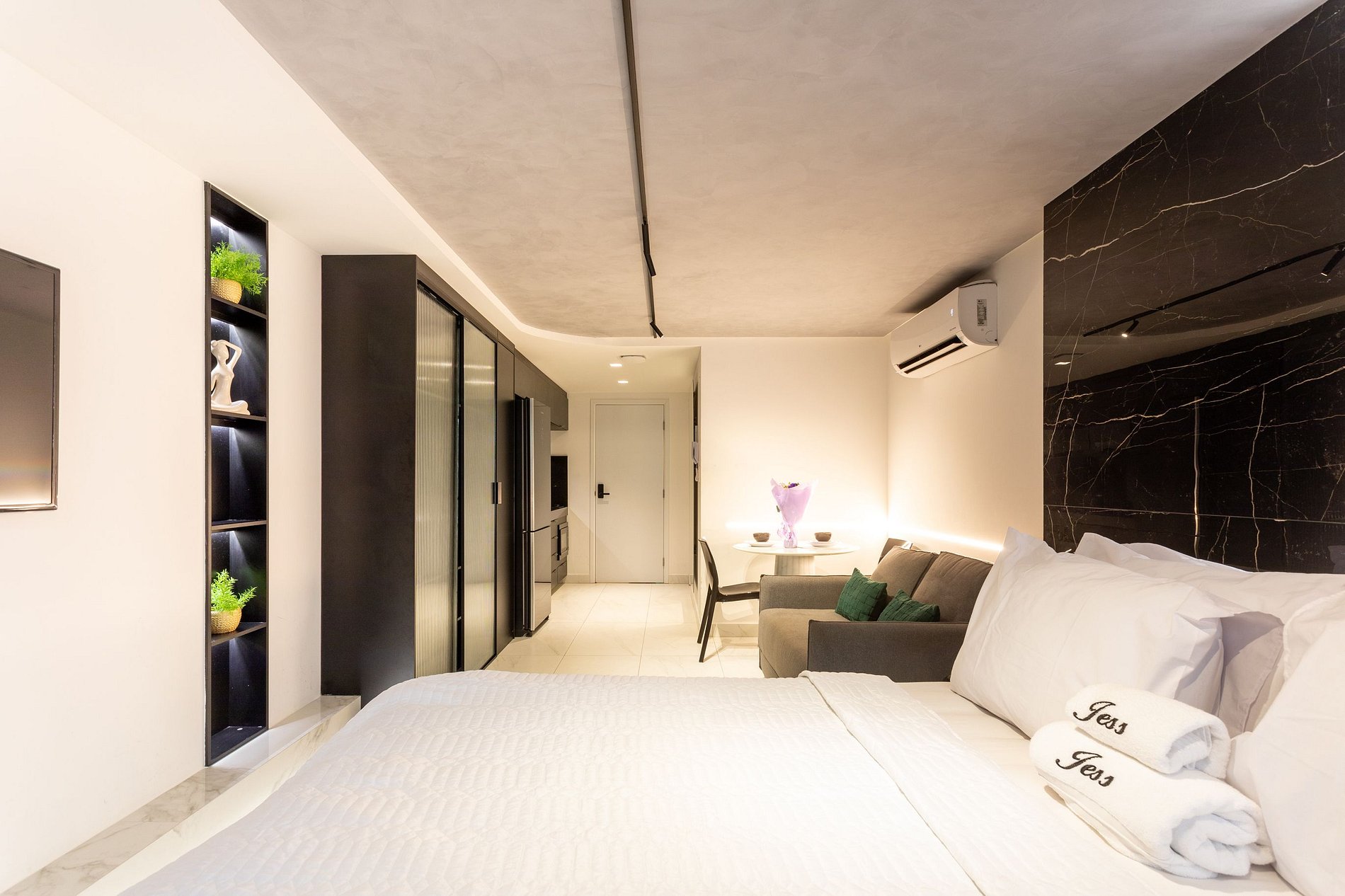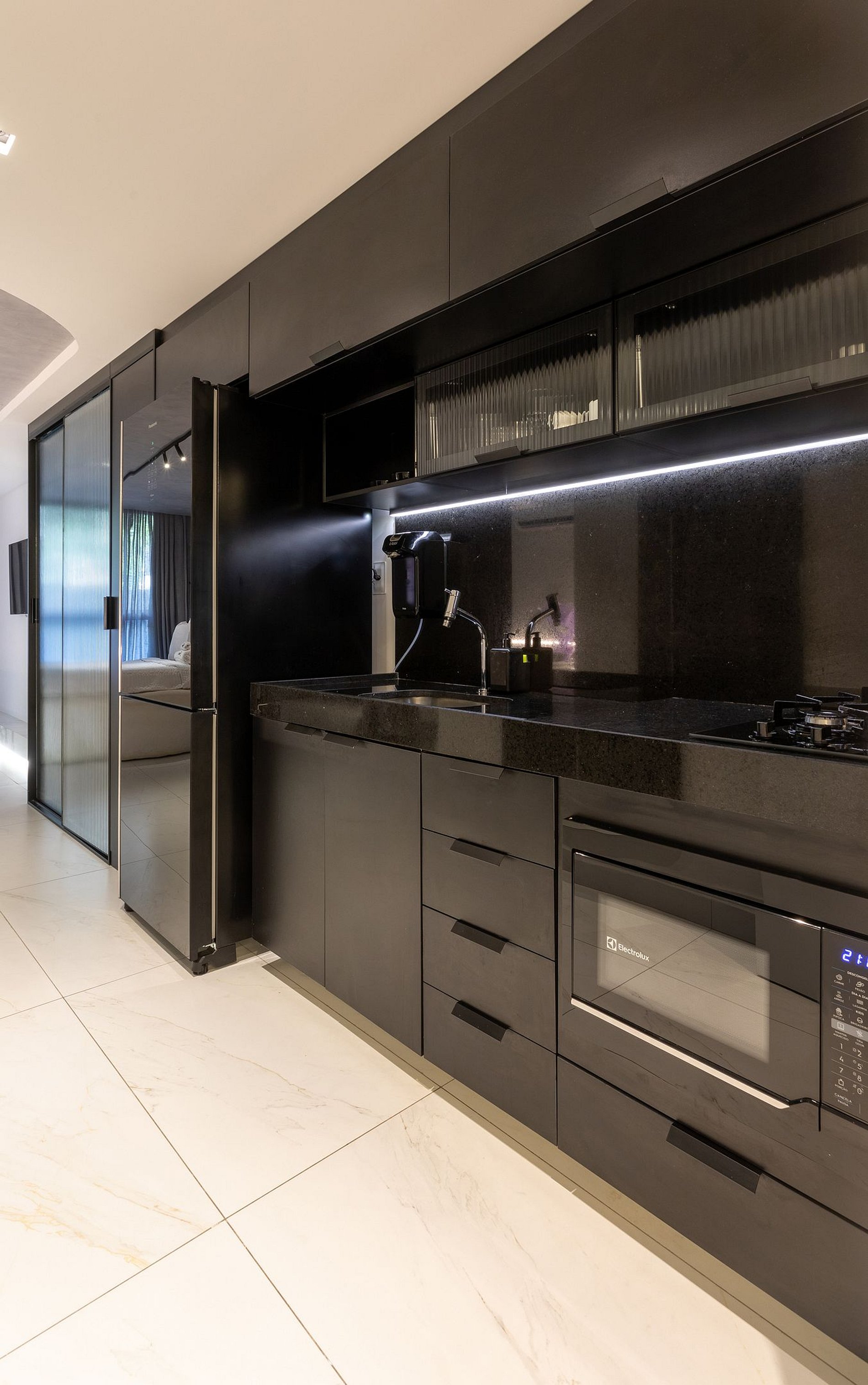 Um ambiente moderno, elegante e bem planejado, com decoração minimalista e acabamento premium — destaque para o design em preto e branco que traz um ar de loft urbano.