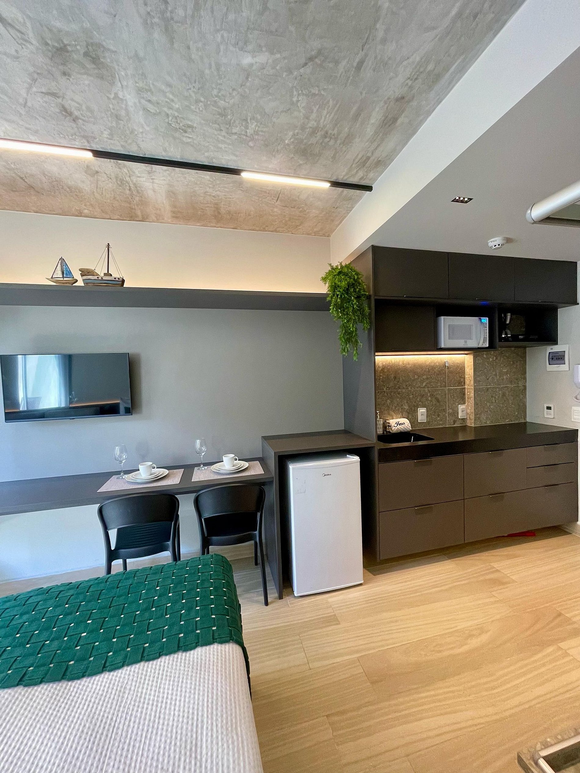 • Cozinha compacta e funcional – Equipada com micro-ondas, frigobar, cafeteira, sanduicheira, liquidificador e todos os utensílios essenciais, garantindo praticidade e facilidade no dia a dia. A decoração prioriza funcionalidade e praticidade, tornando o ambiente bonito e ao mesmo tempo eficiente.
