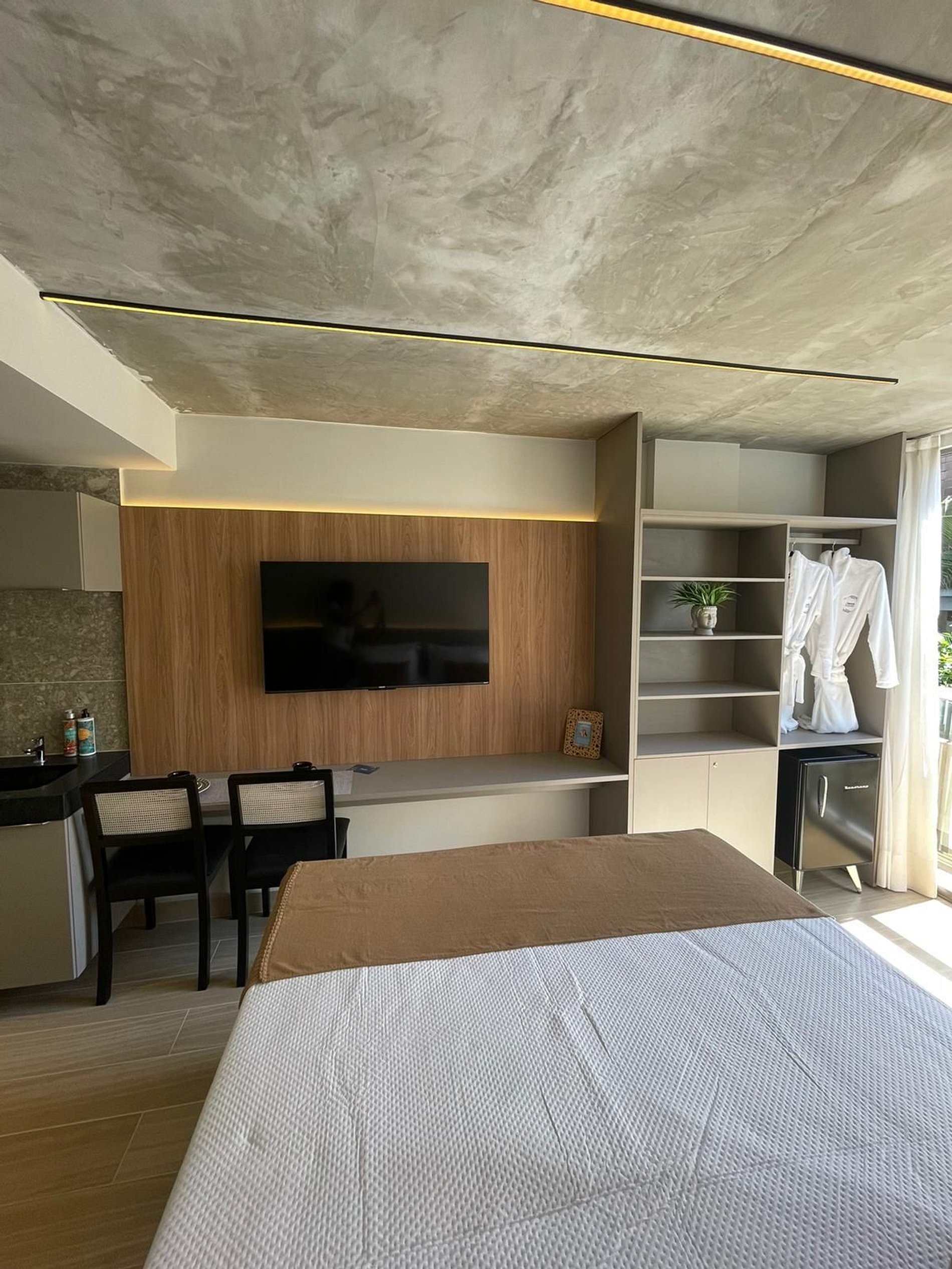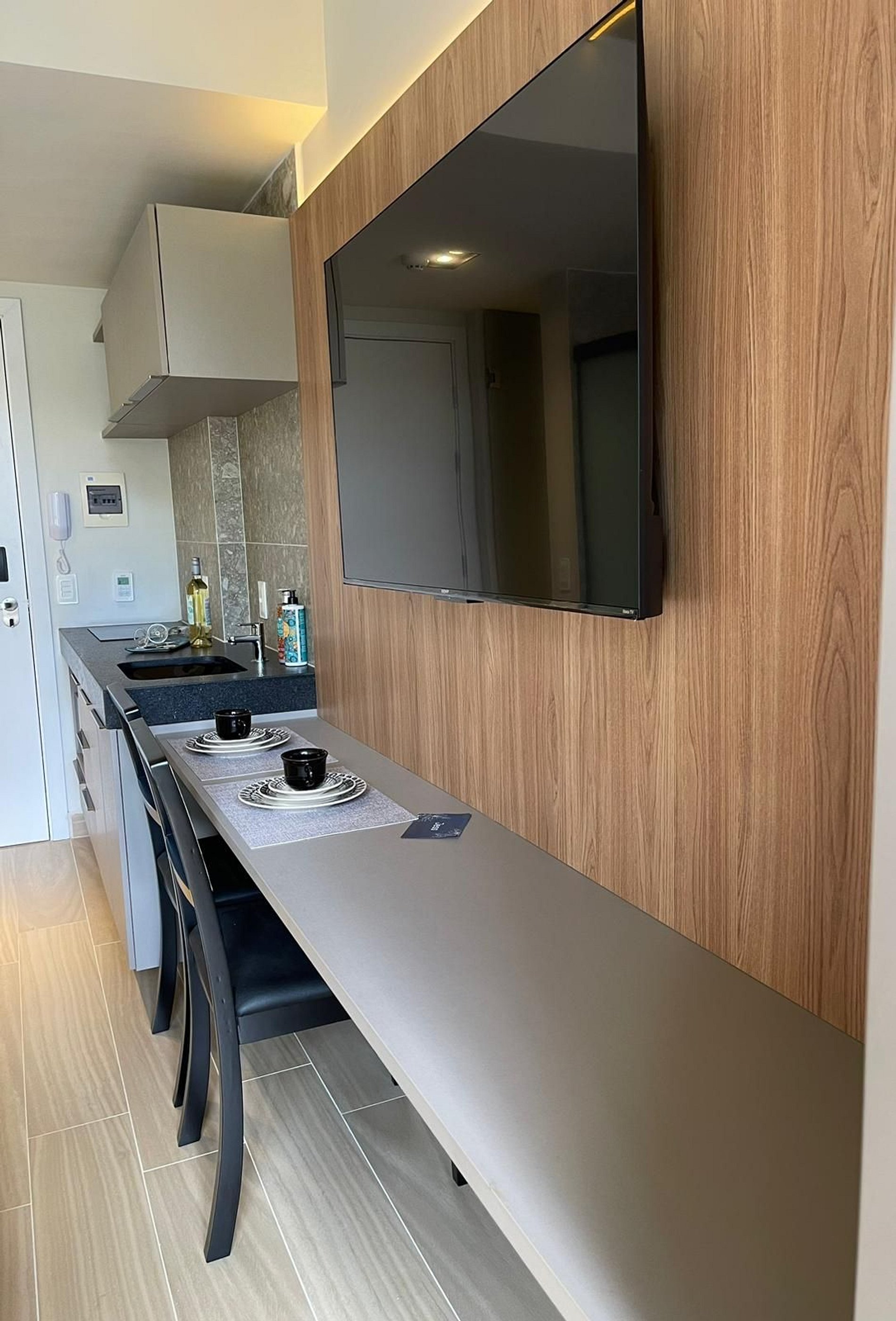 - O flat é super funcional com uma cama queen e sofá cama, mesa de apoio..