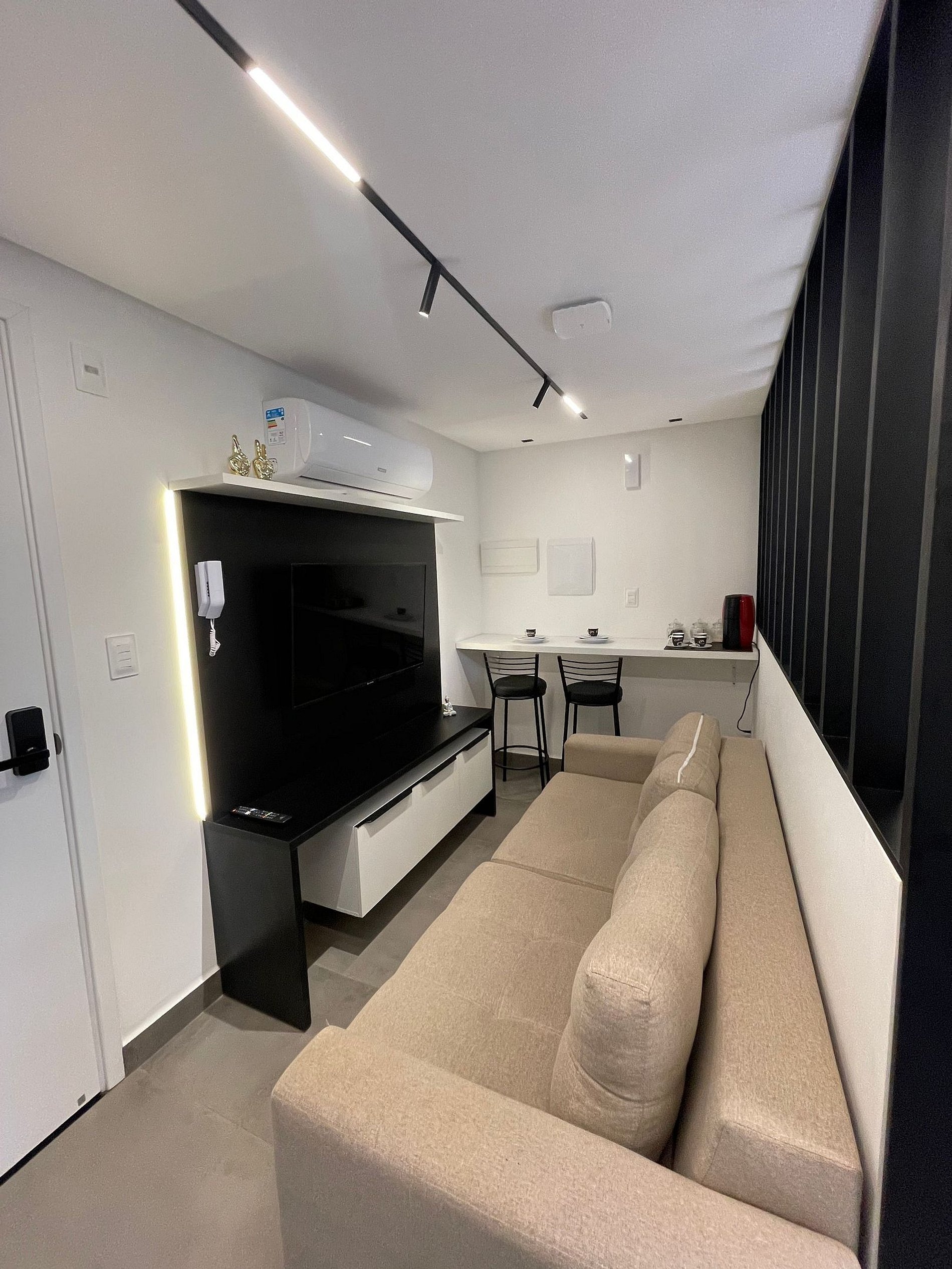 - O flat é super funcional com uma cama queen e sofá cama, guarda-roupa, mesa de apoio.