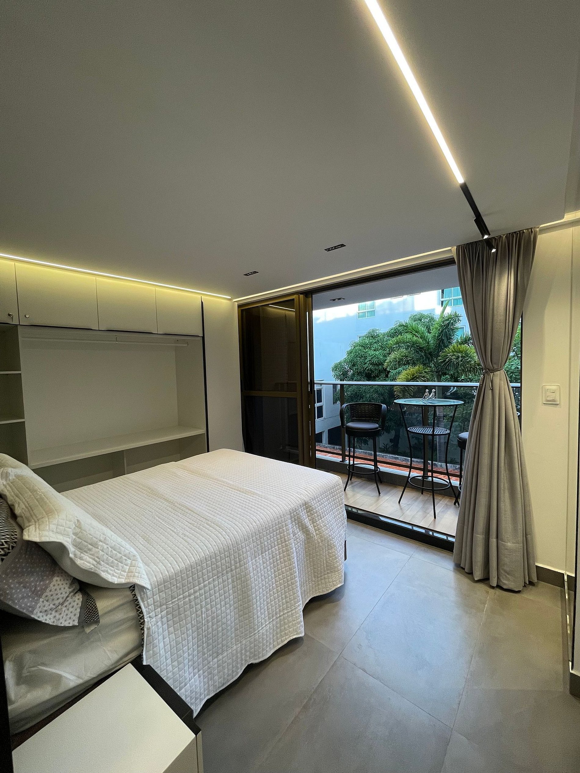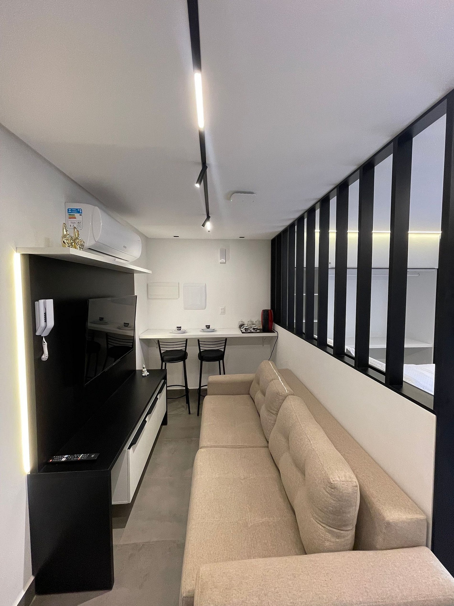 - O flat é super funcional com uma cama queen e sofá cama, guarda-roupa, mesa de apoio.