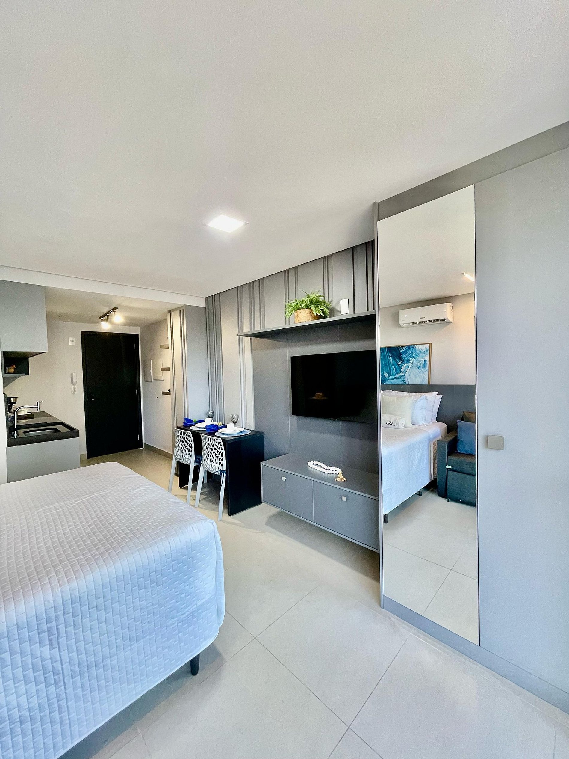 Aproveite a excelente estrutura do condomínio, que inclui piscina, academia, jardim, Wi-Fi gratuito e estacionamento rotativo. As unidades são completamente equipadas com ar-condicionado, cozinha moderna, além de banheiro privativo.