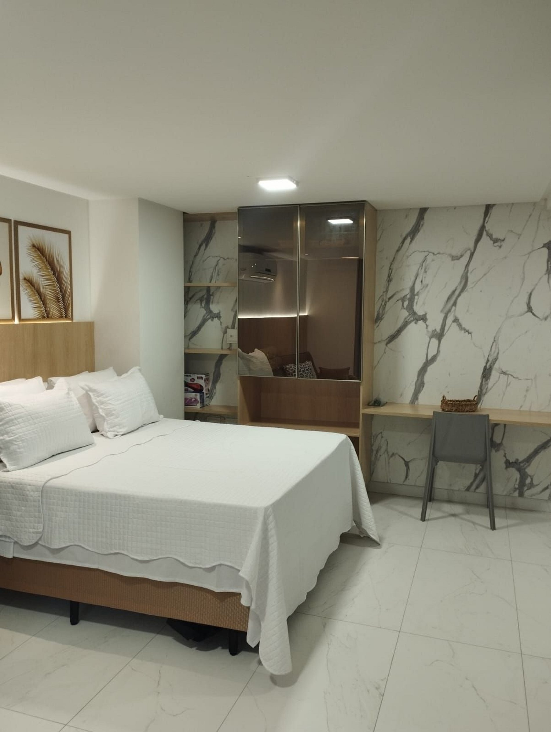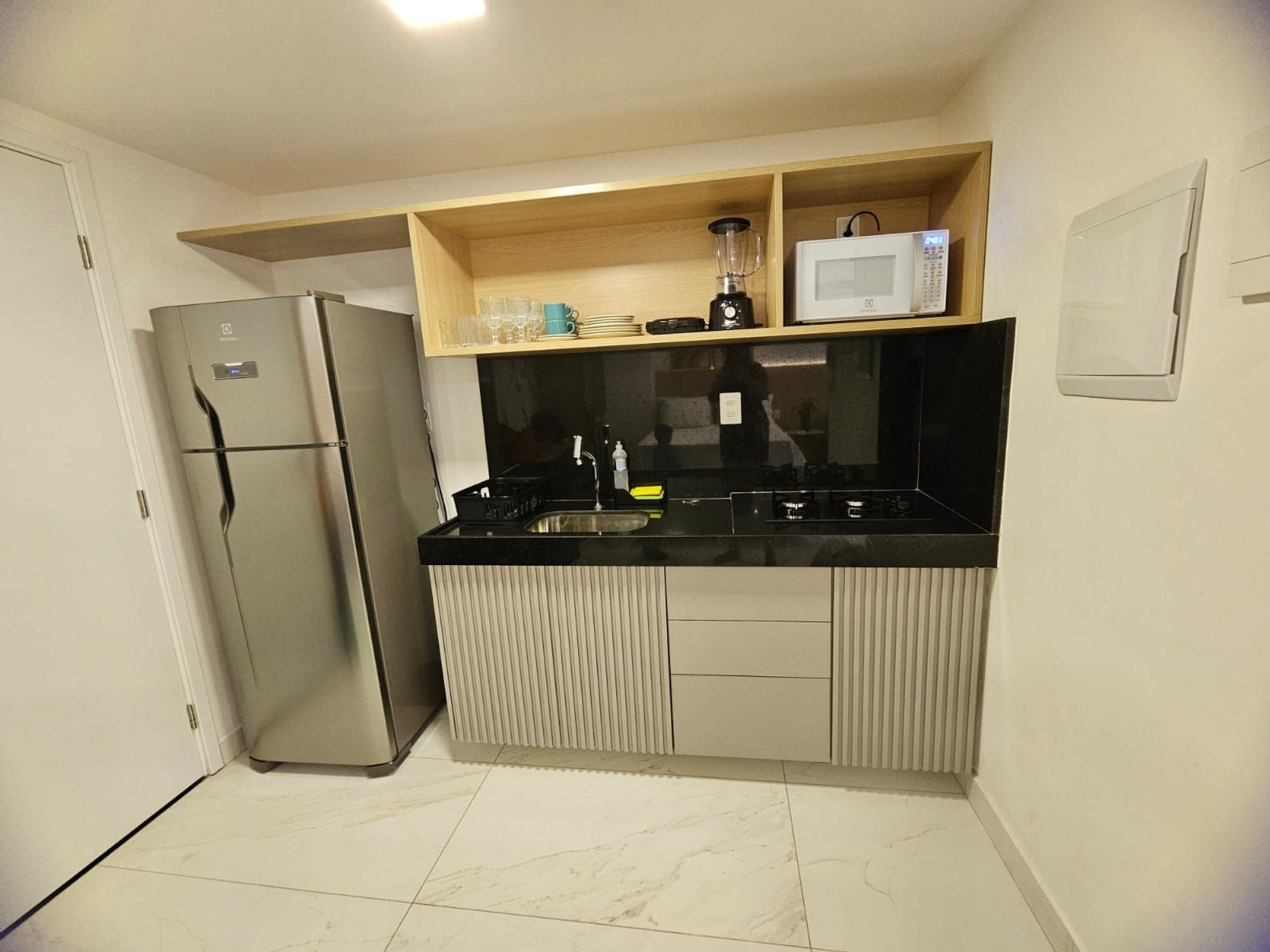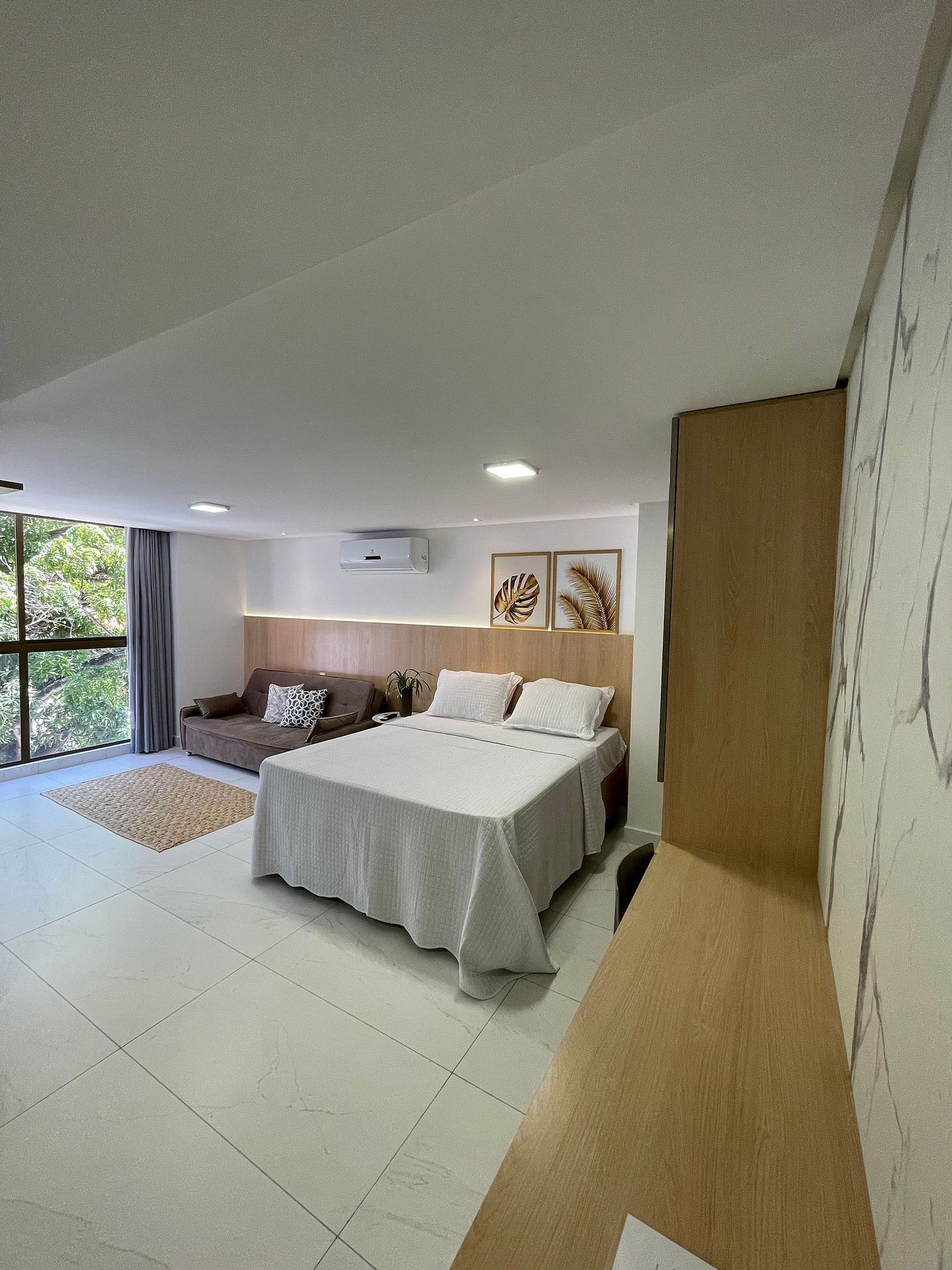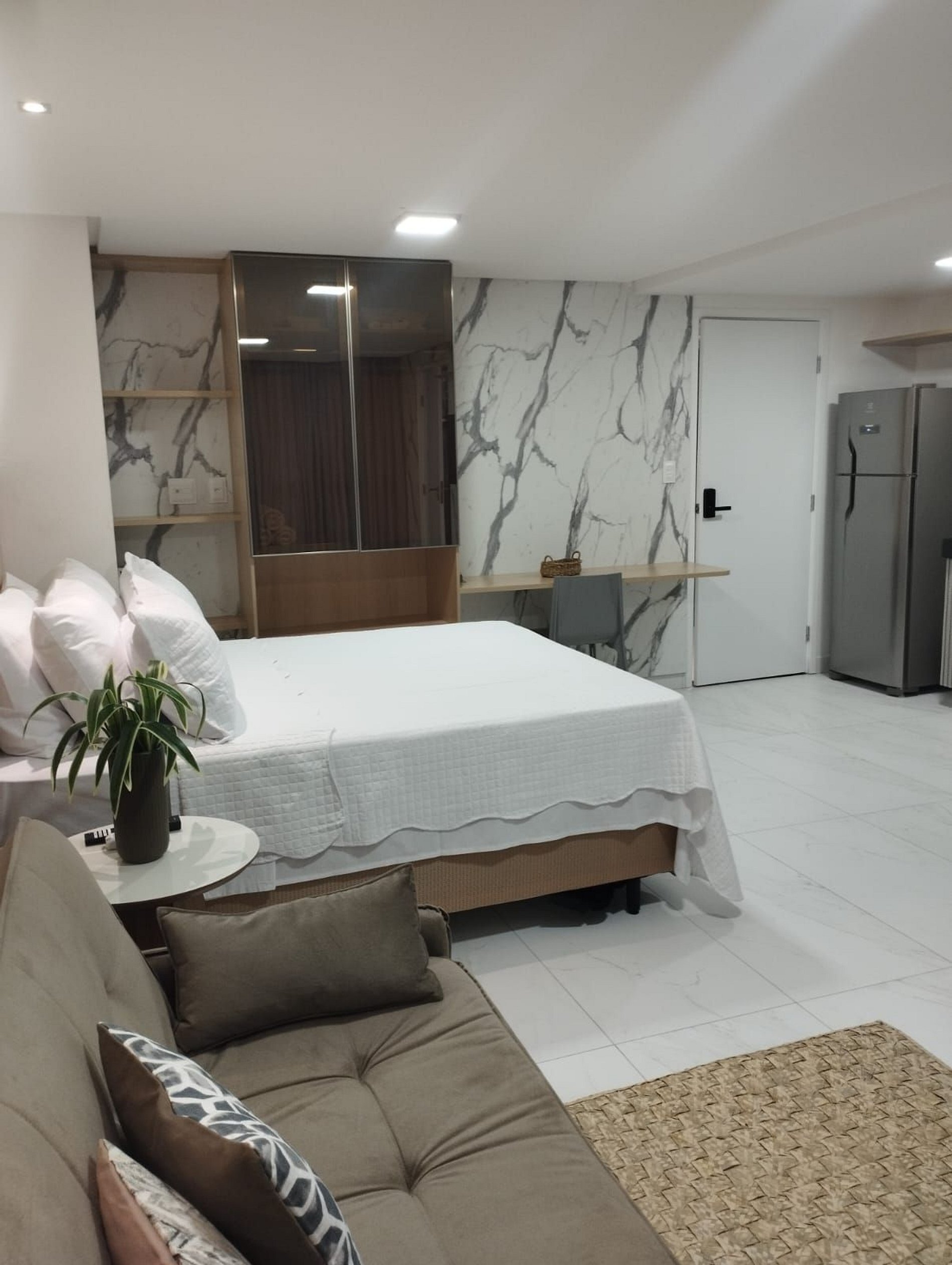 - O flat é super funcional com uma cama queen e sofá cama, guarda-roupa, mesa de apoio.
