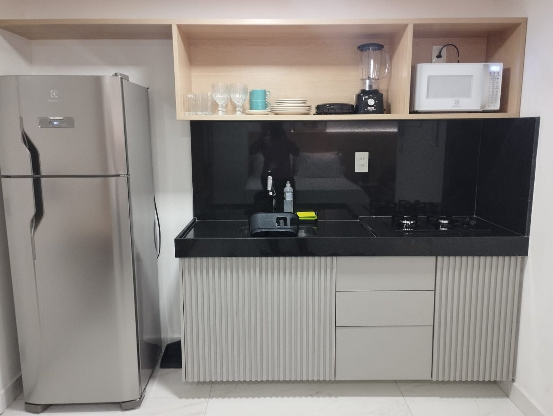 O apartamento é completo, com cozinha equipada (eletrodomésticos e utensílios) para preparar suas refeições com conforto.