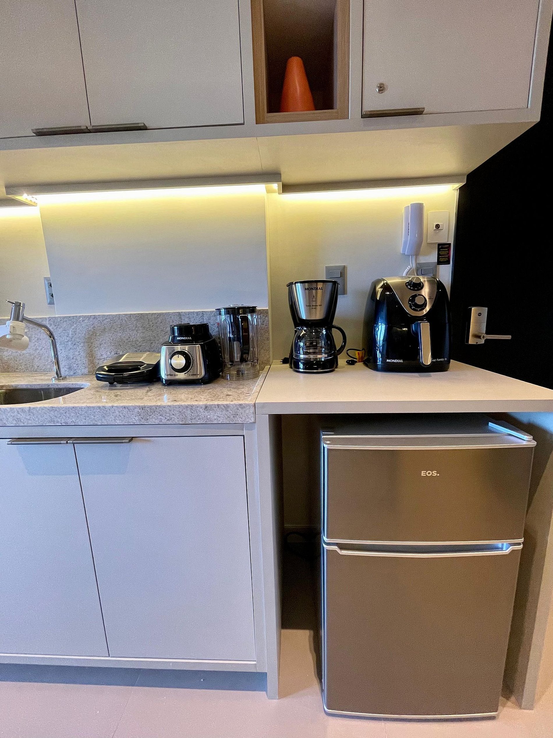 O apartamento é completo, com cozinha equipada (eletrodomésticos e utensílios) para preparar suas refeições com conforto.