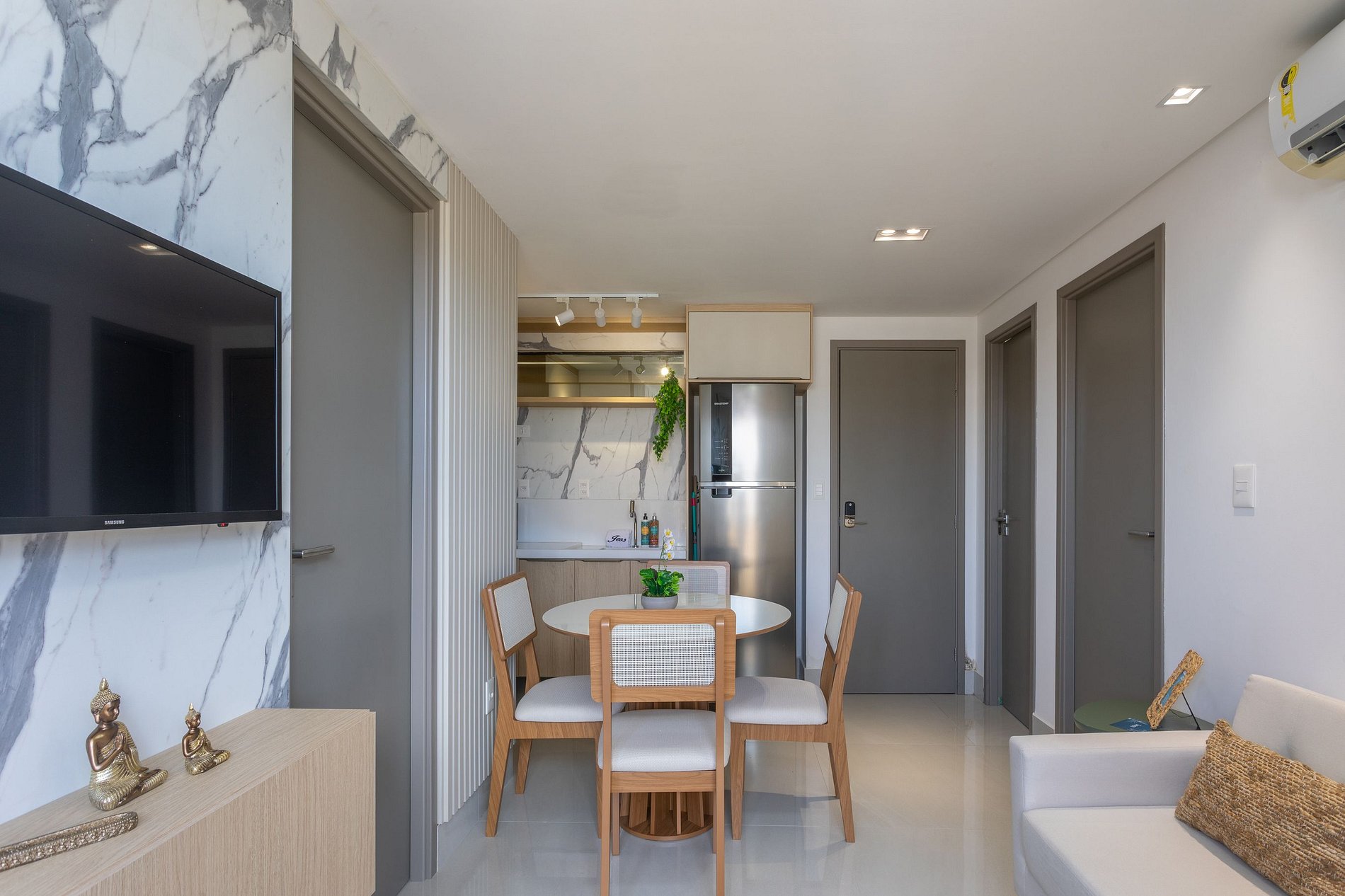 - O flat é super funcional com uma suíte e um quarto duplo.