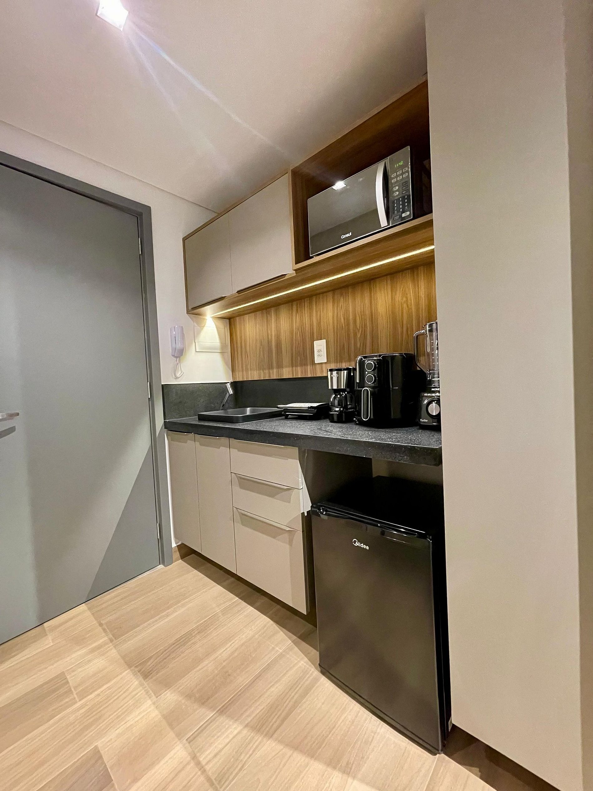 • Cozinha compacta e funcional, com utensílios para refeições práticas