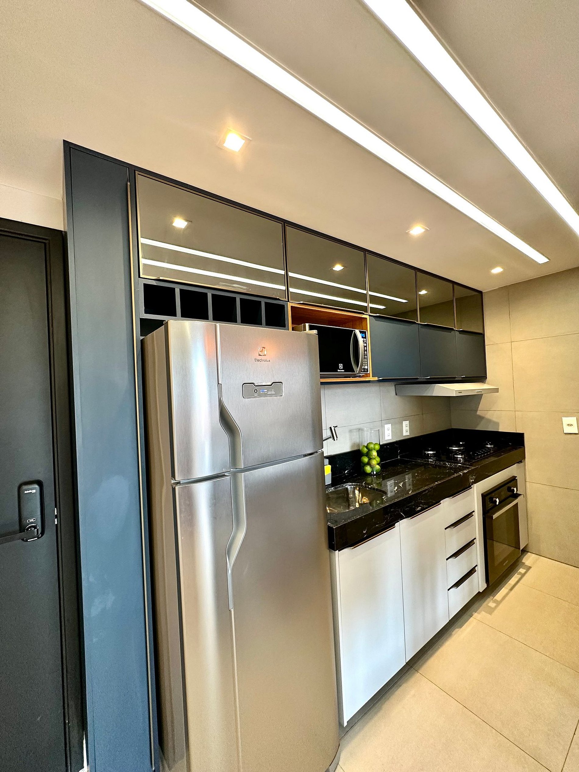 • Cozinha planejada e bem equipada, com utensílios, micro-ondas, cafeteira, sanduicheira, fogão cooktop e geladeira grande