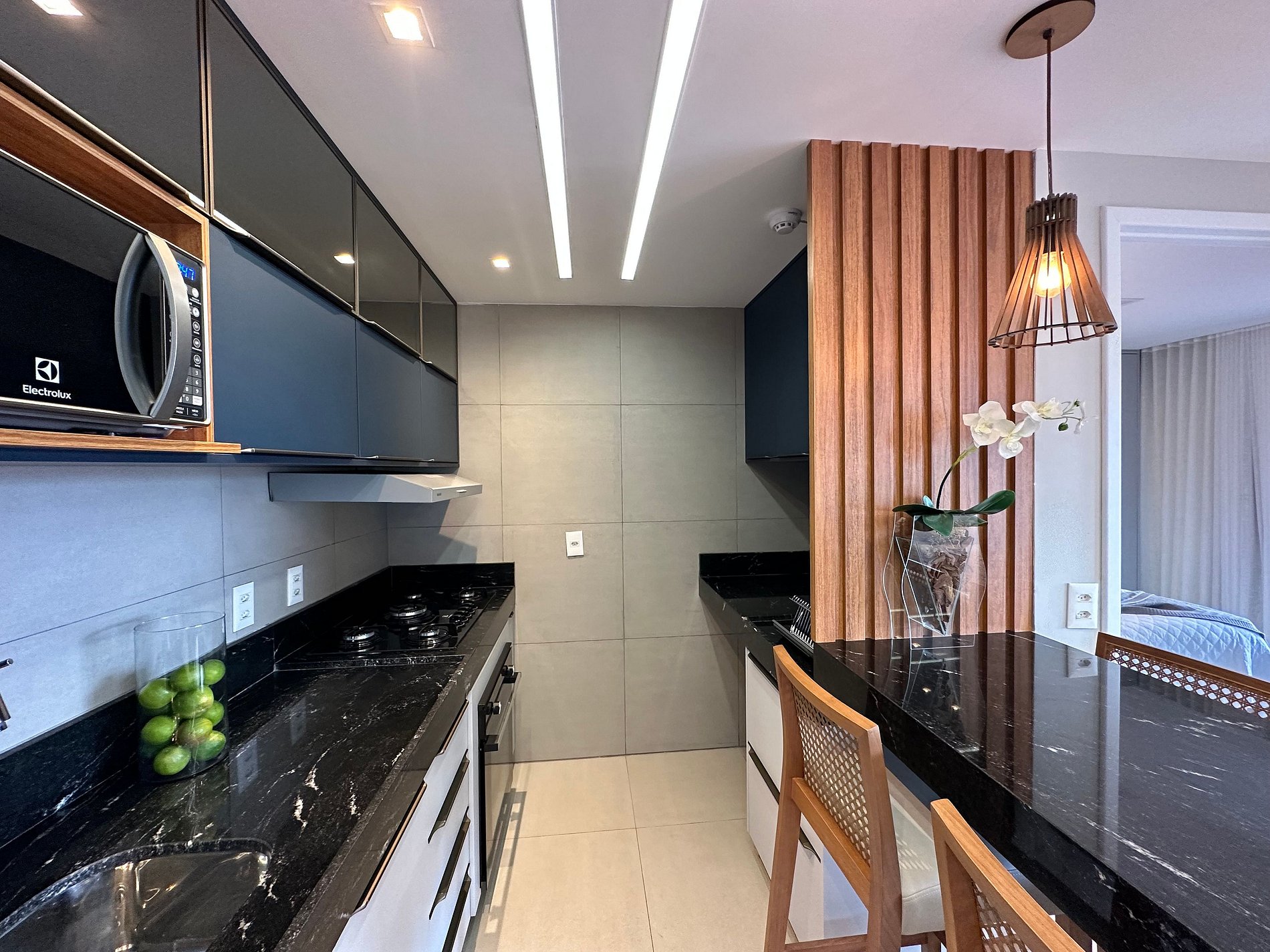 • Cozinha planejada e bem equipada, com utensílios, micro-ondas, cafeteira, sanduicheira, fogão cooktop e geladeira grande