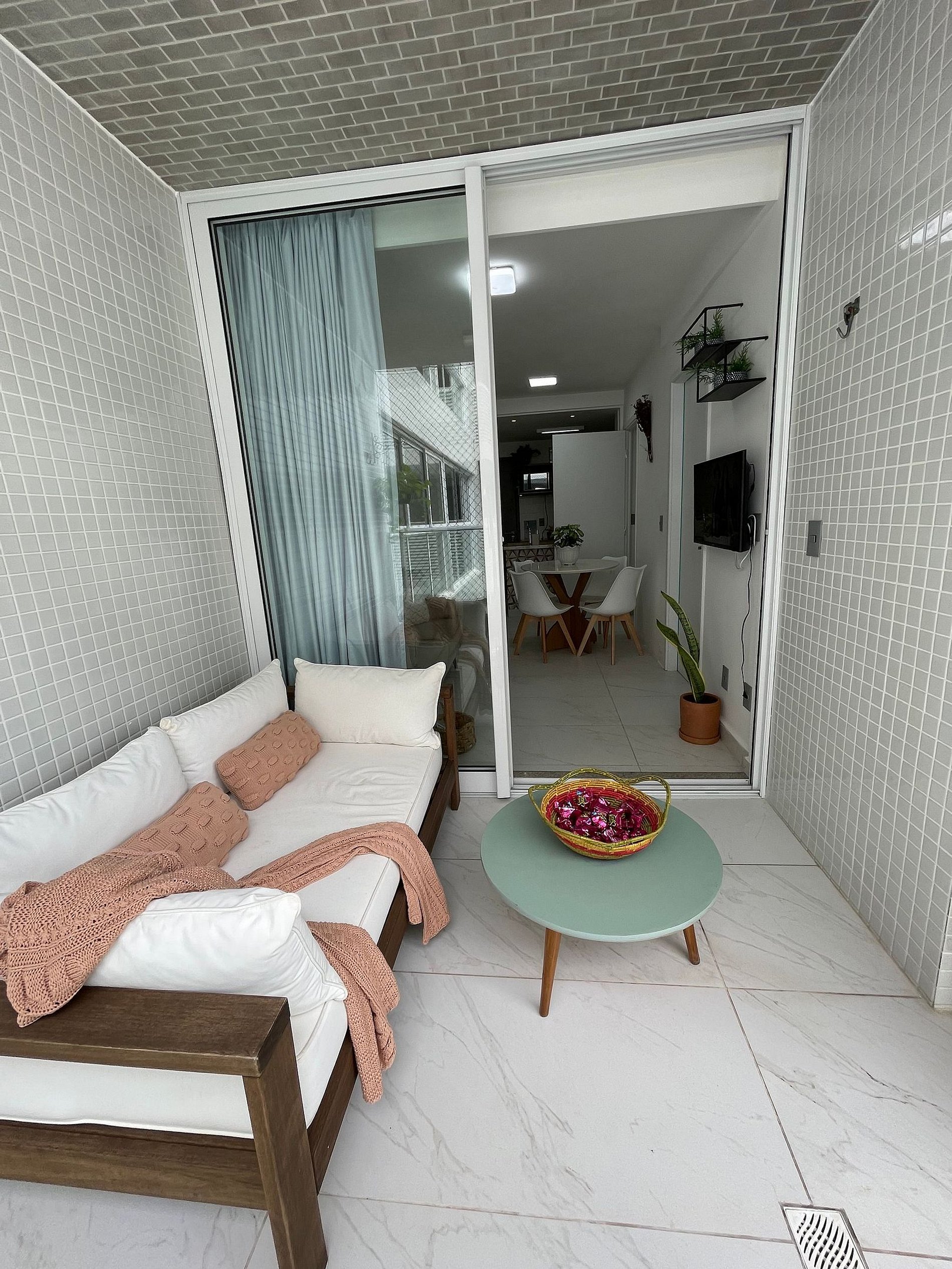 • A varanda com tela de proteção oferece segurança e tranquilidade, sendo o espaço ideal para relaxar após um dia de sol e mar