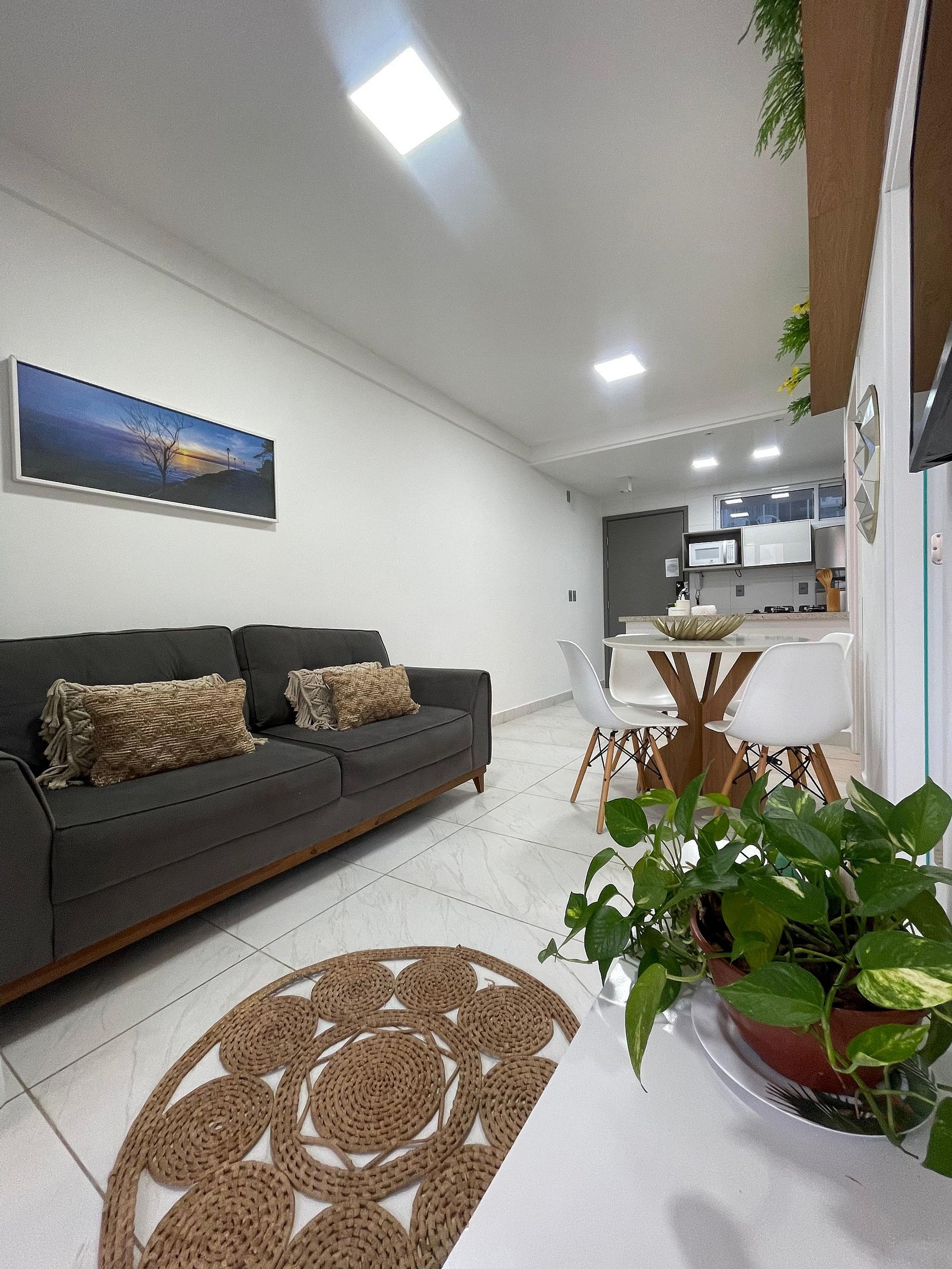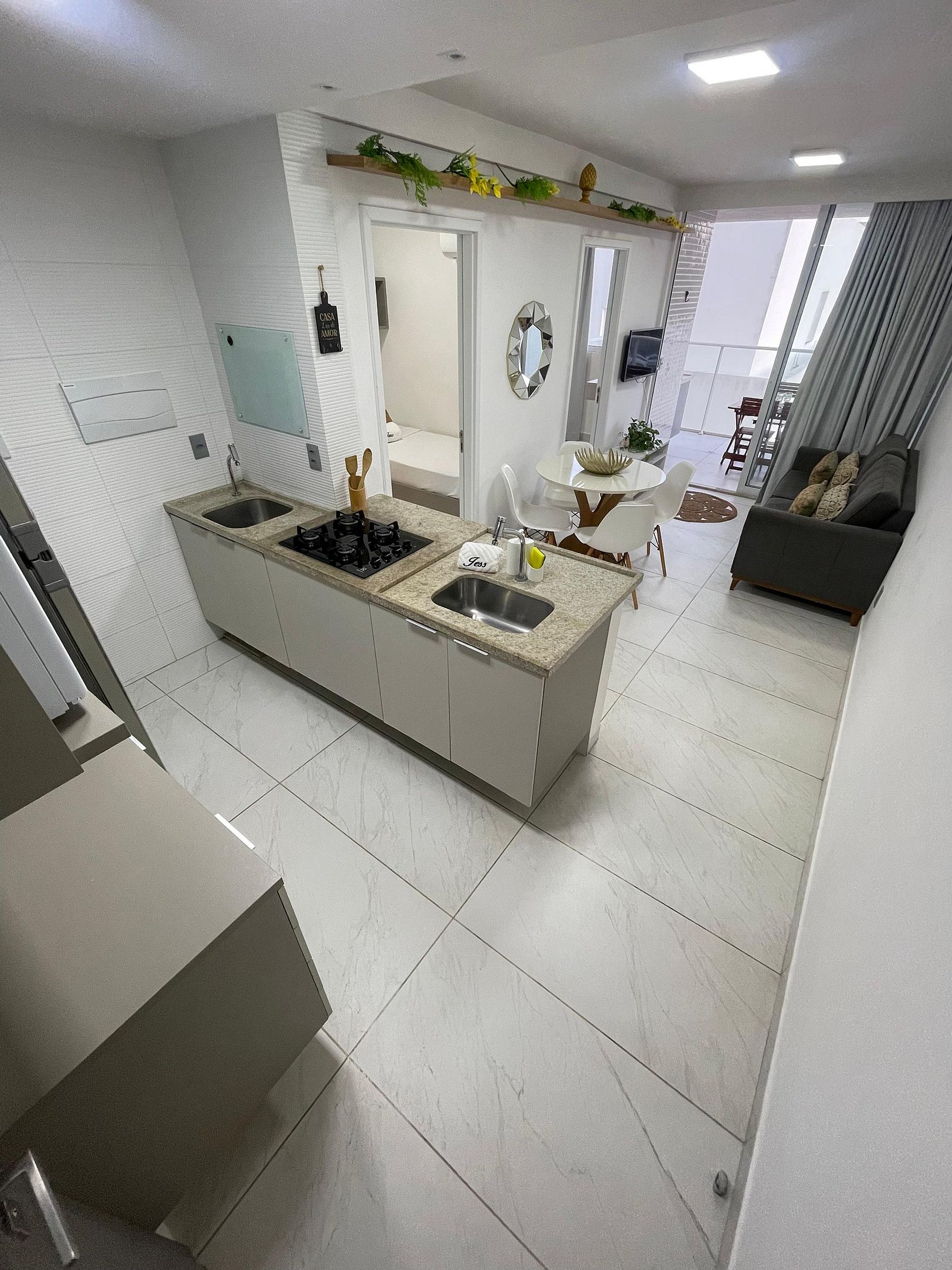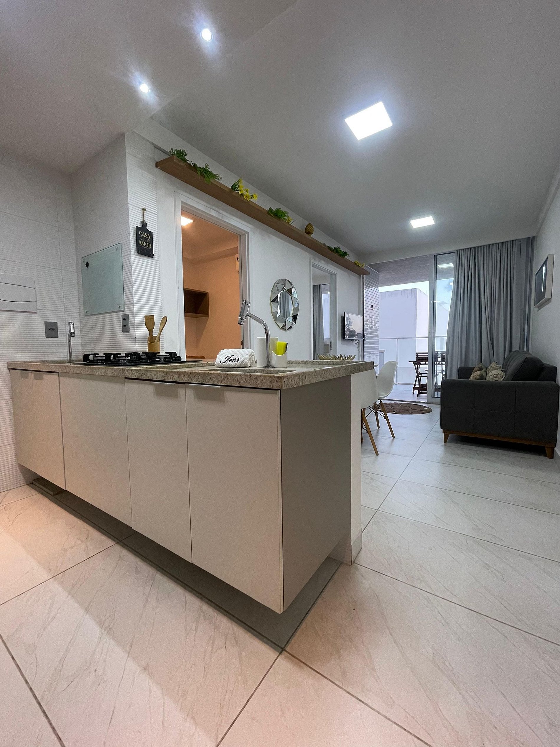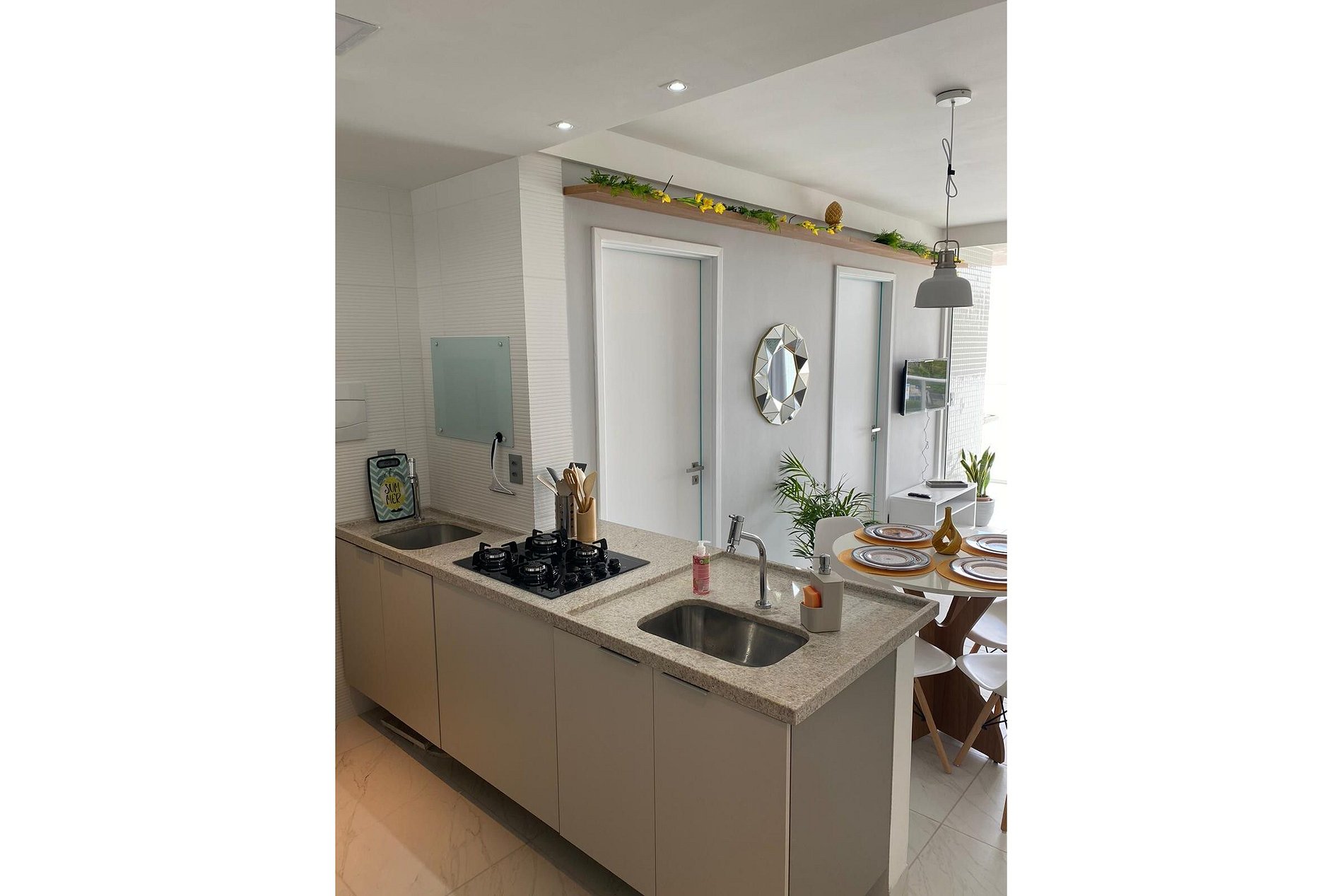• A cozinha é compacta e funcional, equipada com tudo o que você precisa para preparar refeições práticas após um dia de praia.