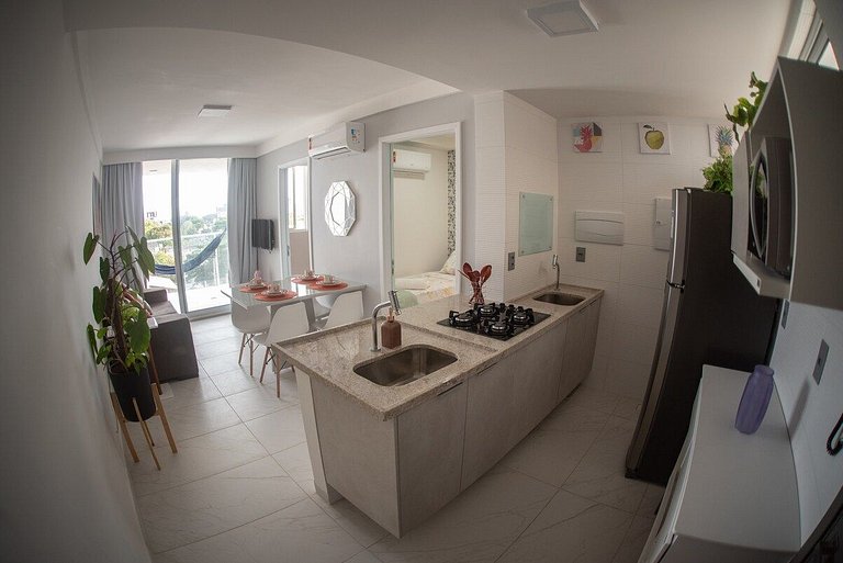• Cozinha equipada com utensílios, geladeira, fogão cooktop e micro-ondas