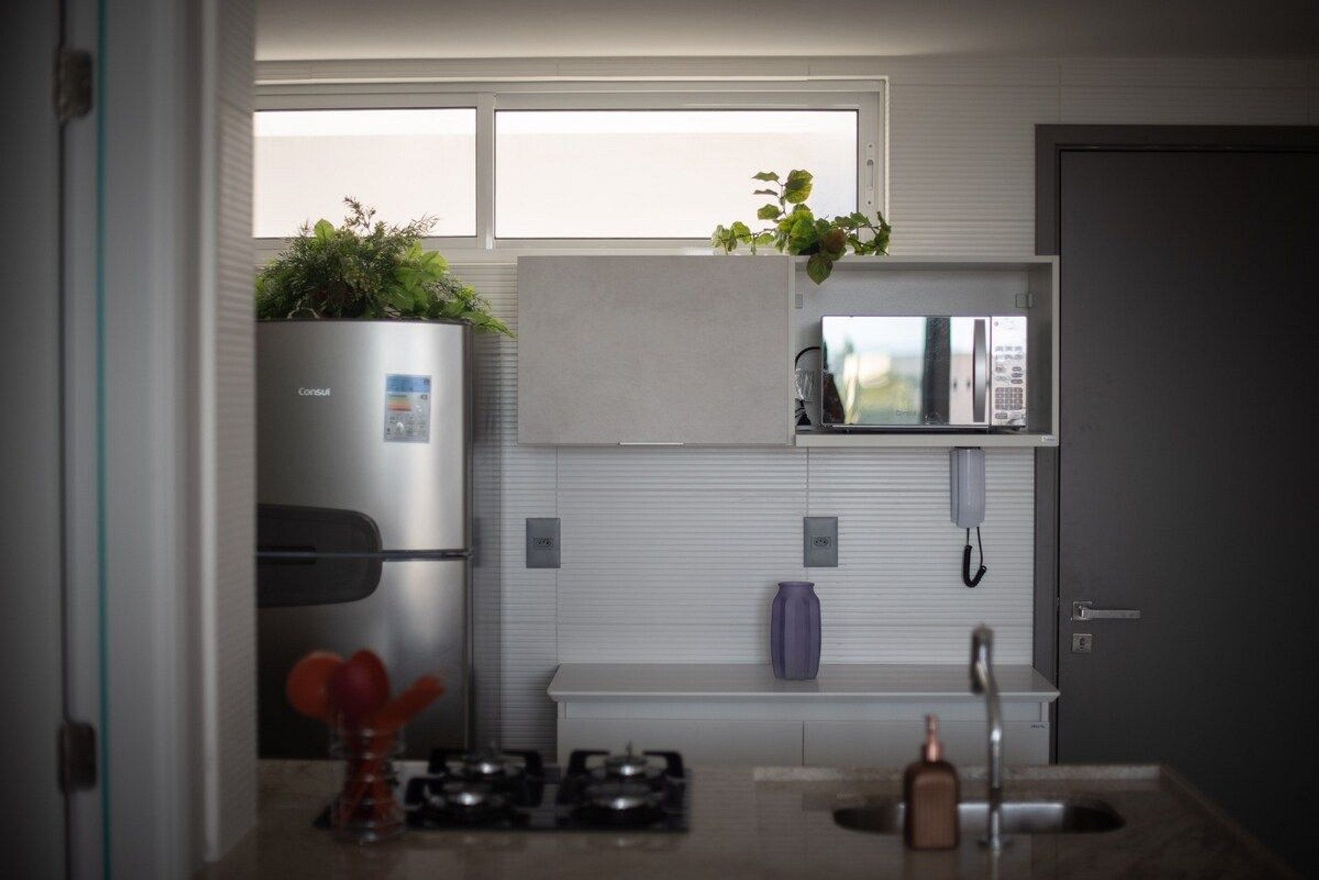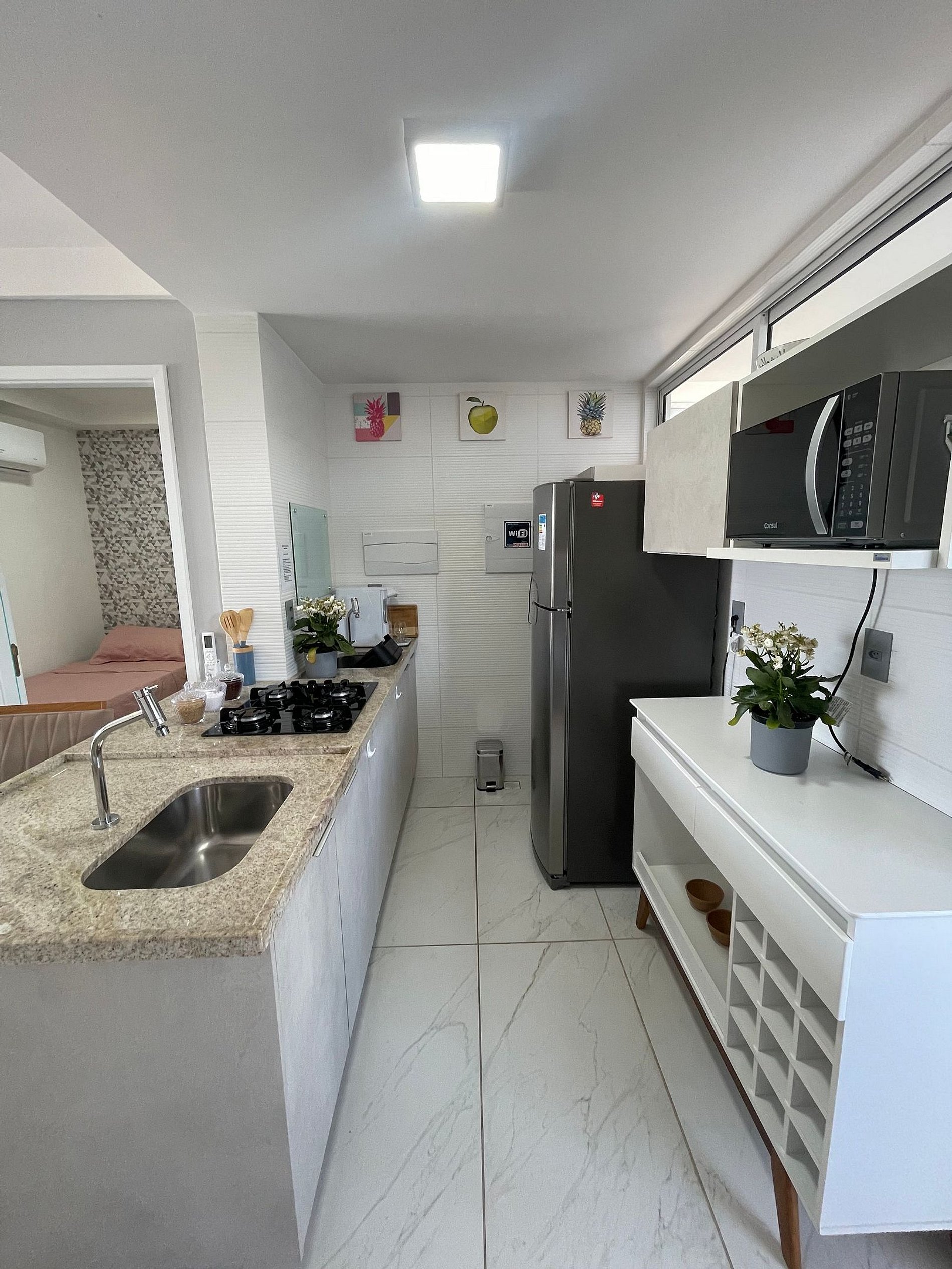 • Cozinha equipada com utensílios, geladeira, fogão cooktop e micro-ondas