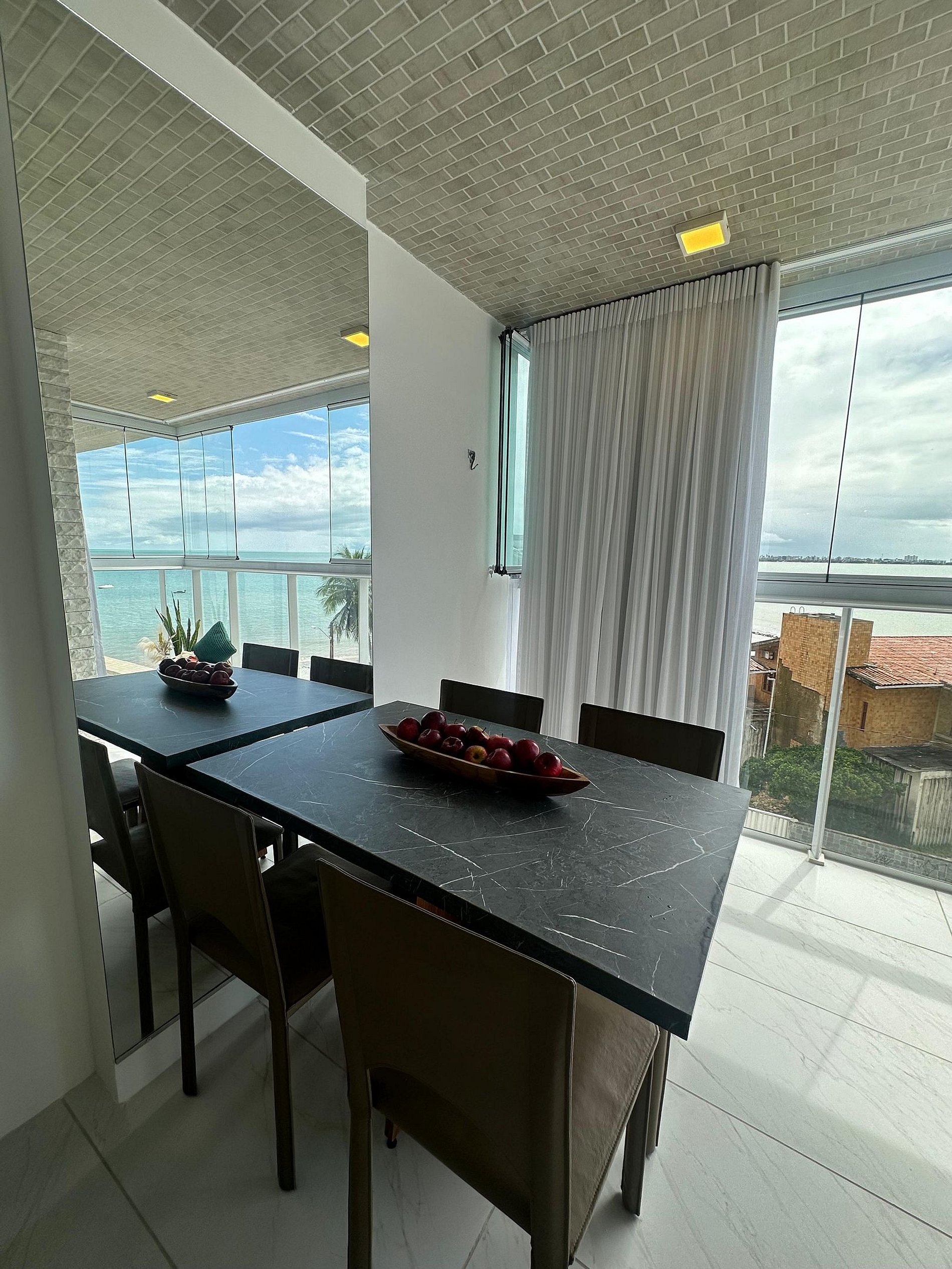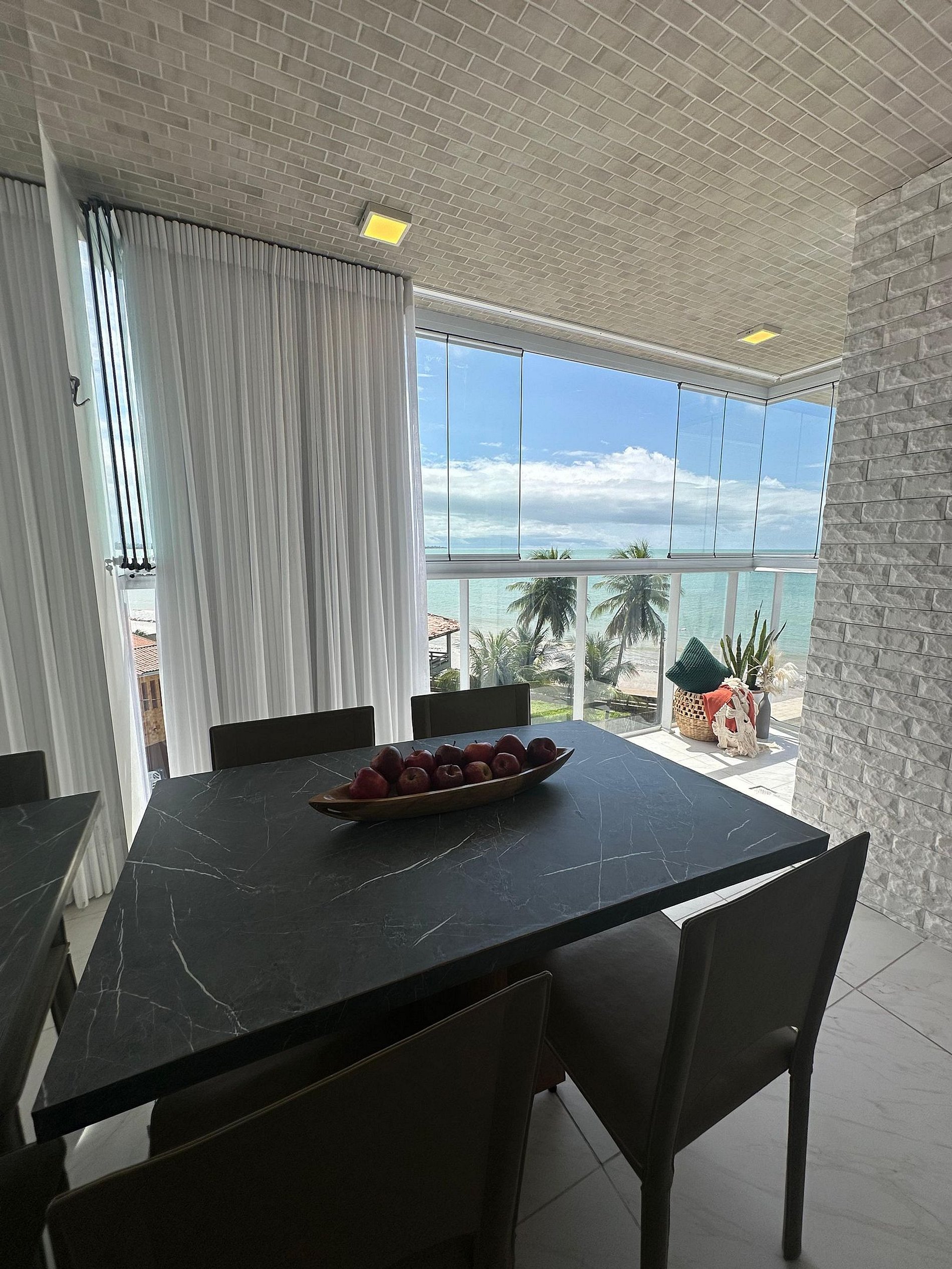 . Varanda fechada em vidro, com uma mesa charmosa e uma vista deslumbrante da praia – perfeita para um vinho ao pôr do sol ou um café olhando o mar.