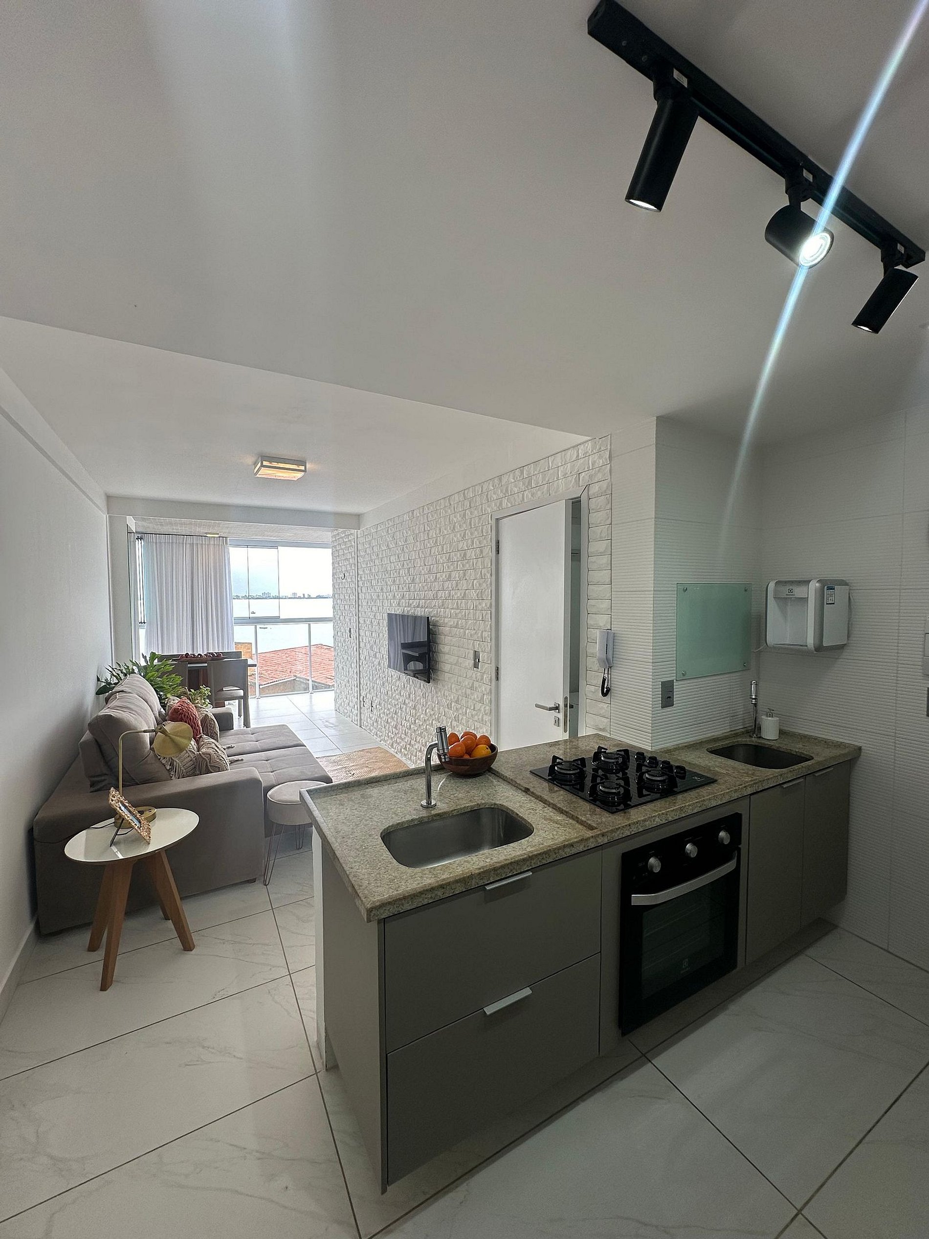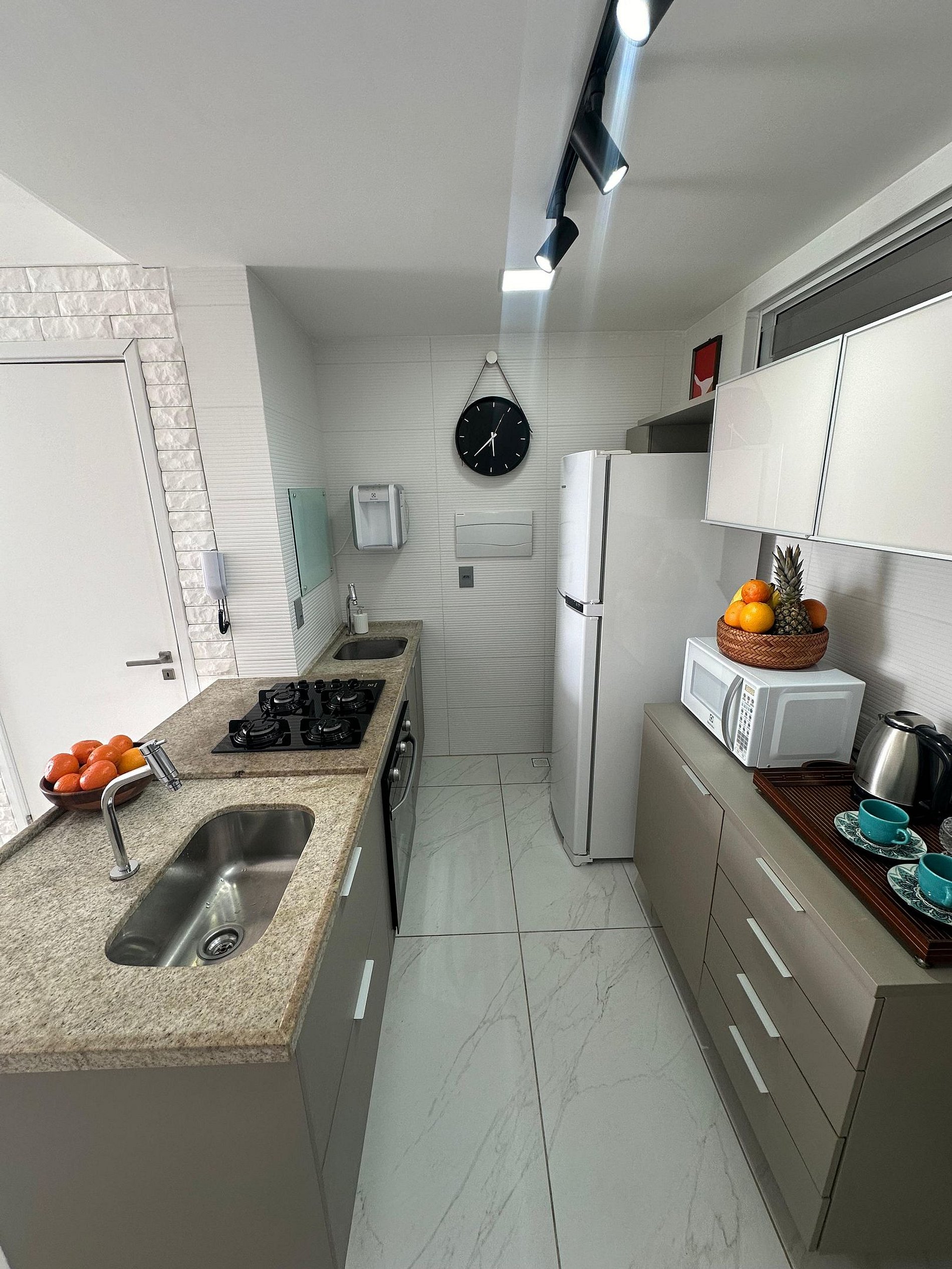 . Cozinha completa, moderna e funcional, equipada com fogão, geladeira, micro-ondas e utensílios para você preparar desde um café da manhã rápido até aquele jantar especial.