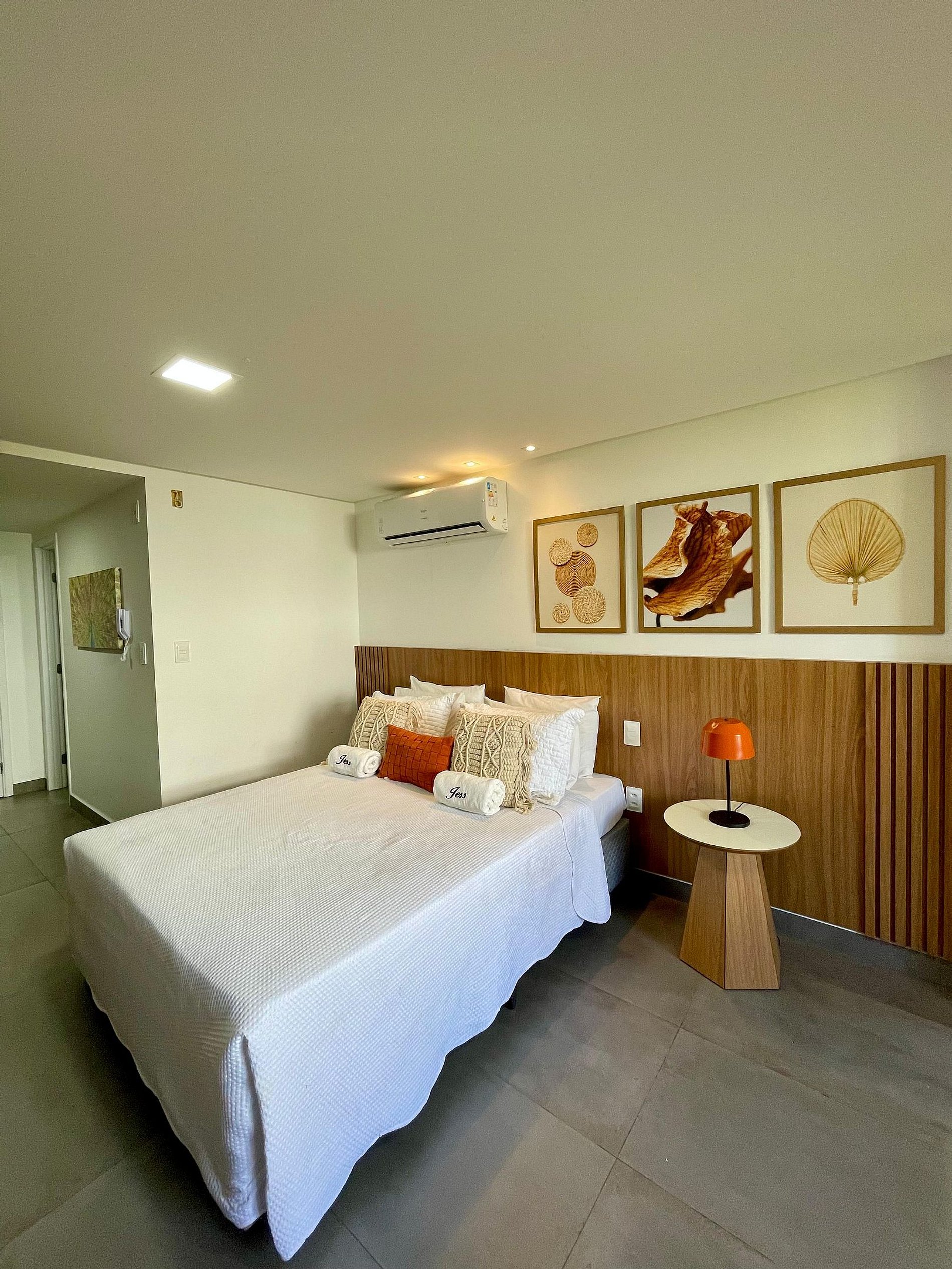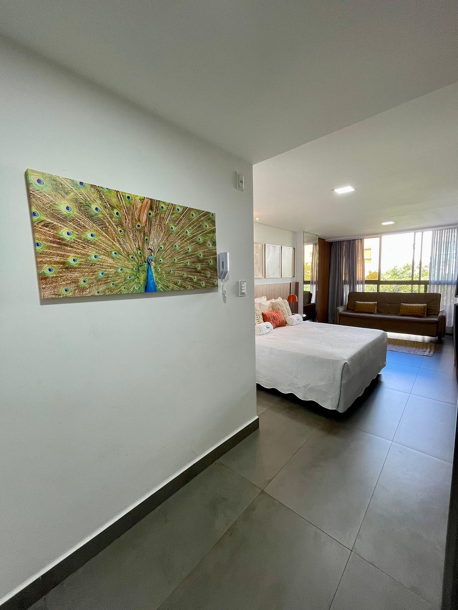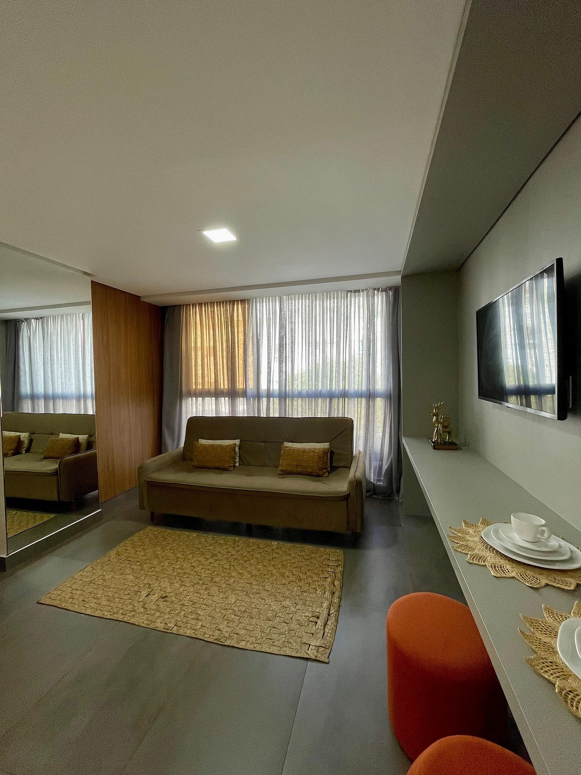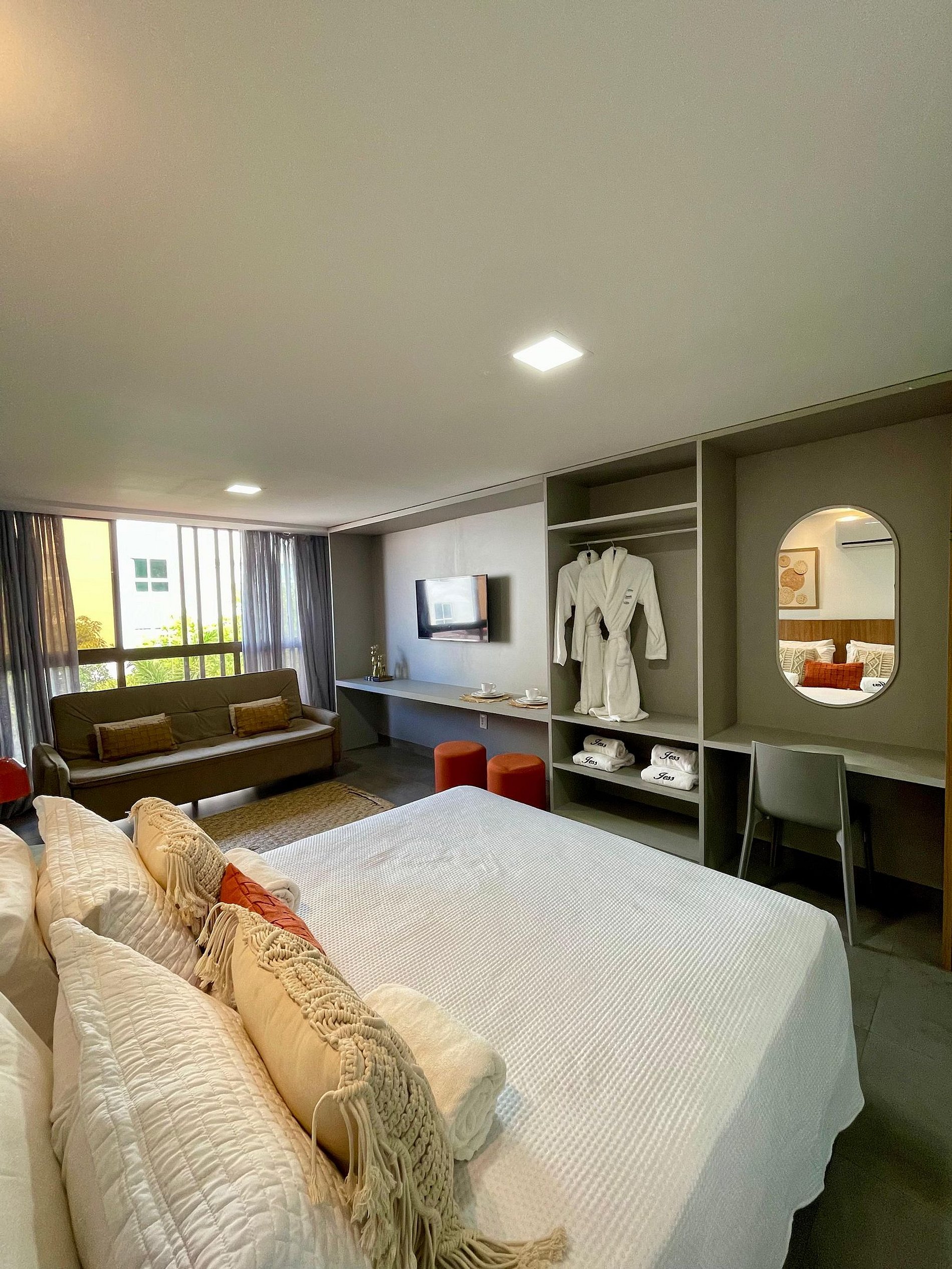 - O flat é super funcional com uma cama queen e sofá cama, guarda-roupa, mesa de apoio.