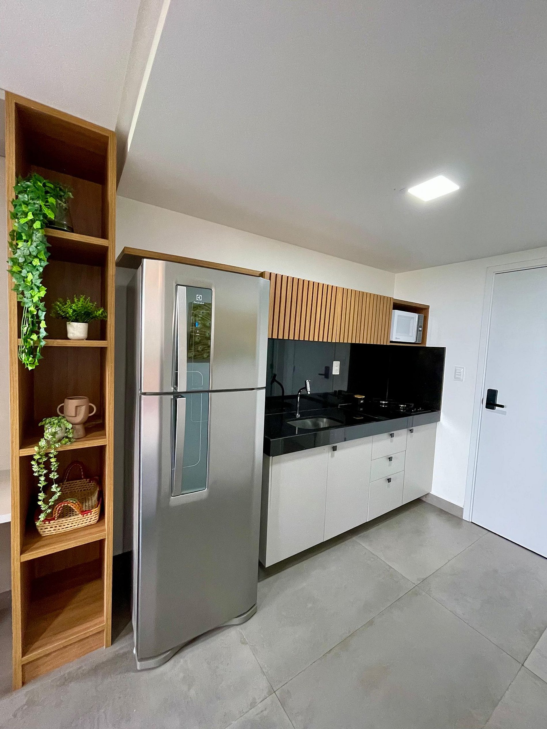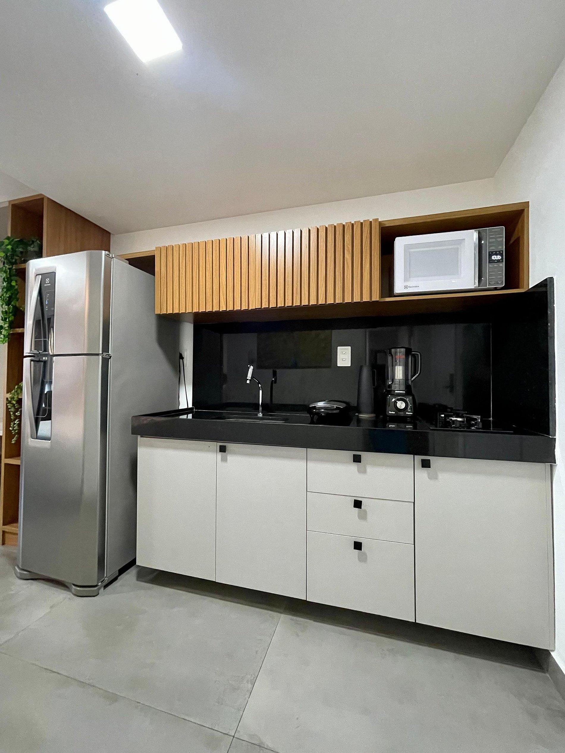 - A cozinha com todos os utensílios, louças charmosas, cafeteira elétrica, cooktop, micro-ondas etc.