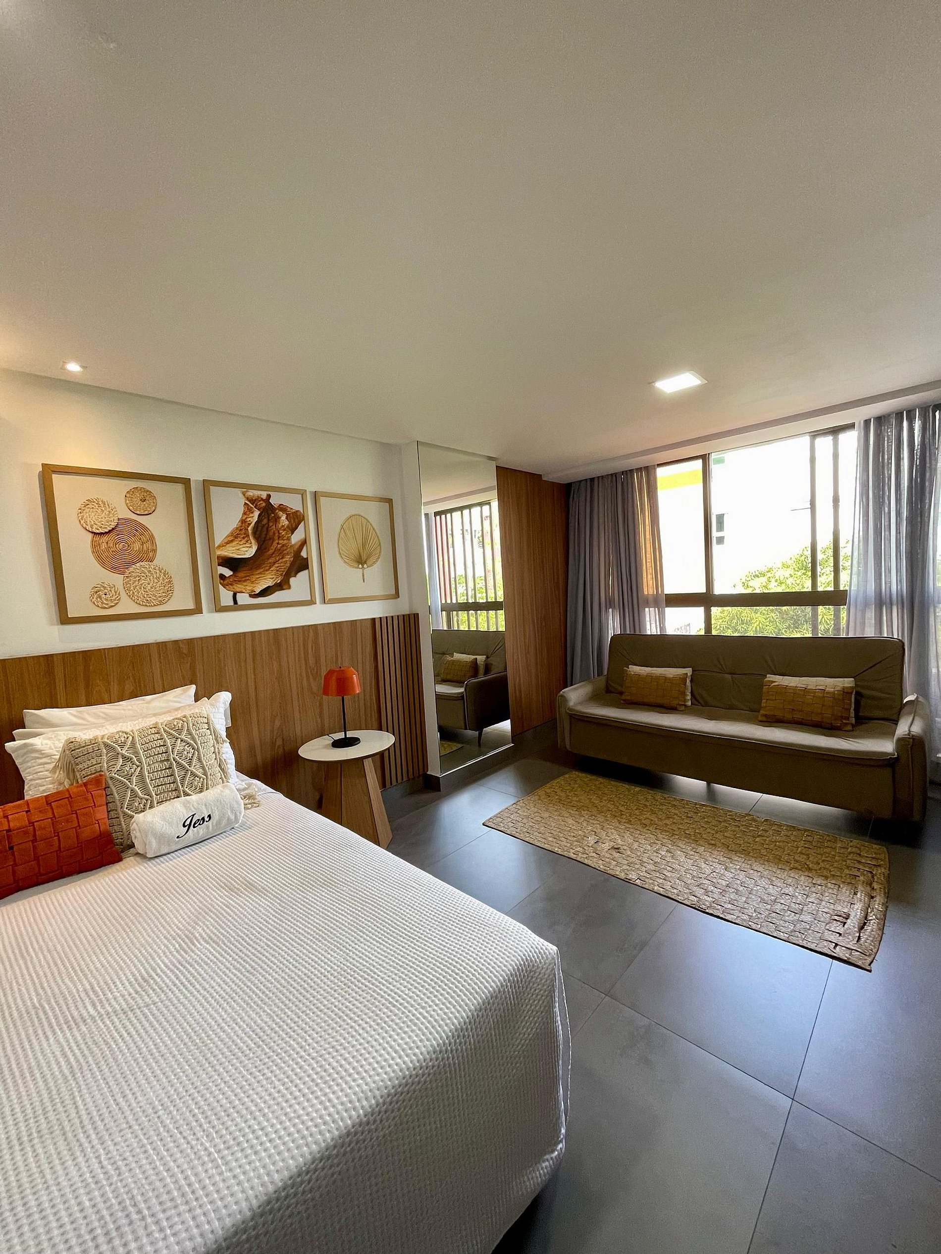 - O flat é super funcional com uma cama queen e sofá cama, guarda-roupa, mesa de apoio.