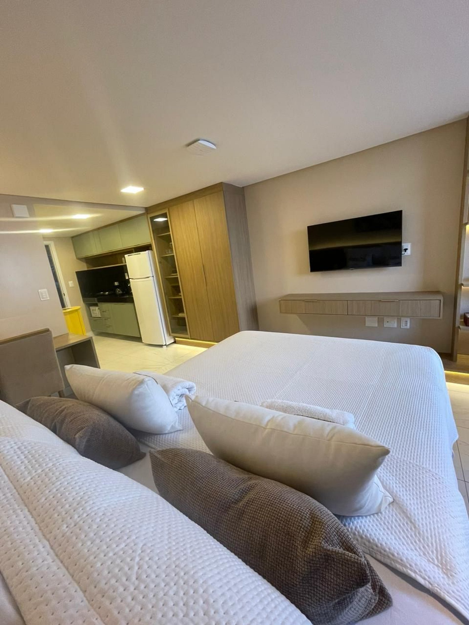 - O flat é super funcional com uma cama queen, colchão de solteiro, guarda-roupa, mesa de apoio.