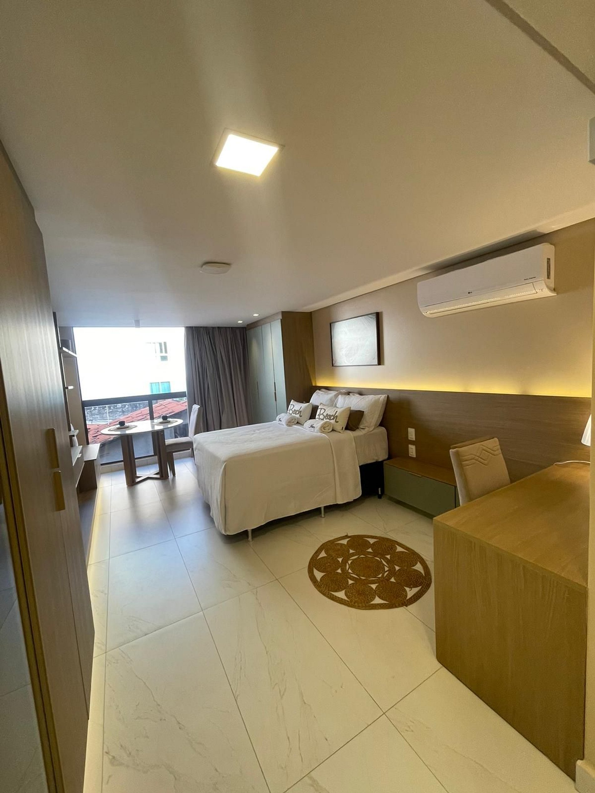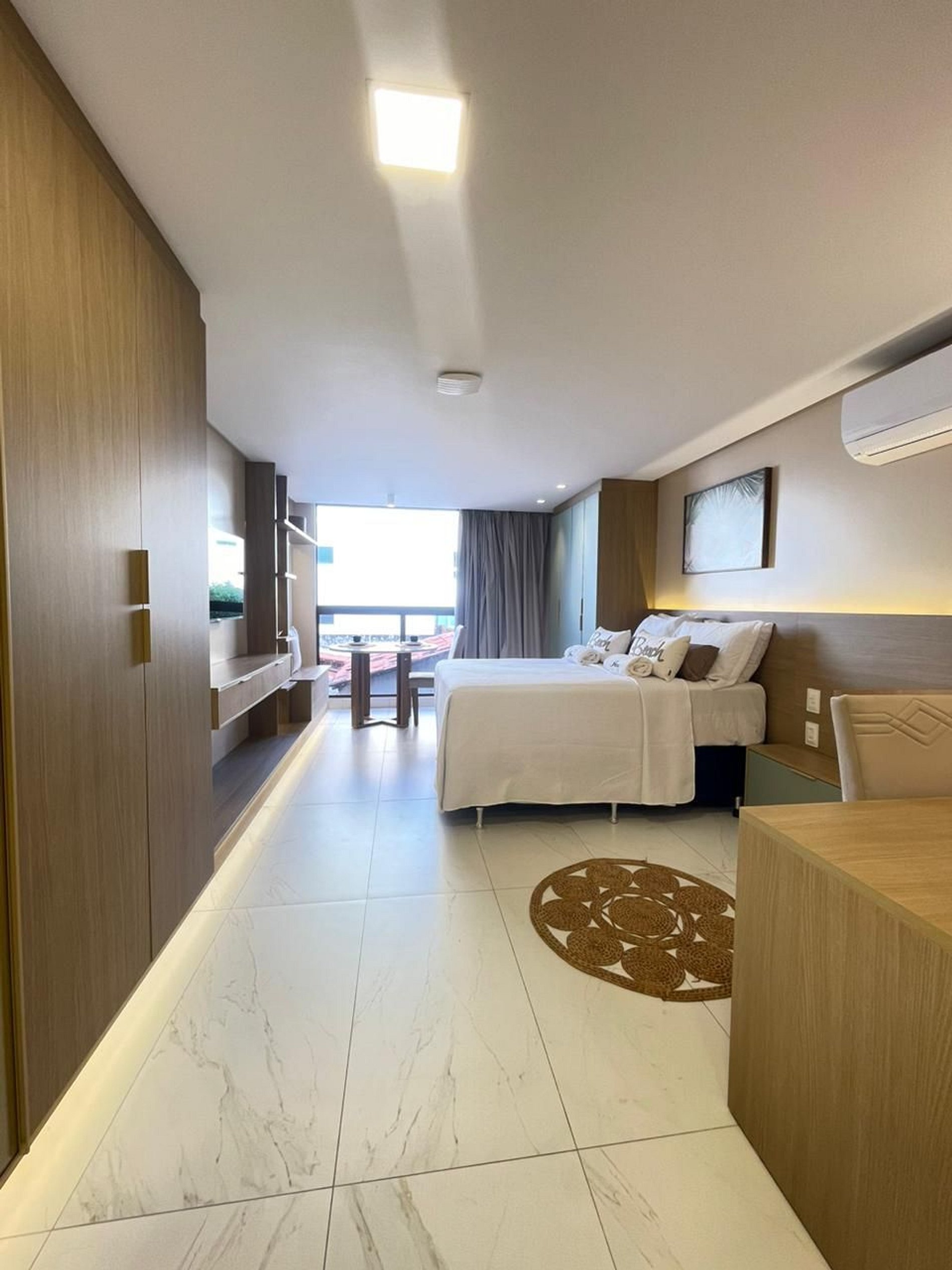- O flat é super funcional com uma cama queen, colchão de solteiro, guarda-roupa, mesa de apoio.
