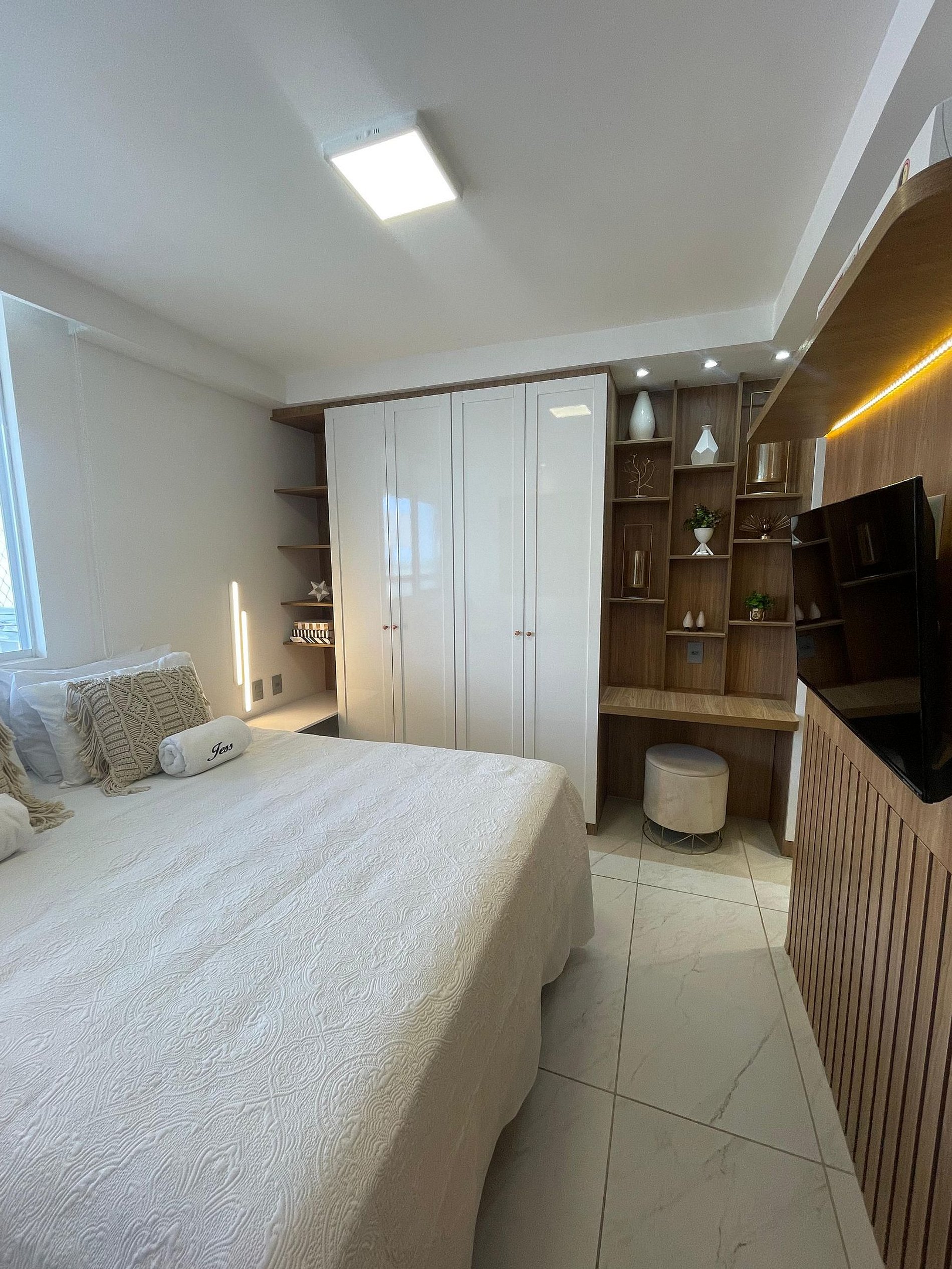 A suíte principal possui cama queen, TV e armários amplos para maior comodidade.