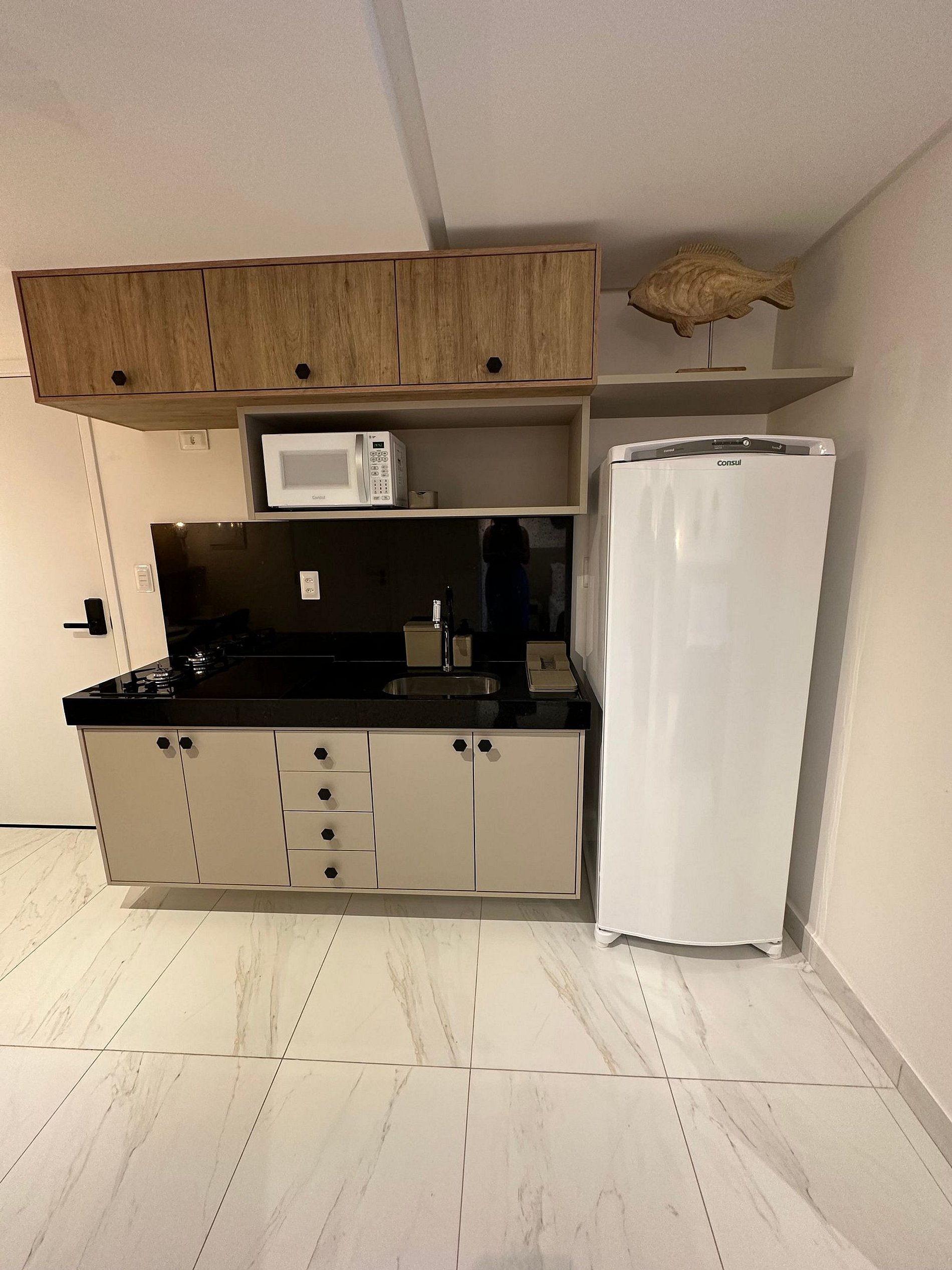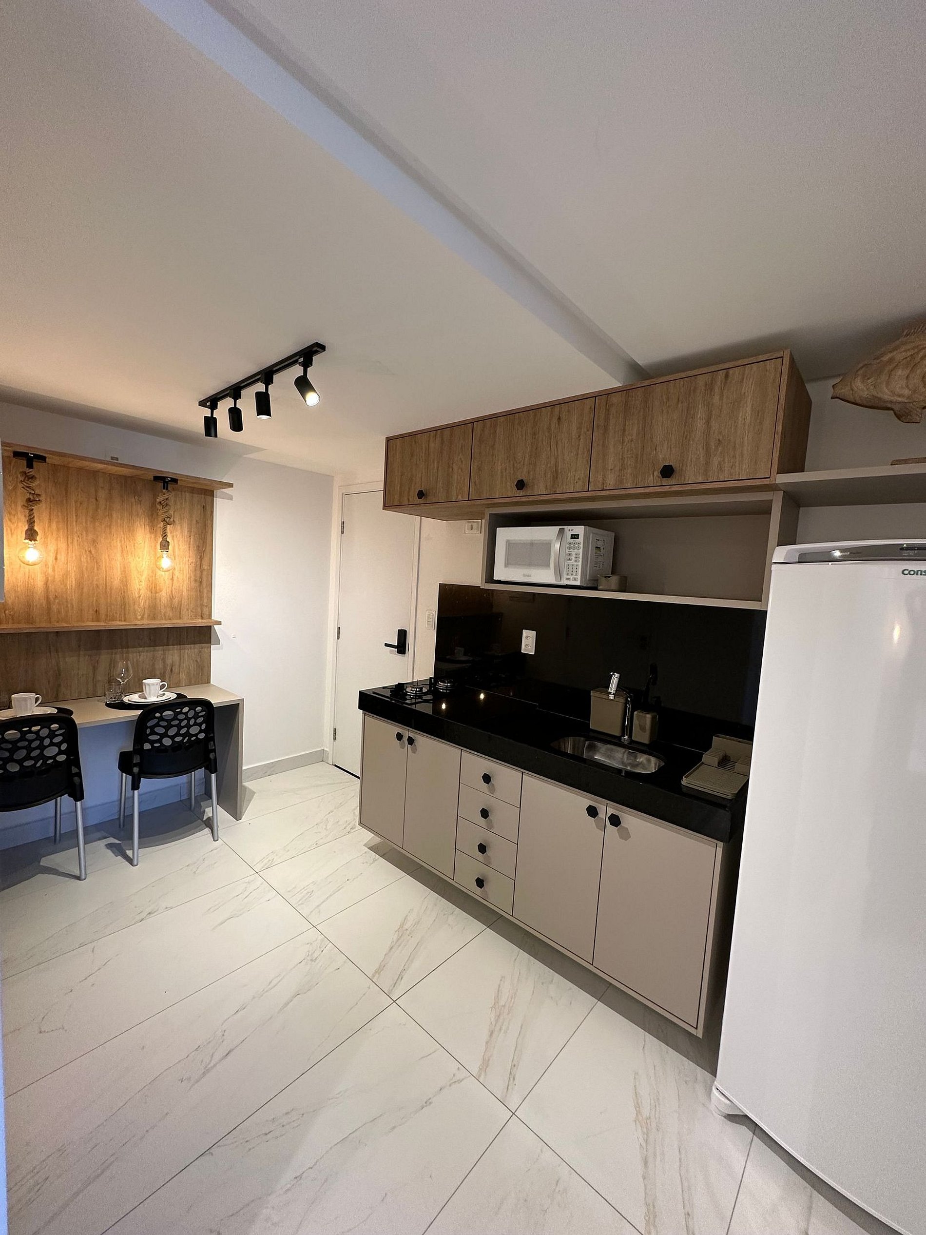 - A cozinha com todos os utensílios, louças charmosas, cafeteira elétrica, cooktop, micro-ondas etc.