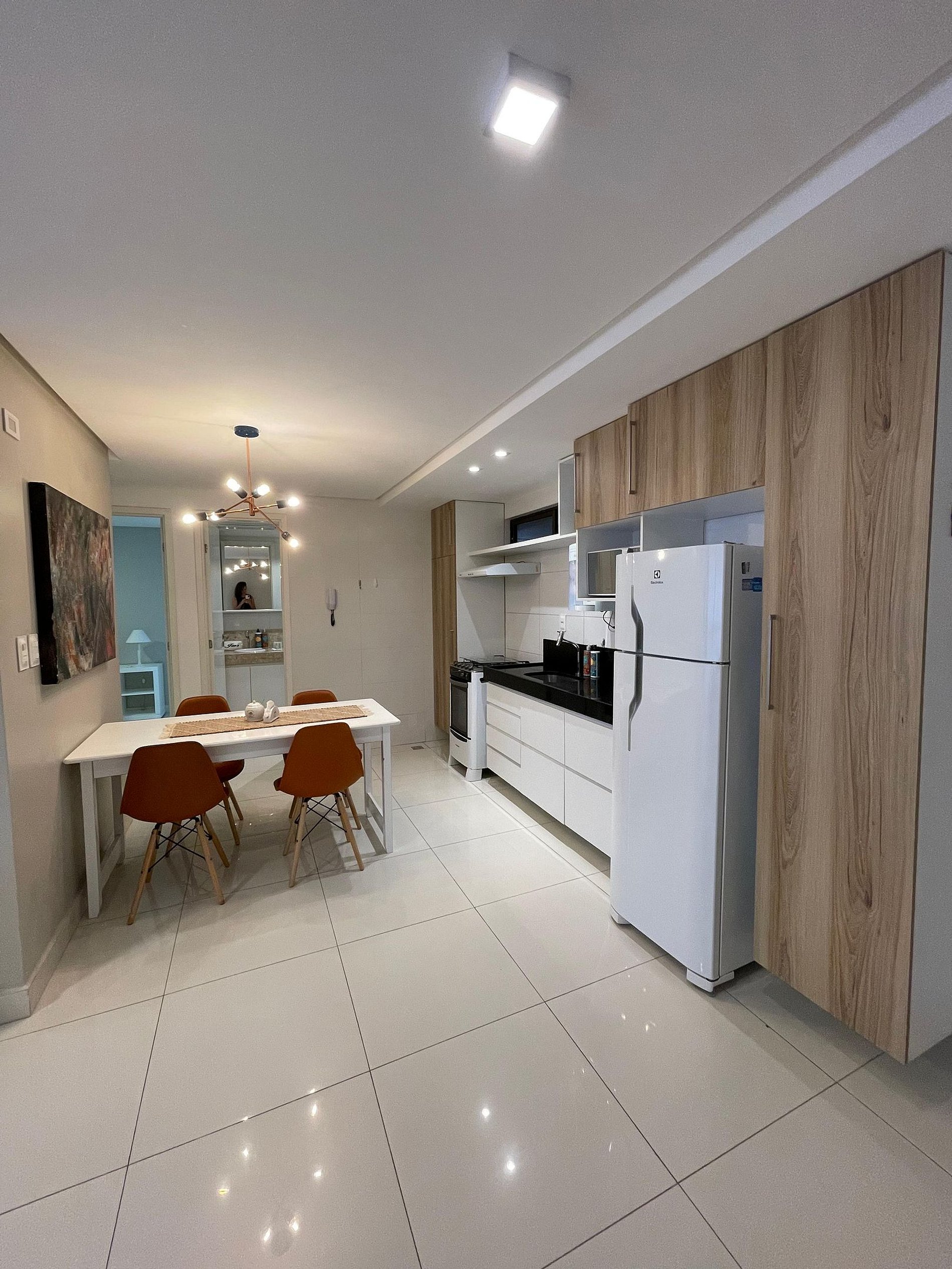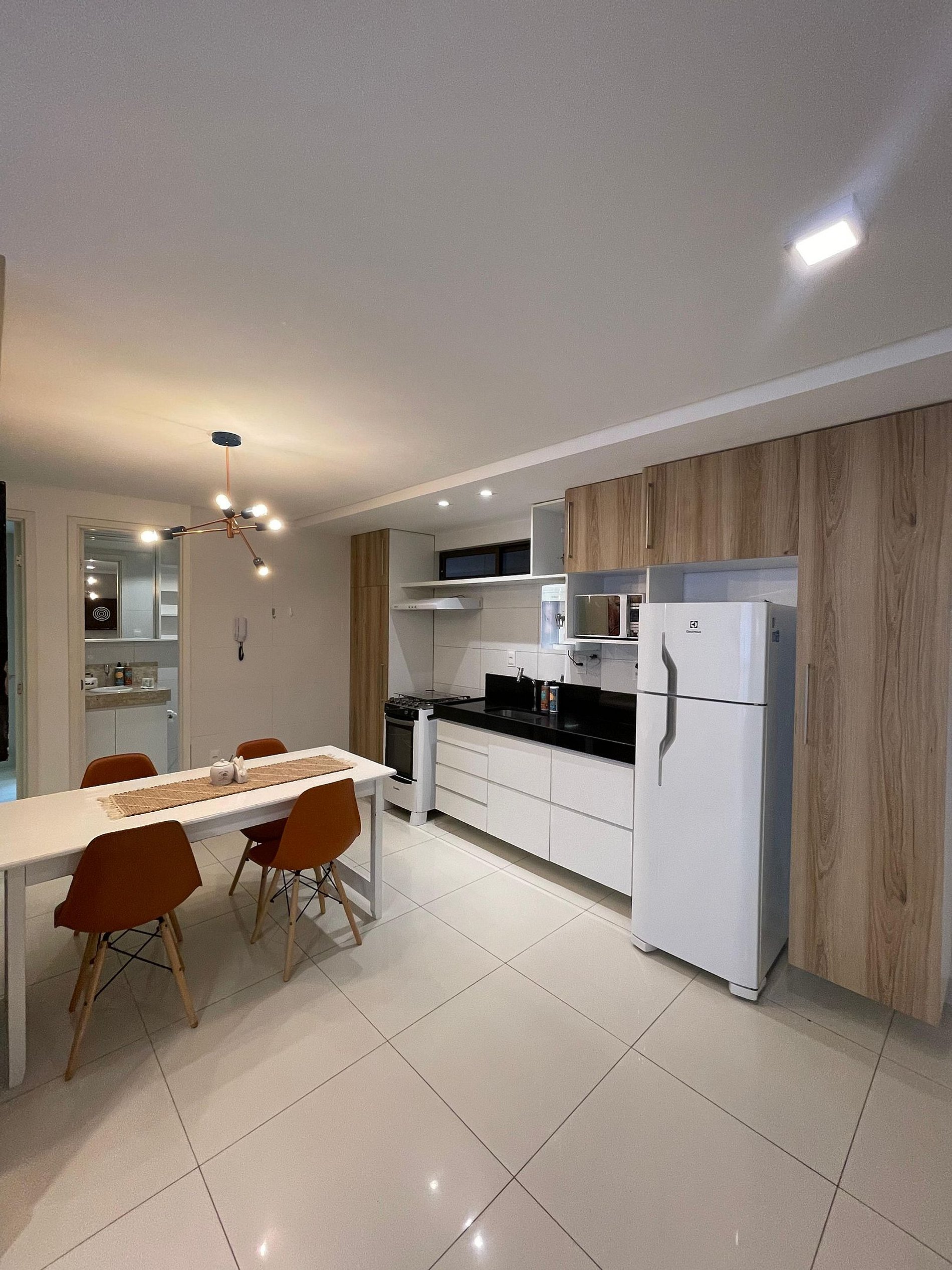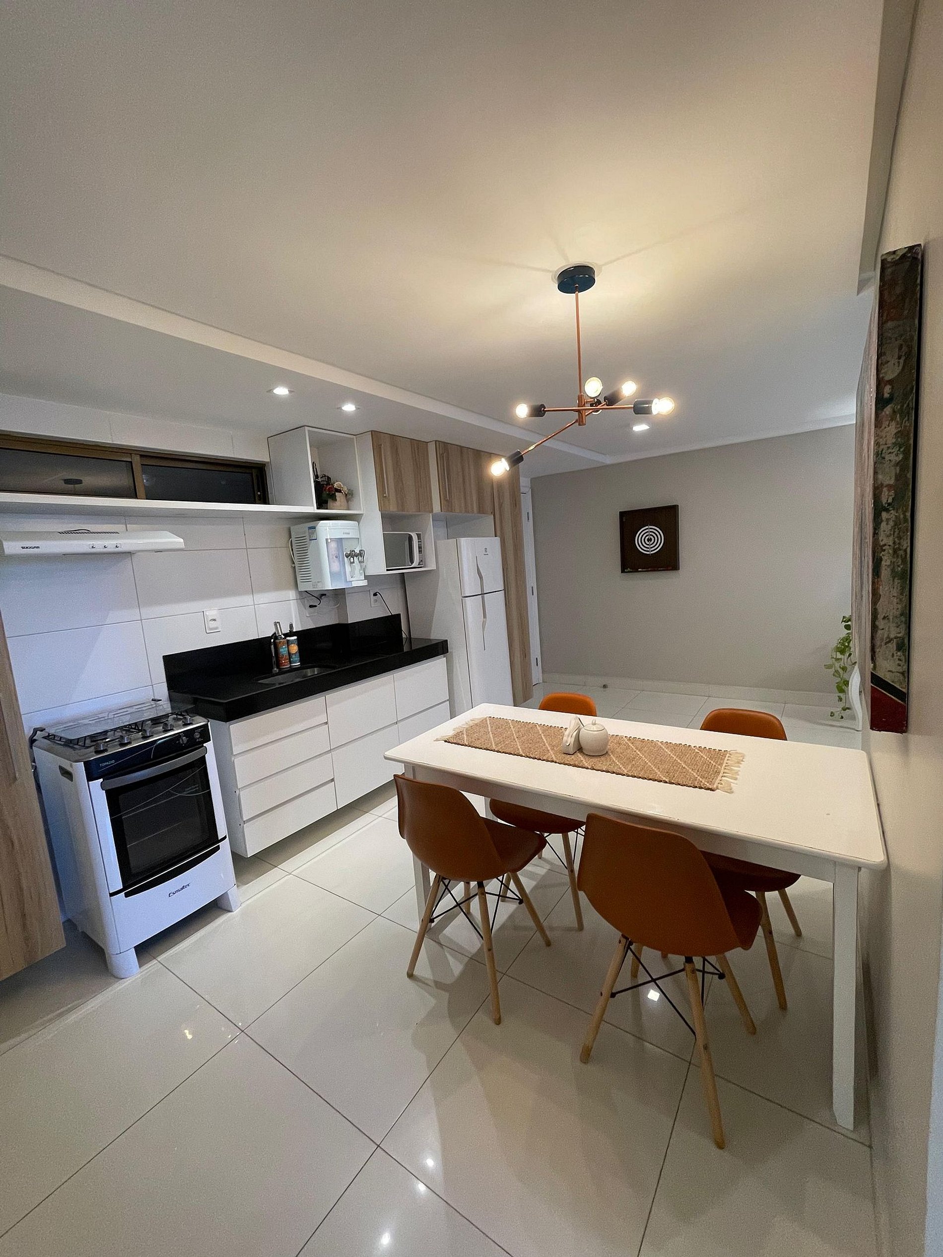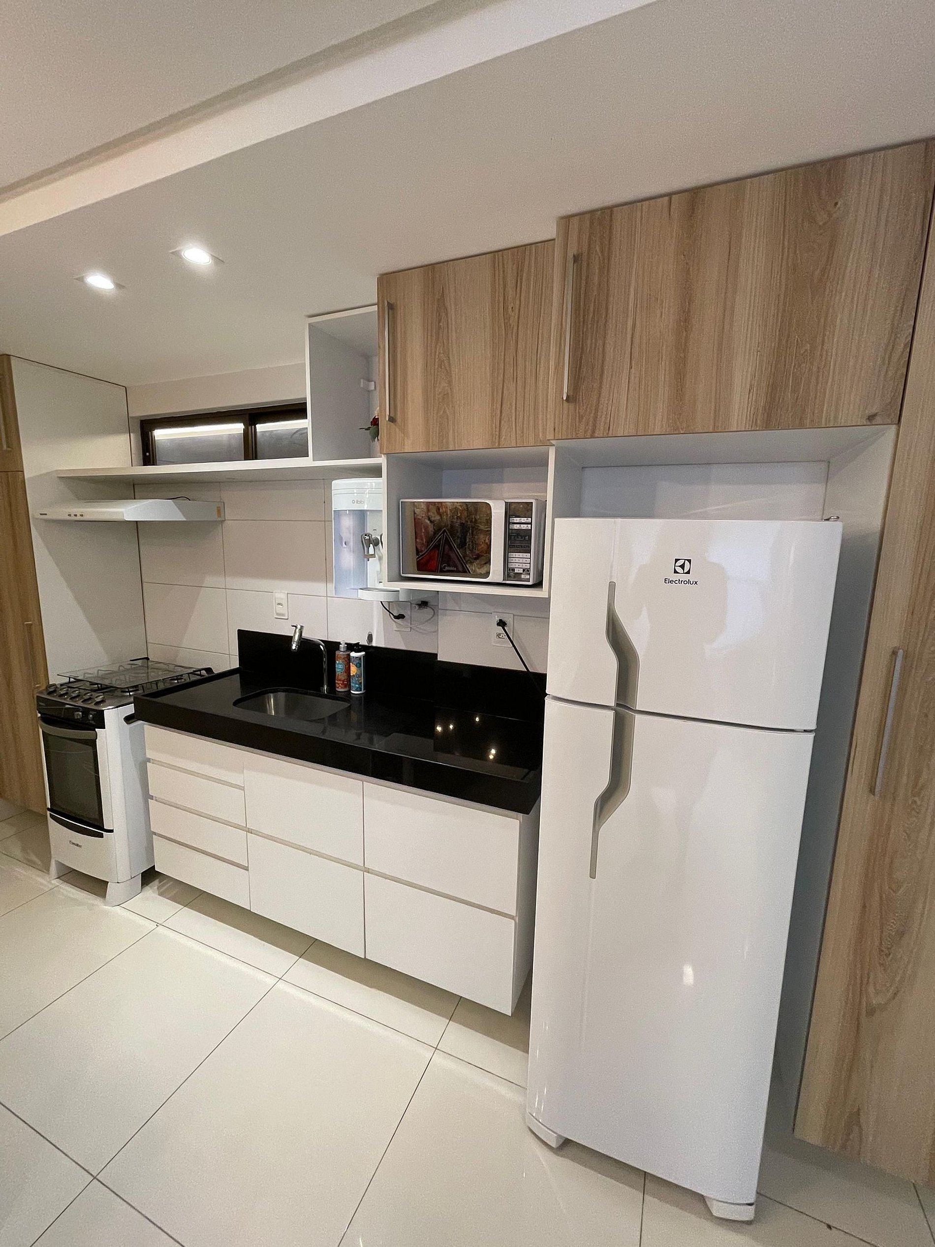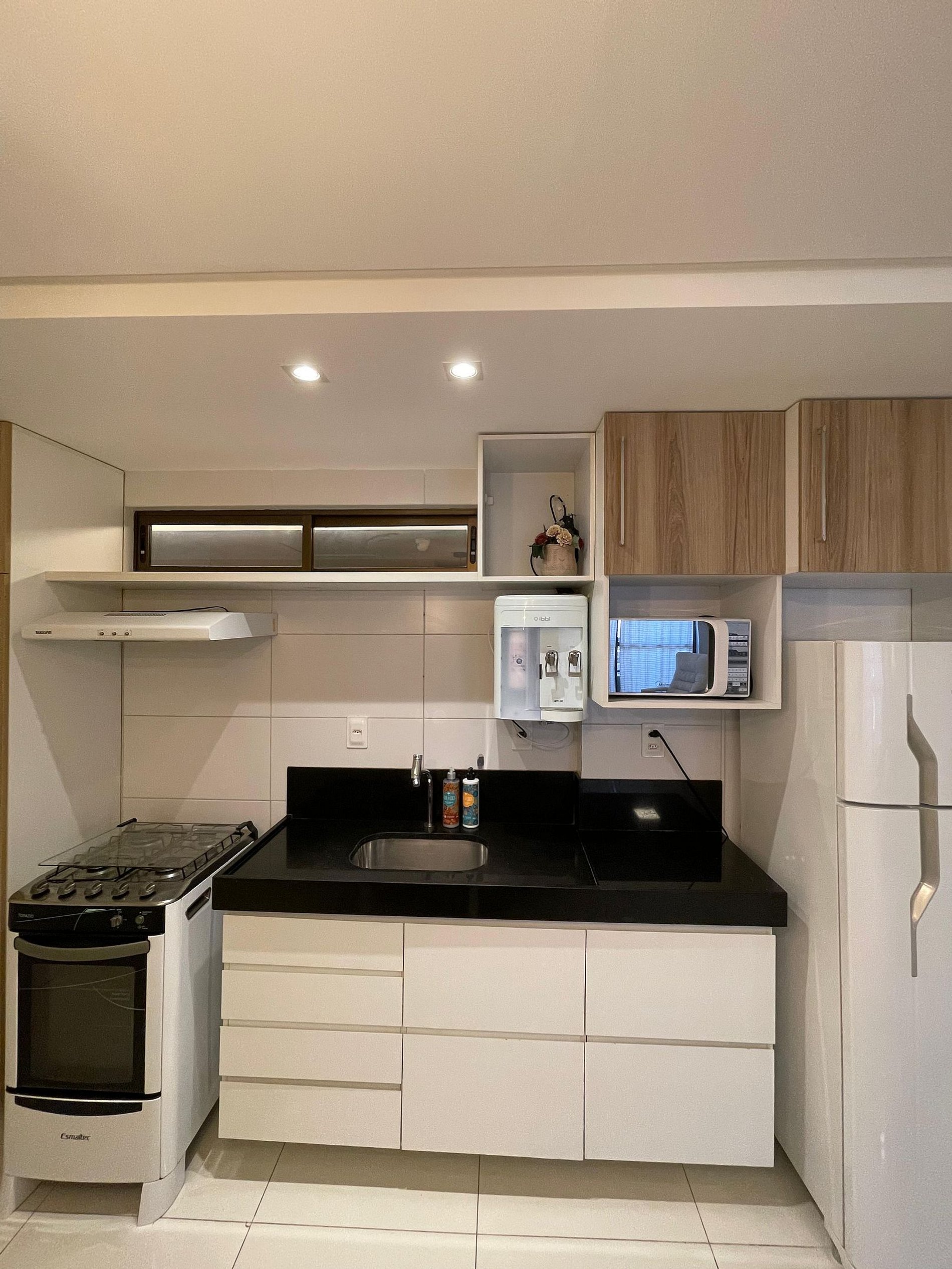 A cozinha está equipada com geladeira, fogão, micro-ondas, filtro de água e os utensílios básicos para o preparo de refeições. Um ambiente pensado para quem gosta de praticidade no dia a dia, seja para um café da manhã rápido ou um jantar tranquilo.