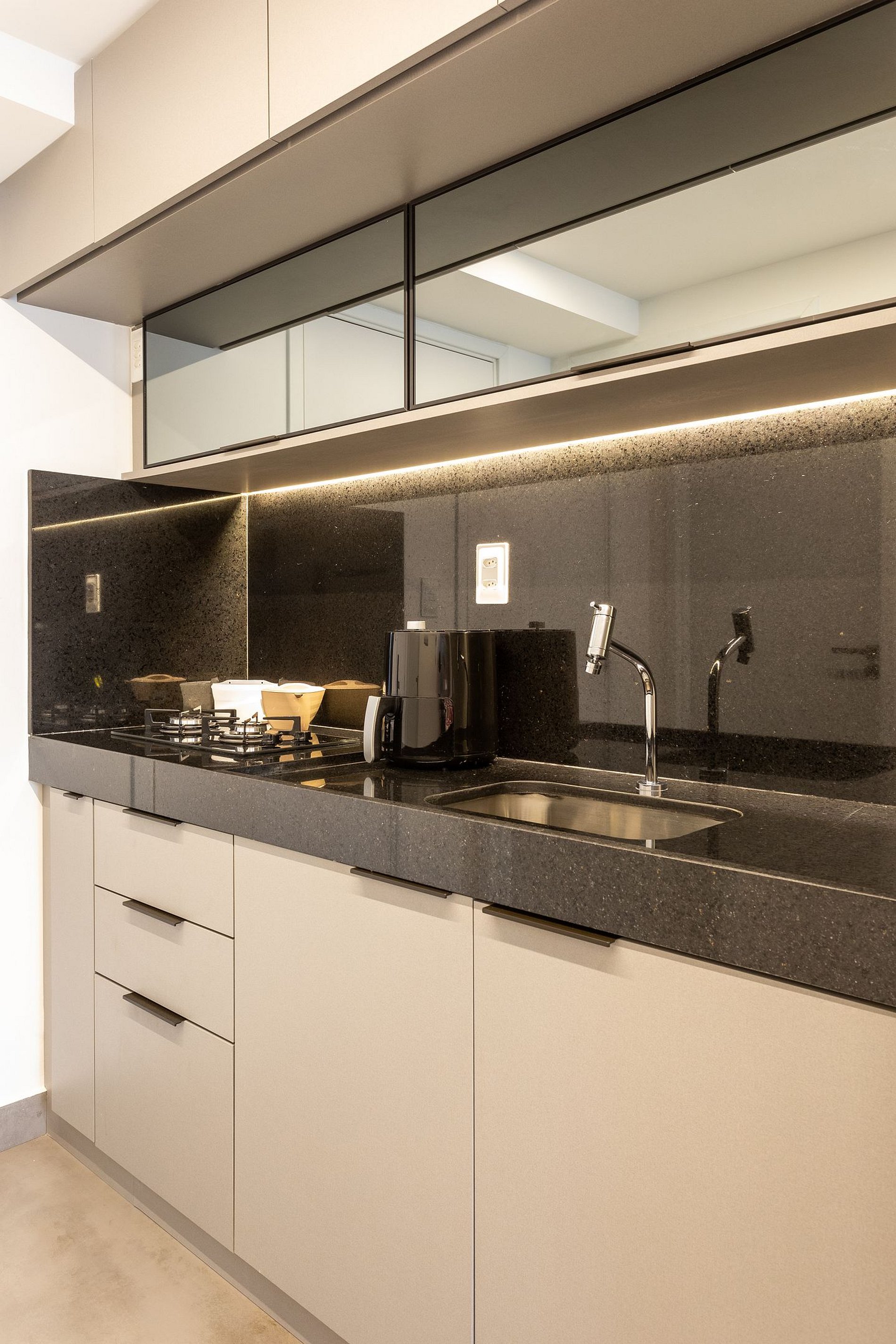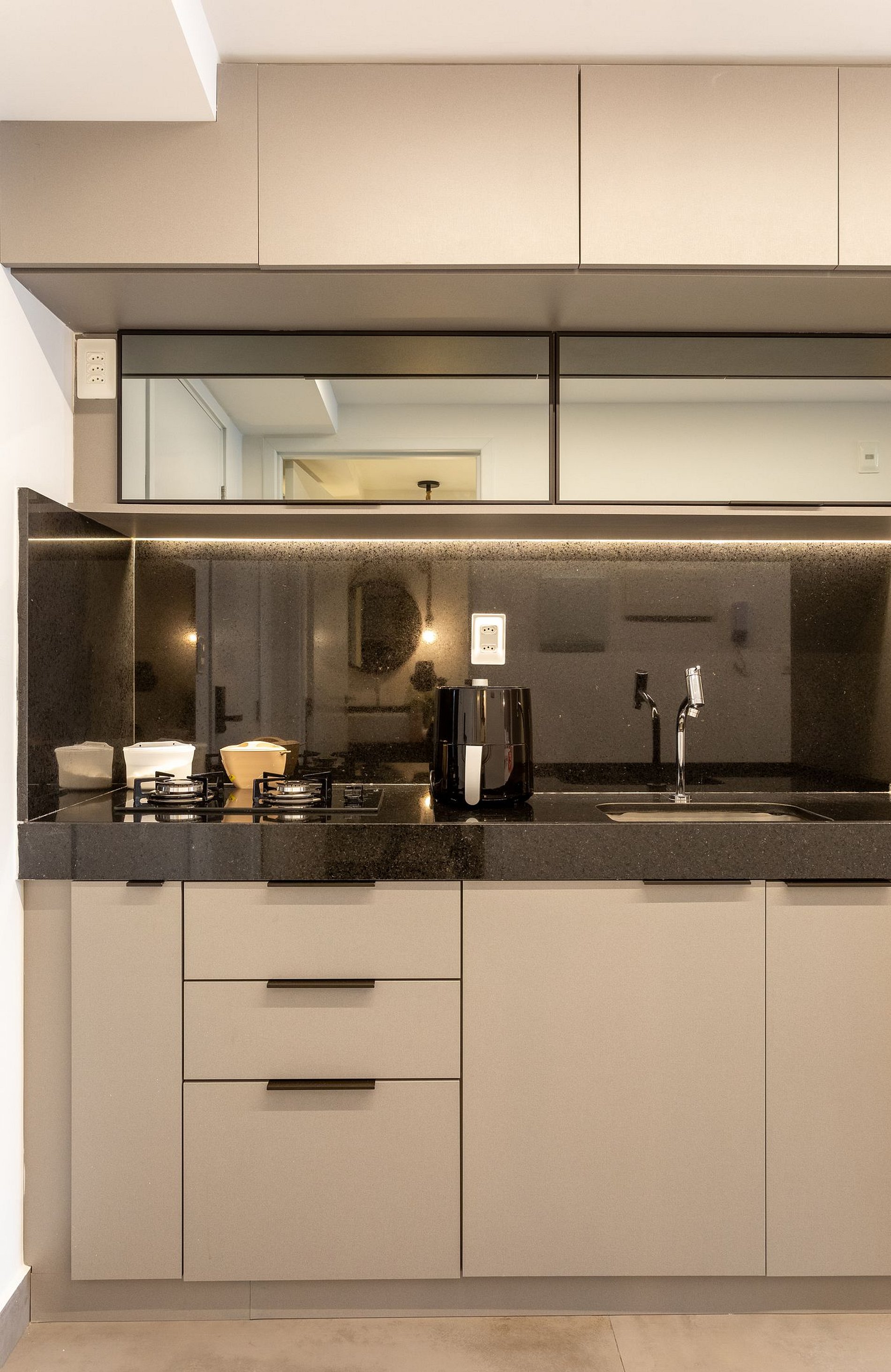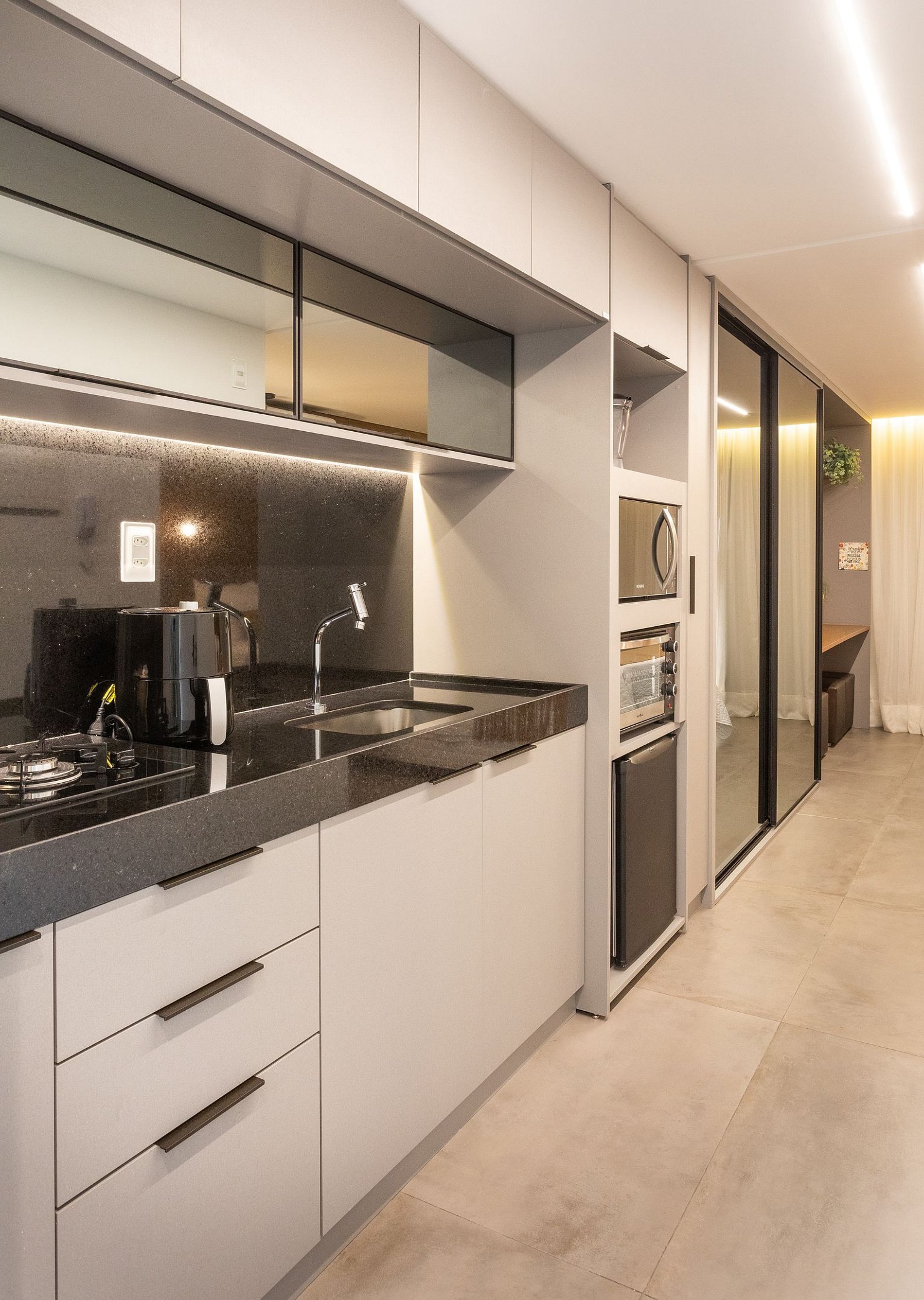 - A cozinha com todos os utensílios, louças charmosas, cafeteira elétrica, cooktop, micro-ondas etc.