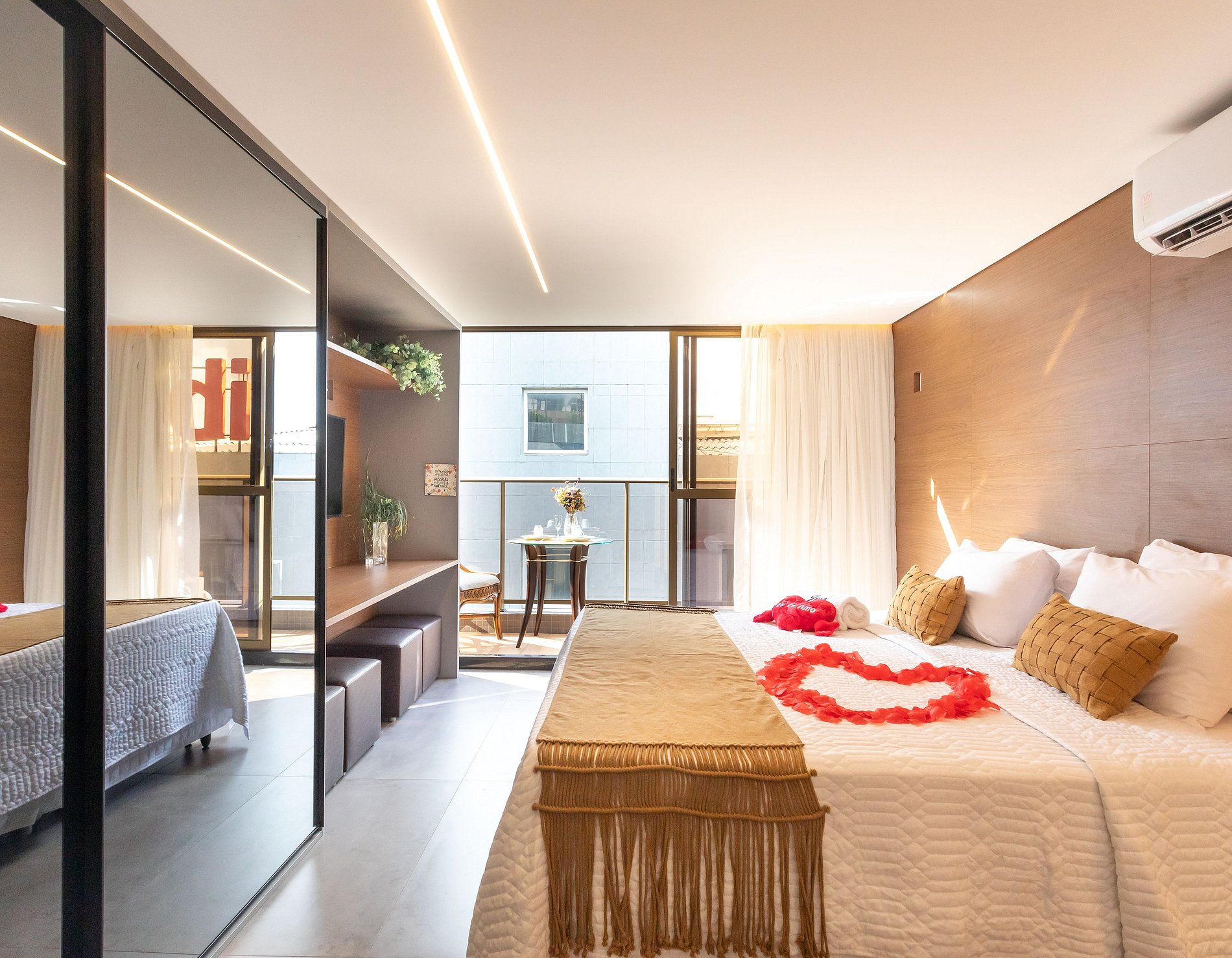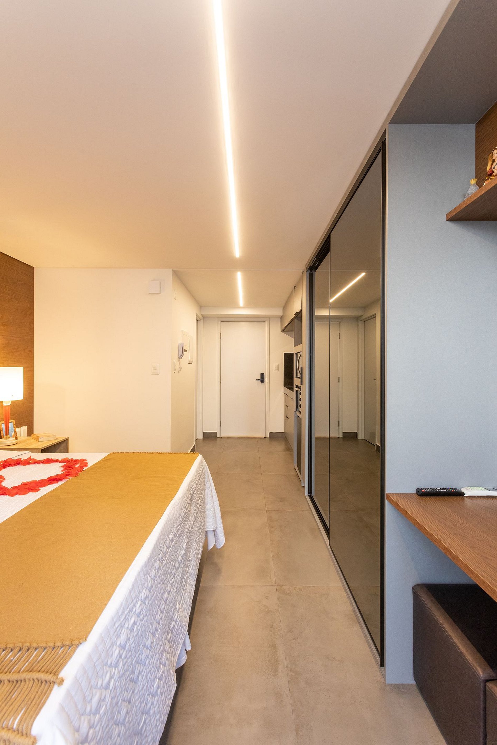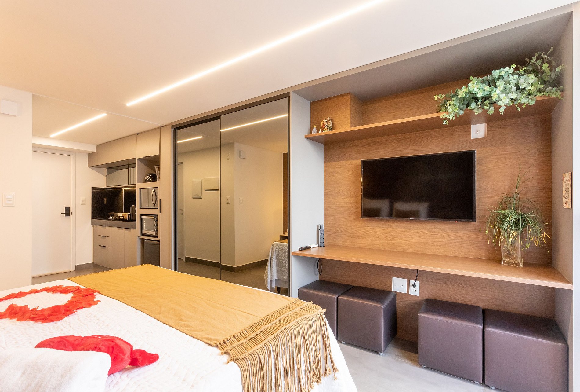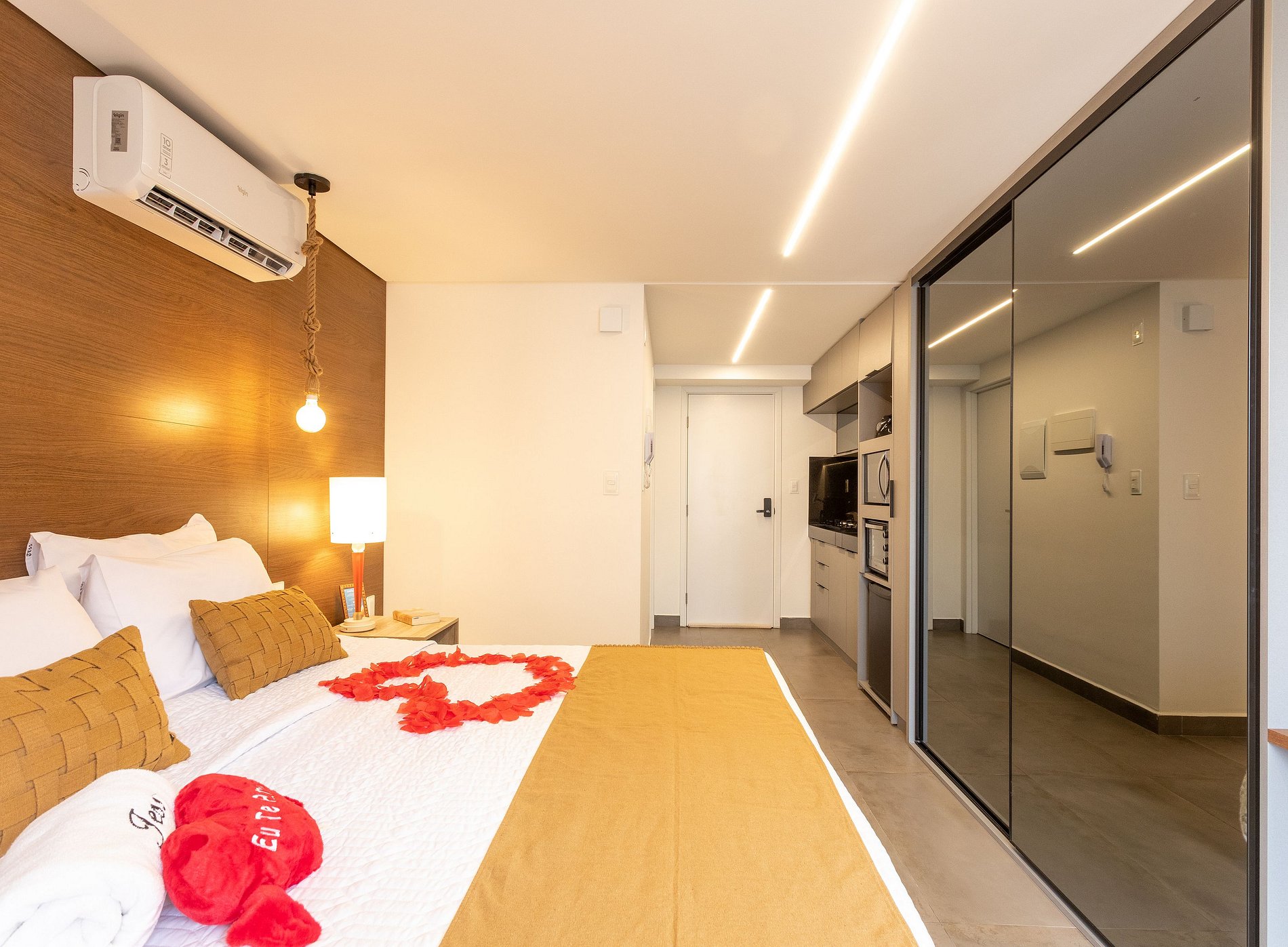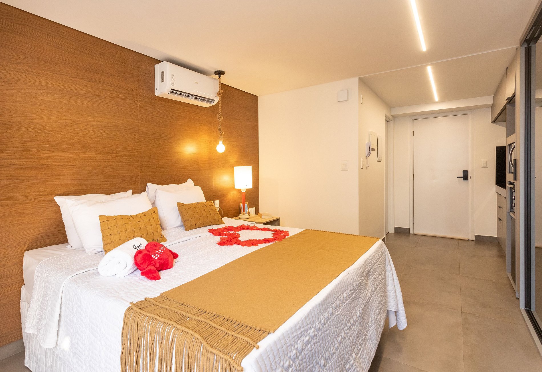 - O flat é super funcional com uma cama queen, guarda-roupa, mesa de apoio.