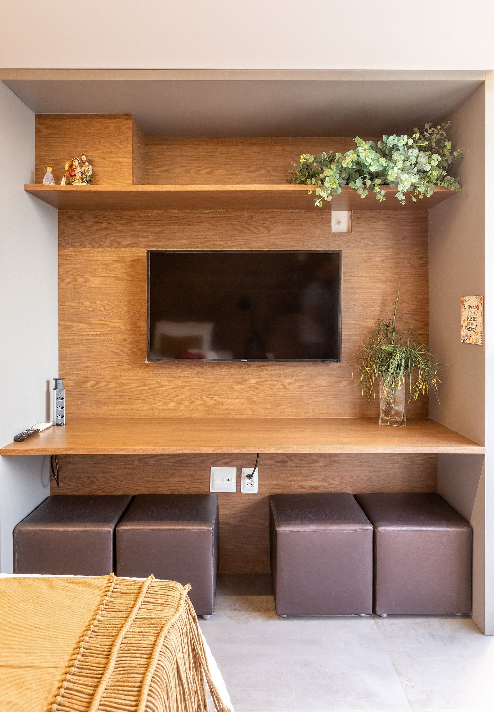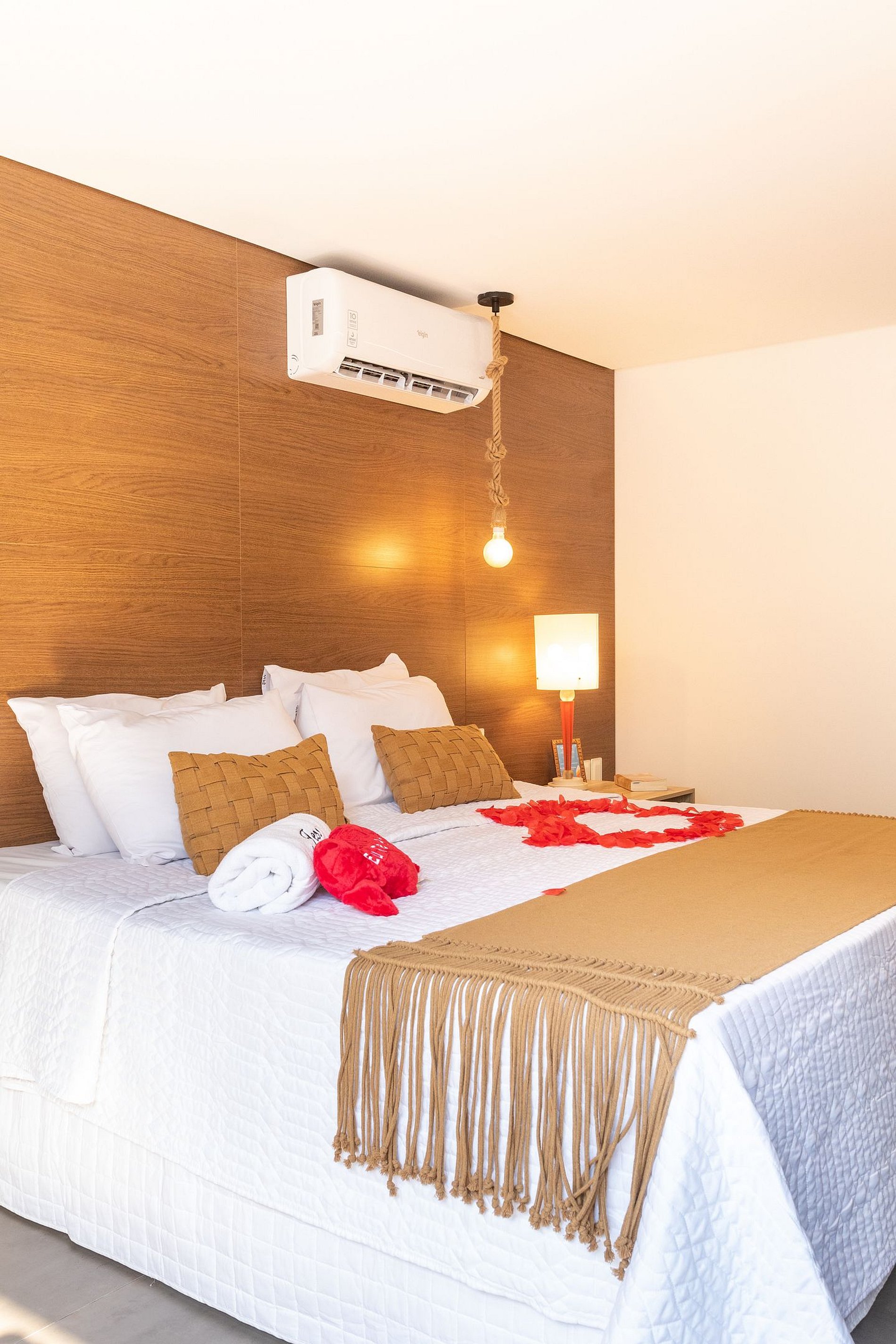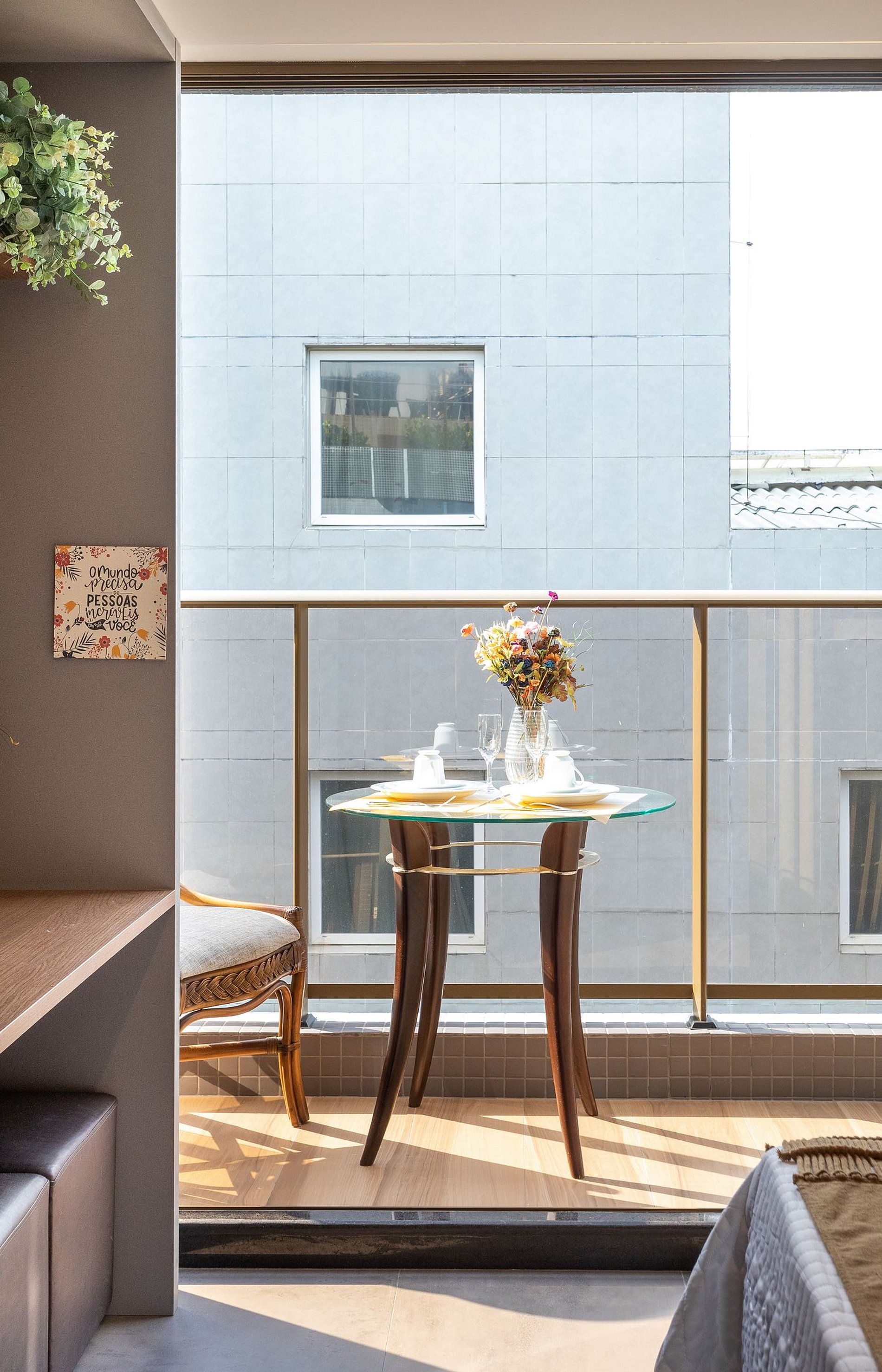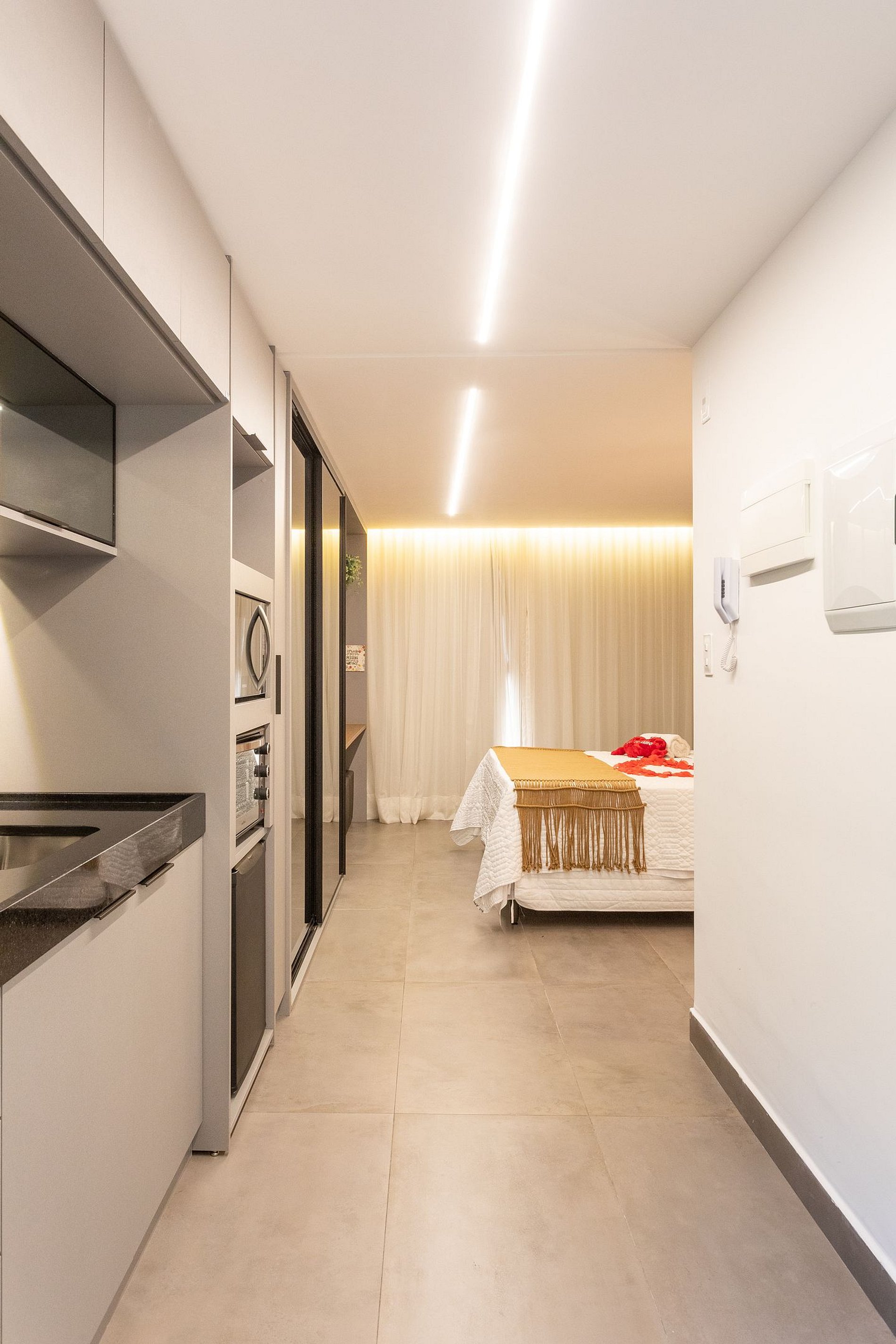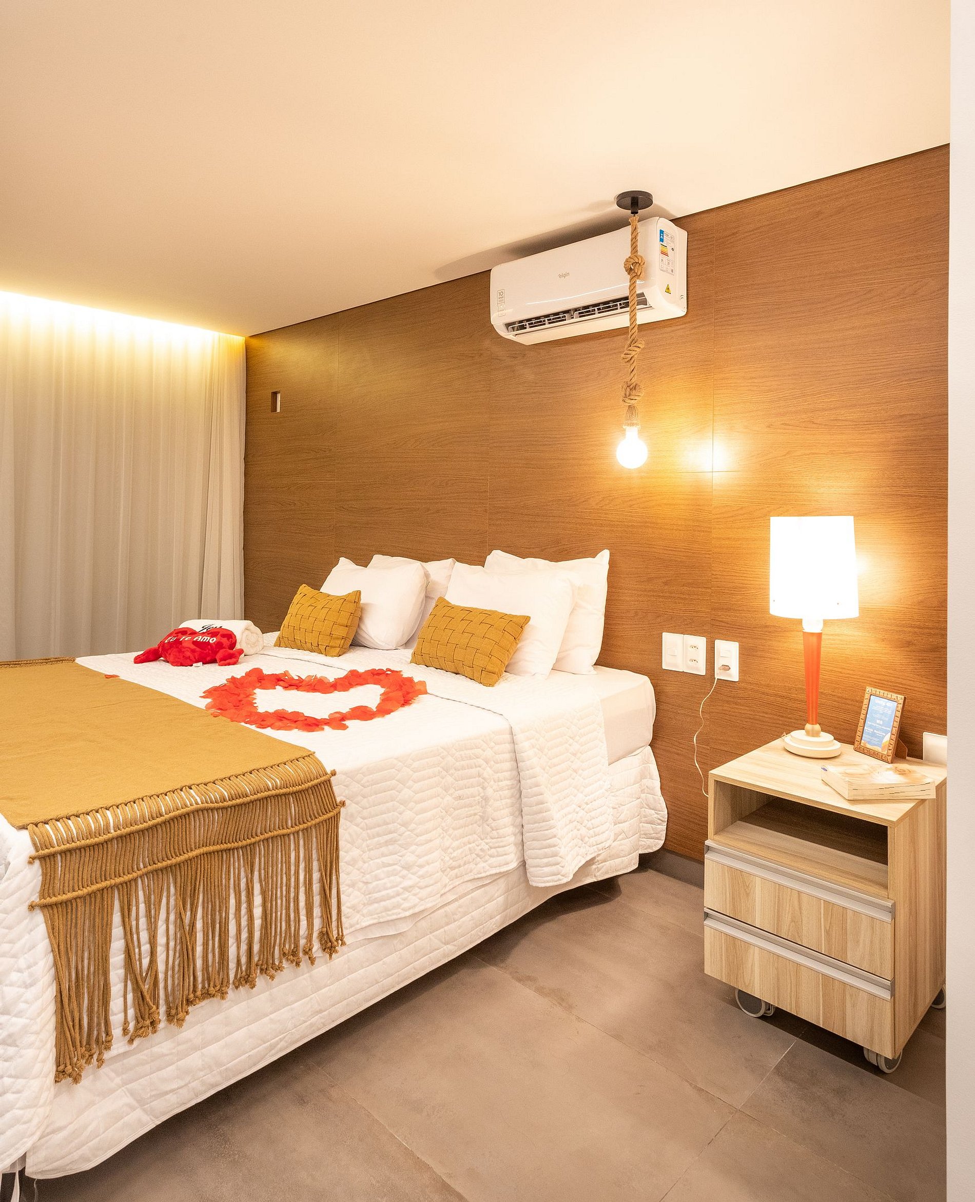 - O flat é super funcional com uma cama queen, guarda-roupa, mesa de apoio.